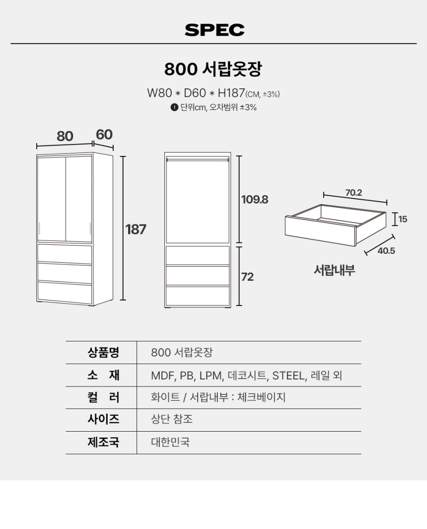 3. 800슬라이딩 서랍옷장 [판매가 215,000 ➡️ 109,000원]