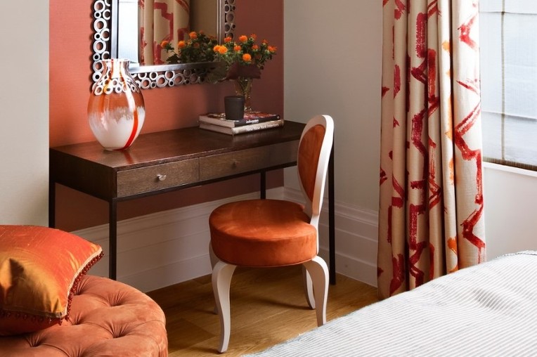 우드 컬러와 우아하고 화사한 느낌의 패브릭 패턴, 심플하지만 라인이