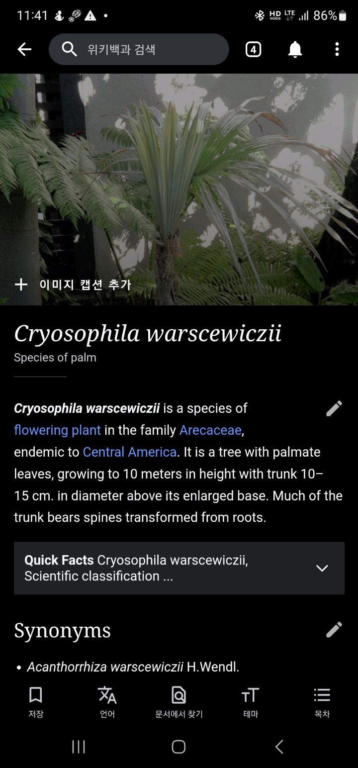 Cryosophila warscewiczii is a species of flowering plant in the family Arecaceae, endemic to Central America. It is a tree with palmate leaves, growing to 10 meters in height with trunk 10–15 cm. in diameter above its enlarged base. Much of the trunk bears spines transformed from roots.