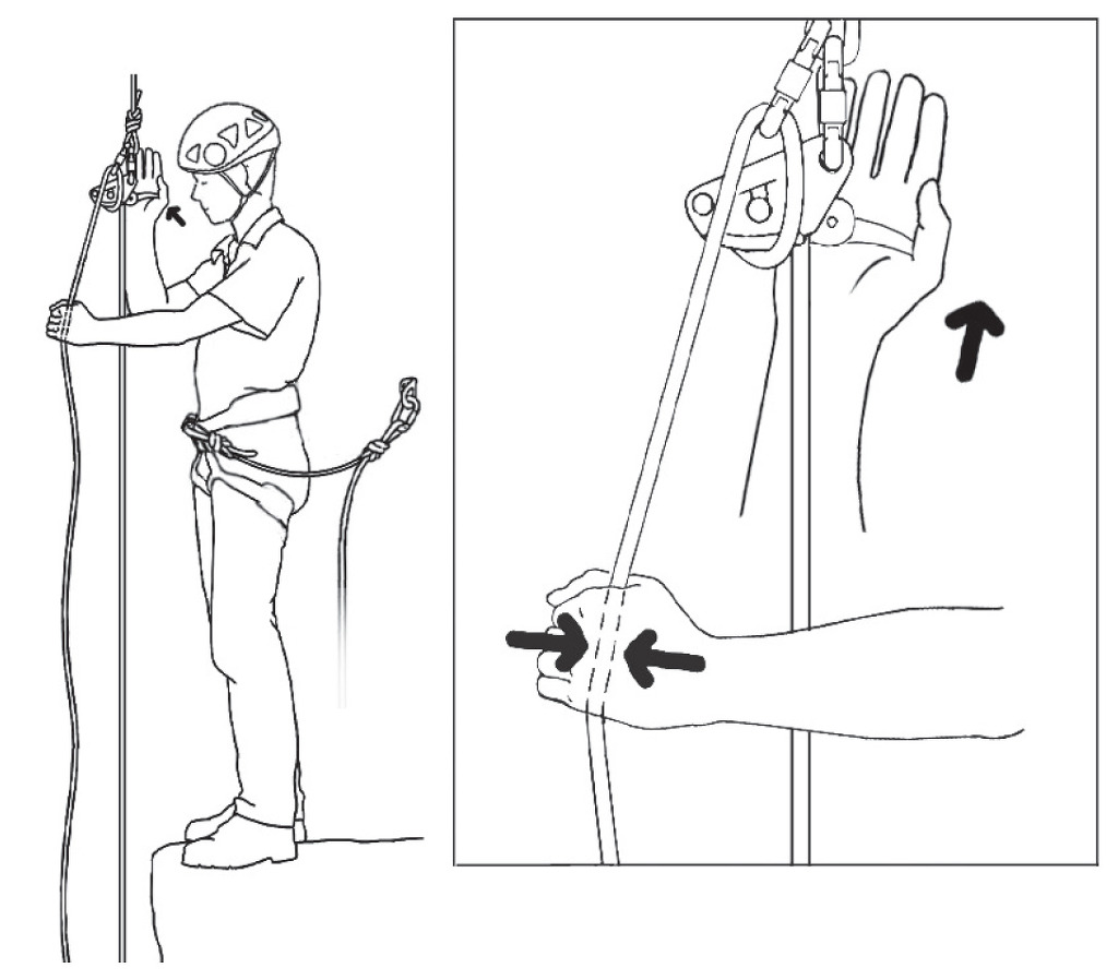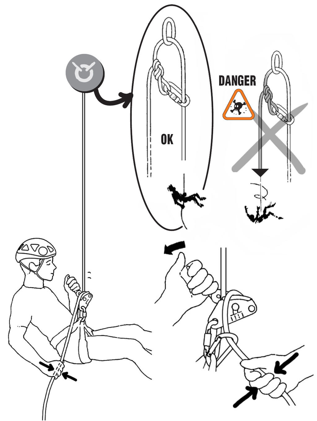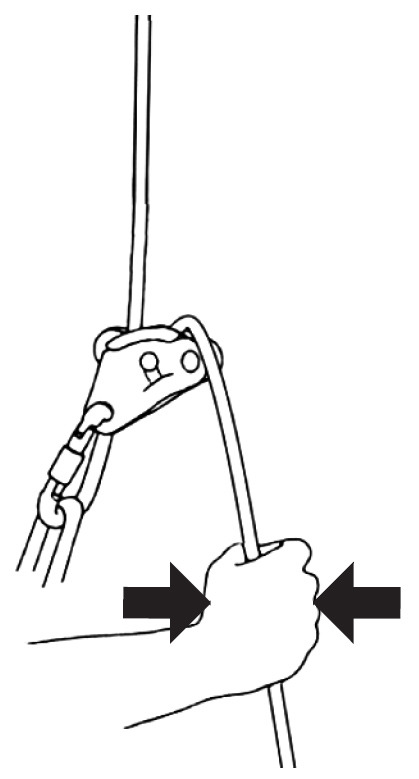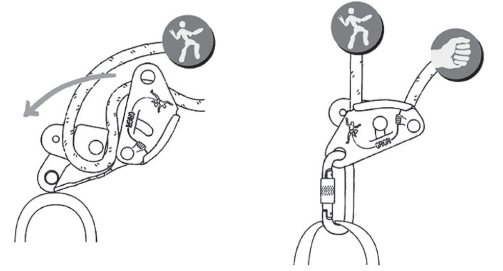○ 그리그리는 자동 잠금 장치이나 최대한 안전을 위해서, 손잡이를 잡았을 때에는 반드시 한손은 여유분의 로프를 잡고 있어야 합니다. 하강하기 위해 첫 번째 여유분 로프를 단단히 잡고 손잡이를 부드럽게 당깁니다. 제동과 하강의 조절은 여유분의 로프를 느슨하게 잡거나 꽉 잡는 동작에 의해 조절됩니다. 하강을 멈추기 위해서는 간편하게 손잡이를 풀어줍니다.