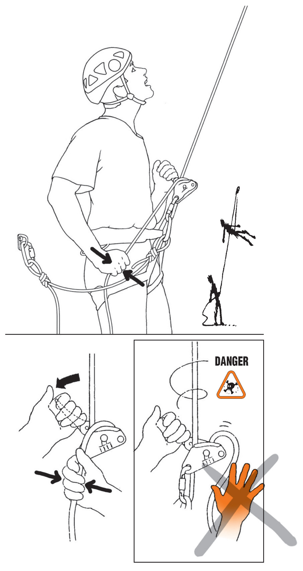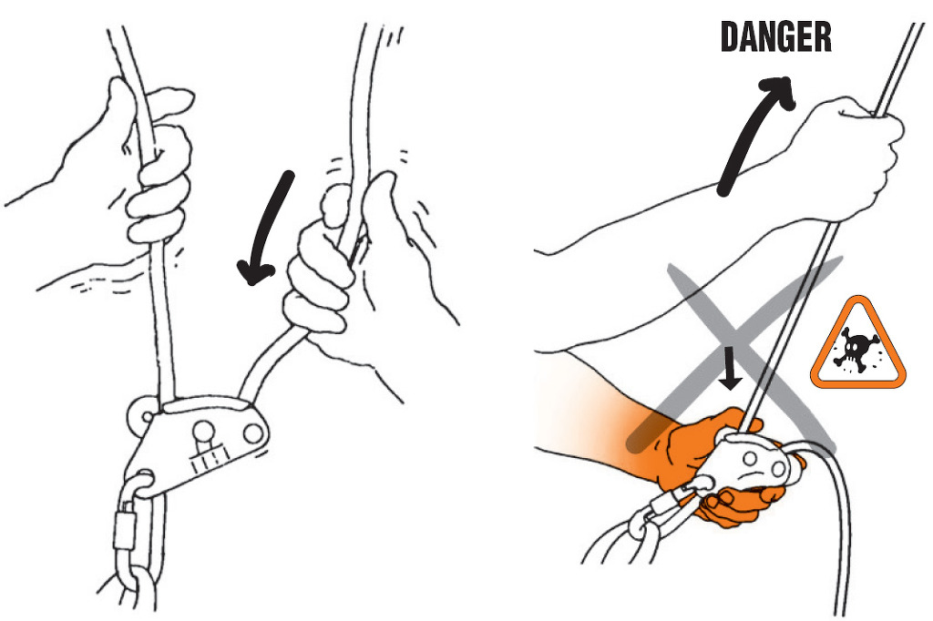 주의: 각 손에 한 줄의 로프만 잡습니다. 8자 하강기나 뮌터 히치 확보를 할 때 한 손에 두 줄의 로프를 잡으면, 손의 압력이 제 기능을 방해하거나 제동을 막거나 지연시킬 수 있습니다.