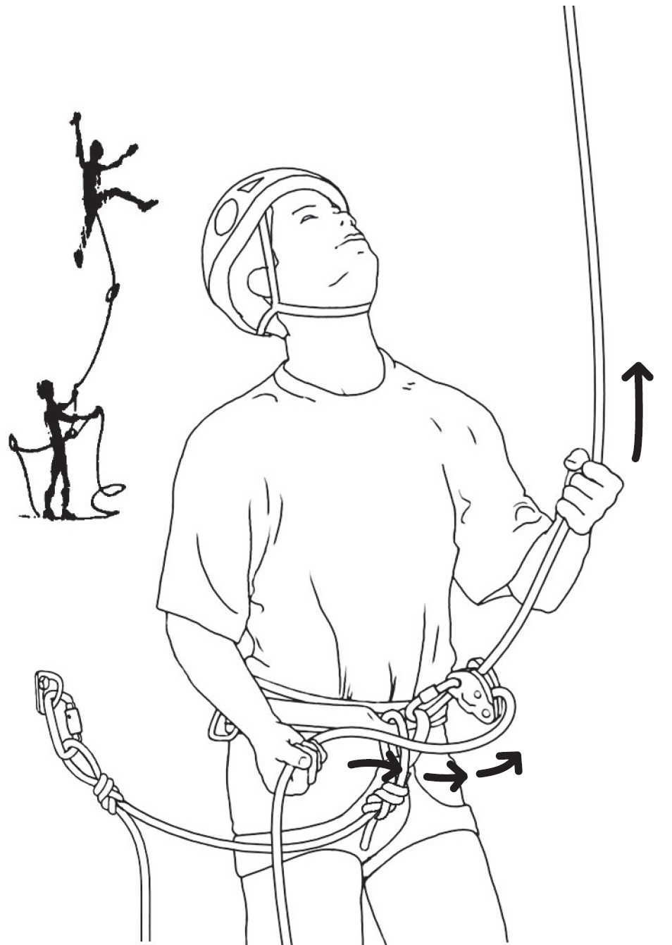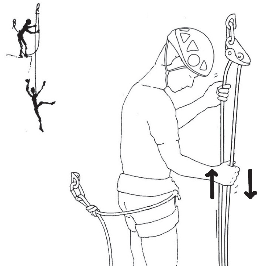 효과적으로 추락을 정지시키기 위해서는 여유분의 로프를 팽팽하게 아래로 당깁니다.