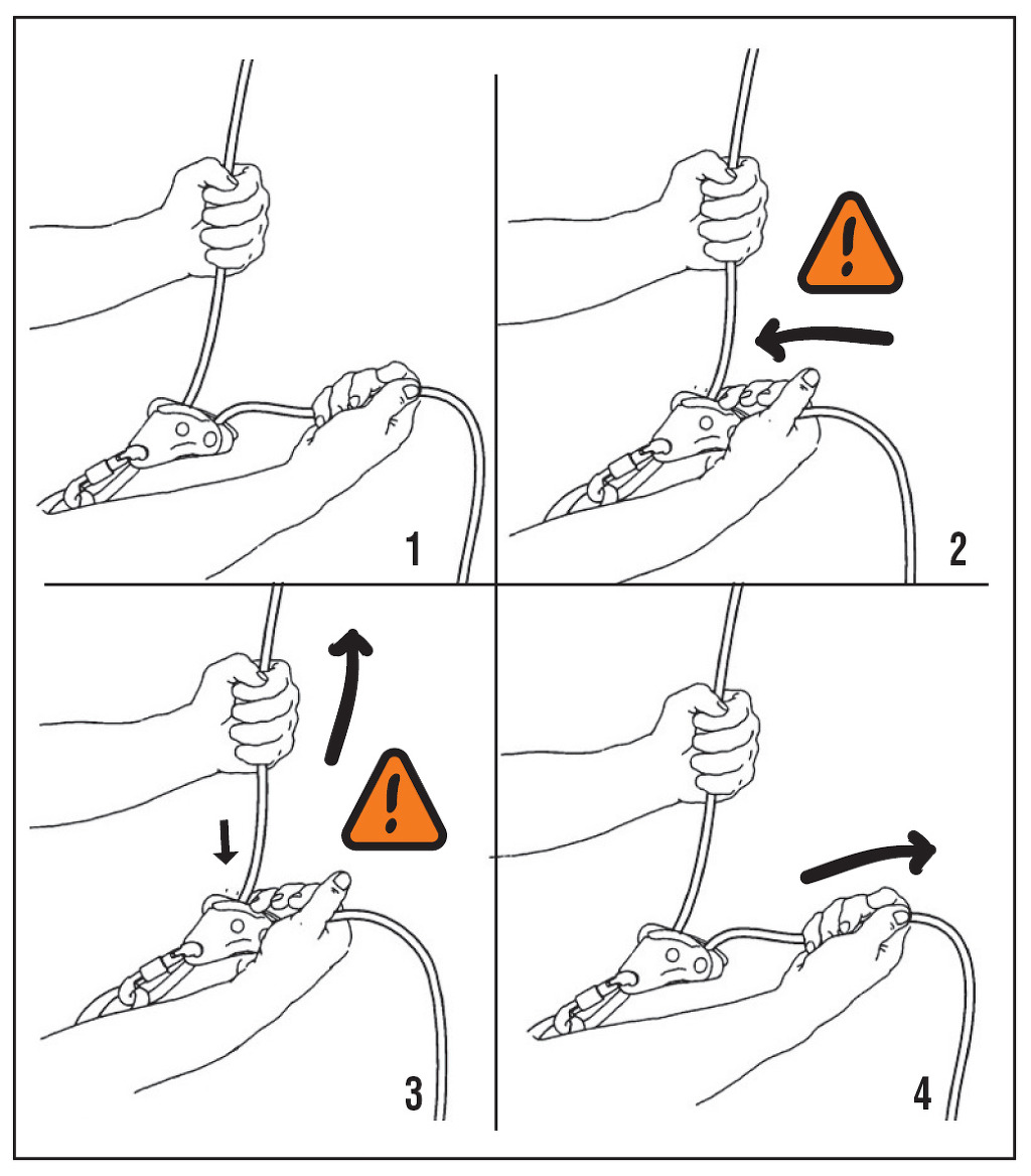 로프가 올바르게 설치되었는지, 장비가 정확히 기능을 하는지 확인하기 위해서는 항상 사용할 때마다 작동 검사를 거쳐야 합니다. 로프가 힘껏 당겨지거나 힘을 받았을 때 등반자의 아래에 있는 로프가 끼이게 됩니다. 로프에 하중이 가해지면 연결 장치의 핀이 돌아가 로프를 죄어 움직이지 못하게 됩니다. 가해진 힘이 풀리게 되면 캠은 다시 제자리로 돌아갑니다. 장비 안에 이물질이나 모래가 들어가지 않도록 주의하고 로프와 직접 닿는 장비의 표면에 윤활제를 뿌리게 되면 자동 잠금 기능이 재 역할을 못하게 되므로 절대로 윤활제를 사용해서는 안 됩니다.