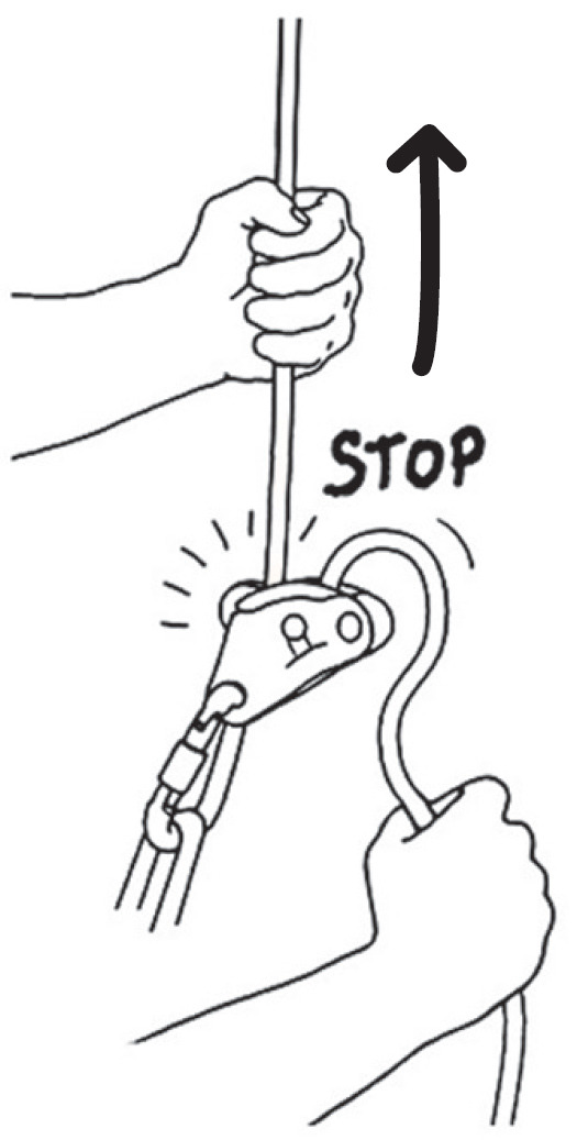 고 손잡이를 위로 밉니다. 여유분의 로프를 느슨하게 잡거나 꽉 잡는 동작을 통해 제동을 조절합니다.