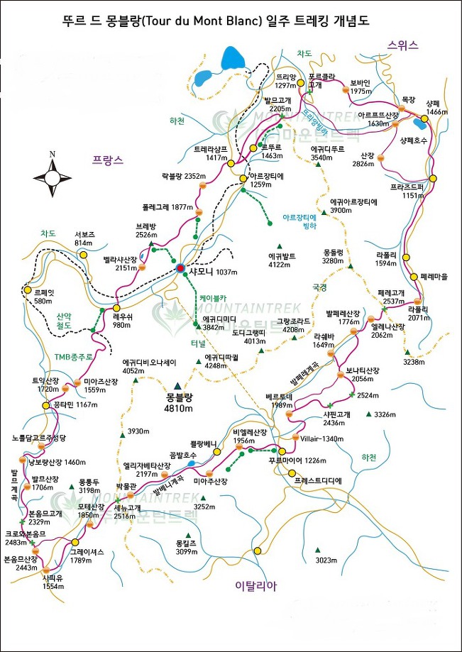 ★총일정 13박14일(기내1박/호텔6박/산장6박) ★TMB트레킹 총176km 완전일주(원점) ★중간에 차량을 이용한 skip 없으며 레우슈 출발 레우슈 도착으로 완전일주 완성 | ||||