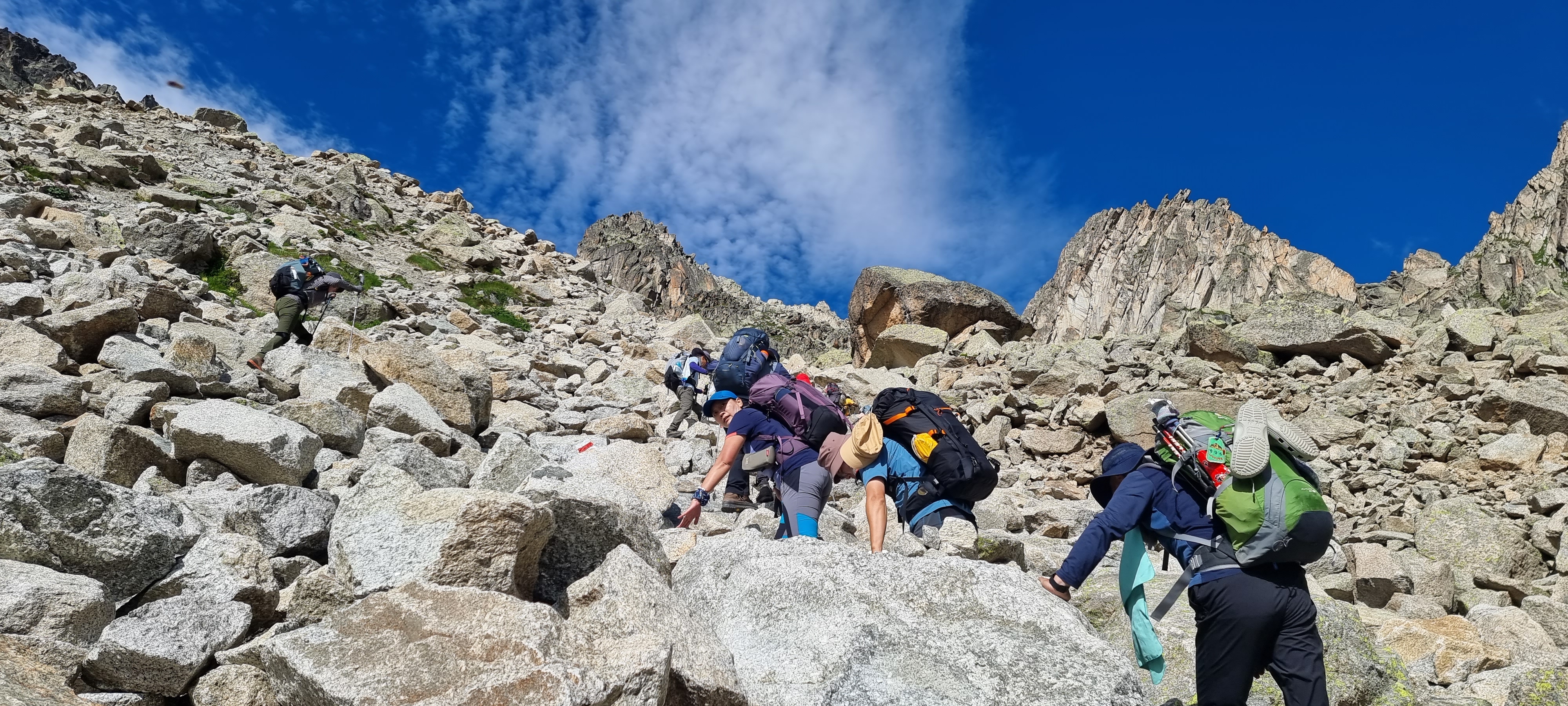 | 7월28일 월요일 (6일차) | 전일트레킹 | ◎08시 엘리자베타산장 출발 트레킹시작 꼼발산장~몬테파브로언덕~ 메종비에유산장(1956m)~몽쉐티프(2343m)왕복~쿠르마예르(1226m)~베르토네산장(6박) //약24km 9시간30분 ▒ ★이태리 쿠르마에르의 상징인 몽쉐티프(촛대암봉)은 TMB코스는 아니지만 설악의 유명비탐코스를 방불케하는 암릉과 정상의 360도 파노라마는 대원들의 아드레날린을 끓게하기에 충분합니다. 대성유일의 탐방코스(대성만의 회심의 코스) ▒이탈리아의 몽블랑 관문인 쿠르마에르에서 쇼핑가능 ●쿠르마예르시내에서는 버스터미널을 지나 핸리광장에서 모여 빌라이에르 경유 베르통산장까지 진행합니다. ◈누적68km | 베르토네 산장 도미토리 |