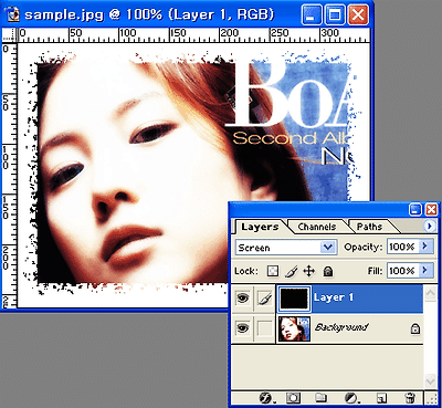 10. 아래의 예제와 같이 레이어팔레트 에서Layer1을 스크린 모드로 적용시켜 줍니다.