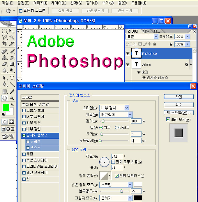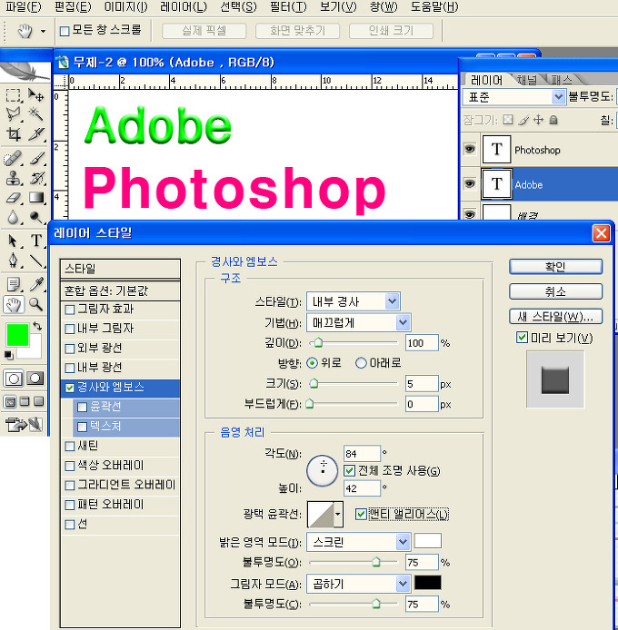 또다른 글자인 Photoshop 글자에 엠보스적용하는 레이어스타일창에서 엔티앨리어스란에 체크를 해주고 전체조명사용란에 체크해제를 해주고 엠보스스타일효과를 주면 다른레이어글자에 적용이 되지 않습니다 그림자효과를 줄때도 엔티앨리어스란에 체크를 해주면 다른레이어에는 적용을 받지 않습니다
