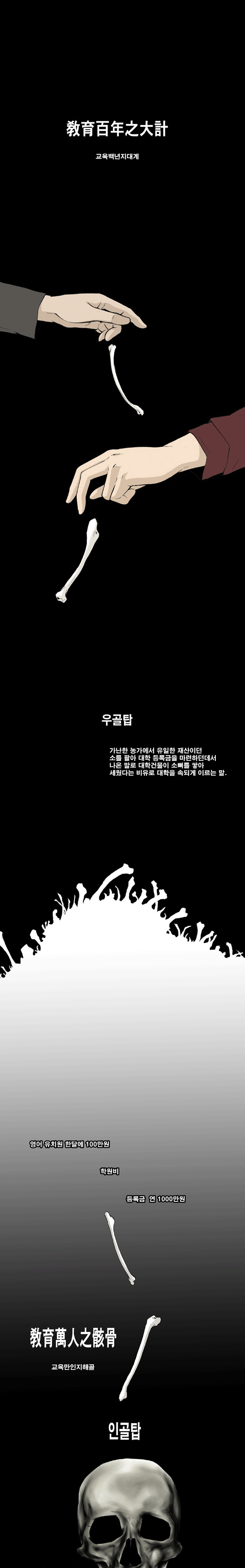 나의의견 : 영어학원, 영어과외에 이제는 영어 유치원까지....... 너무나 감당하기 어려워진 사교육비로인해 부모님들의 허리가 더 휘어지고 학생들은 그들대로 피곤에 녹초가 되어가고있다. 위 만화에 나오는 우골탑(牛骨塔)이란 옛날 가난했던 농가에서 자식들을 대학에 보내기 위해 집안의 가장 큰 재산인 소를 팔았다는 의미에서 대학을 속되게 이르는 말이라고 한다. 이렇게 힘들게 자식들을 대학에 보냈던 부모님들에게 이제는 대학보다도 더 큰 문제가 닥쳐왔다. 이제는 너무 커져버린 영어교육으로인해 없는 형편에도 과외나 학원에 보내지 않고는 아이를 제대로된 대학에 보낼 수가 없게 되어버린것이다. 영어라는 동굴 속 캄캄한 앞길에 부모님의 휘어지는 등골을 보며 과연 영어몰입교육이 우리에게 주는 이익이 무엇인지, 우리가 왜 이렇게까지 영어에 몰입하여야만하는건지 의문점을 갖게된다. 작가는 이 현상을 '교육만인지해골(敎育萬人之骸骨)' 이라고 표현하였다. 이제 몰입식 영어교육이 지쳐버린 부모님들과 학생들, 만인을 해골로 만들고있다.