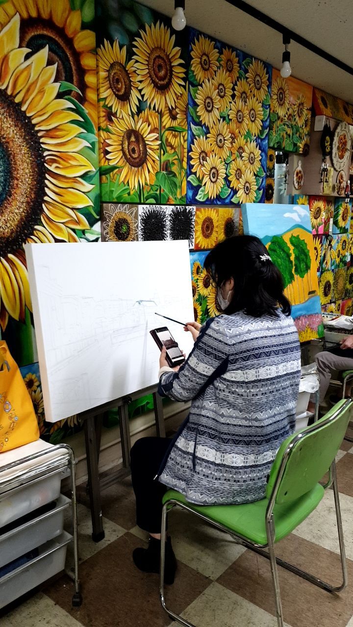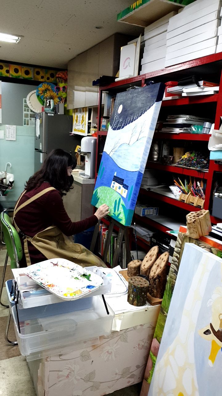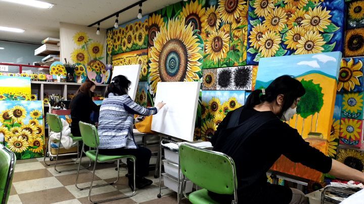 성인취미미술로 해운대구 좌동로63번길 롯데캐슬마스터2차 상가209호의 해운대화실에서 모여 그림그리는 모습입니다