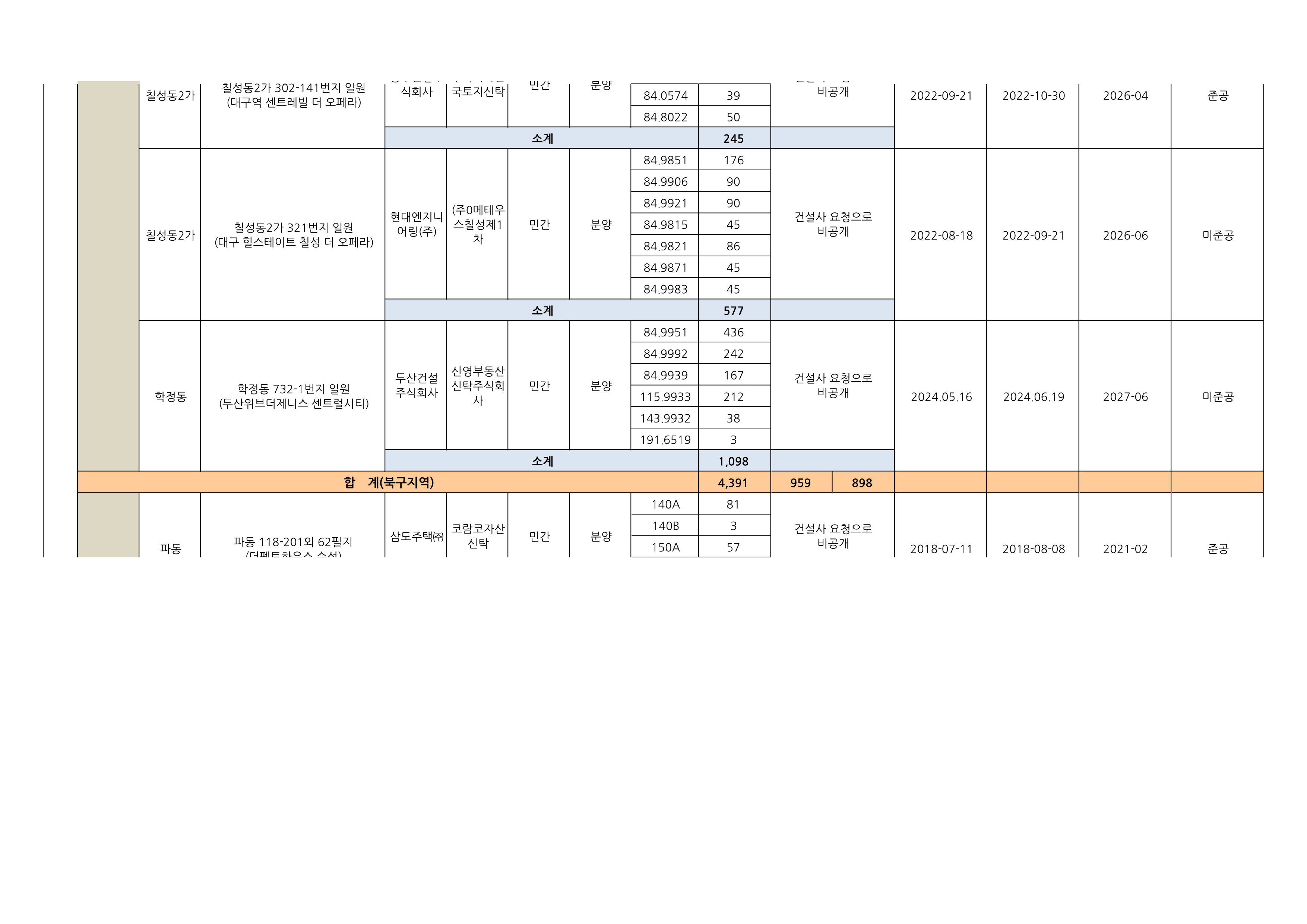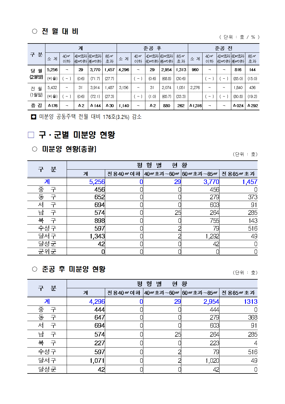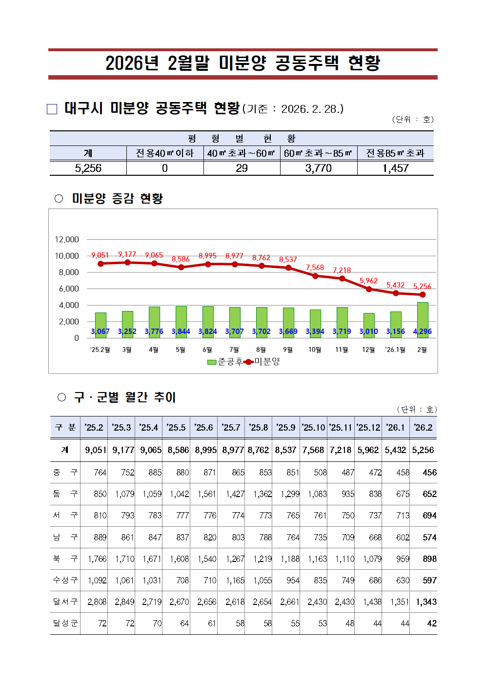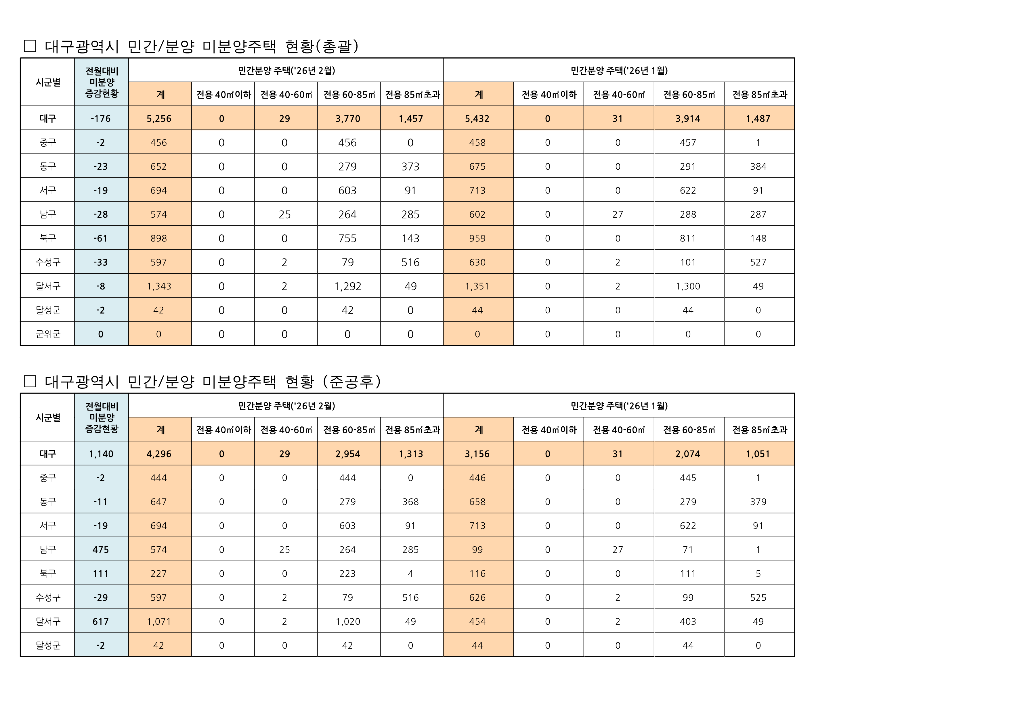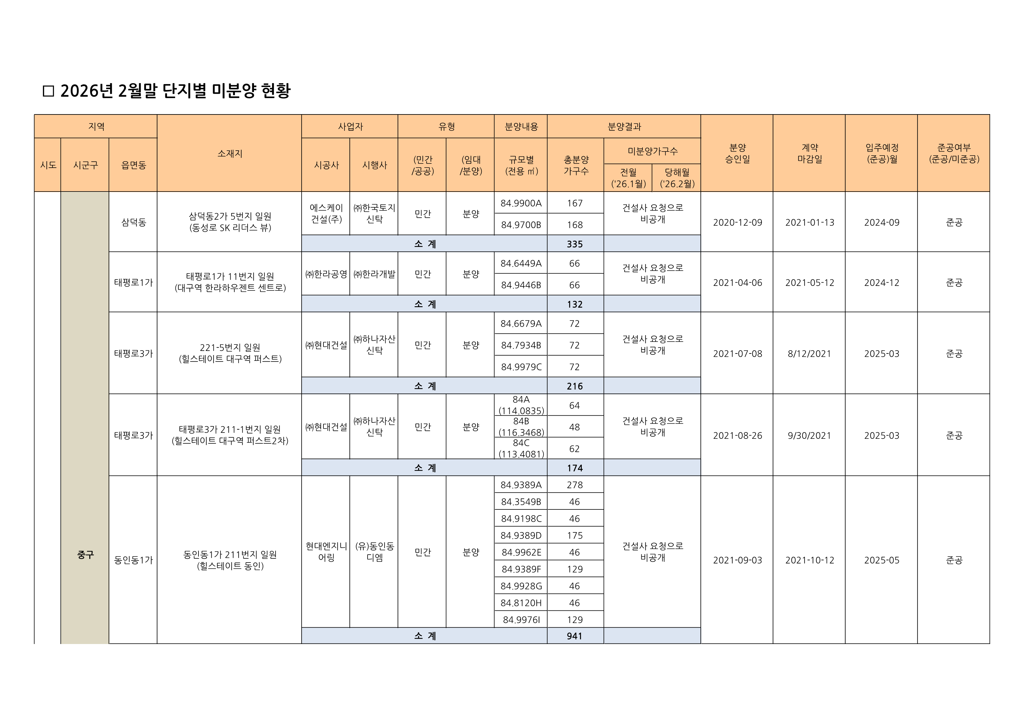 대구광역시 공동주택 미분양 현황 (2026년 2월말 기준) 작성자페이지마스터|작성시간26.03.31|조회수1,420 목록 댓글 4 글자크기 작게가 글자크기 크게가 [ 정당계약 완료했으나 통계에 아직까지 포함되지 않은 현장 ] 태왕아너스더힐엘크루가우디움만촌 다음검색 현재 게시글 추가 기능 열기 북마크 공유하기 신고 센터로 신고 댓글 댓글 4 댓글쓰기 답글쓰기 댓글 리스트 작성자흑매 | 작성시간 26.03.31 꾸준히 주네요 작성자듬뿌기 | 작성시간 26.03.31 많이 줄긴 했네요~ 작성자블루오션~♡ | 작성시간 26.03.31 악성 미분양은 더 늘고 있네 작성자찬란한순간 | 작성시간 26.04.01 이자료가 100%라고 믿는분 있나요??^^각 회사에서 주는 자료 통계치일뿐~ 댓글 전체보기