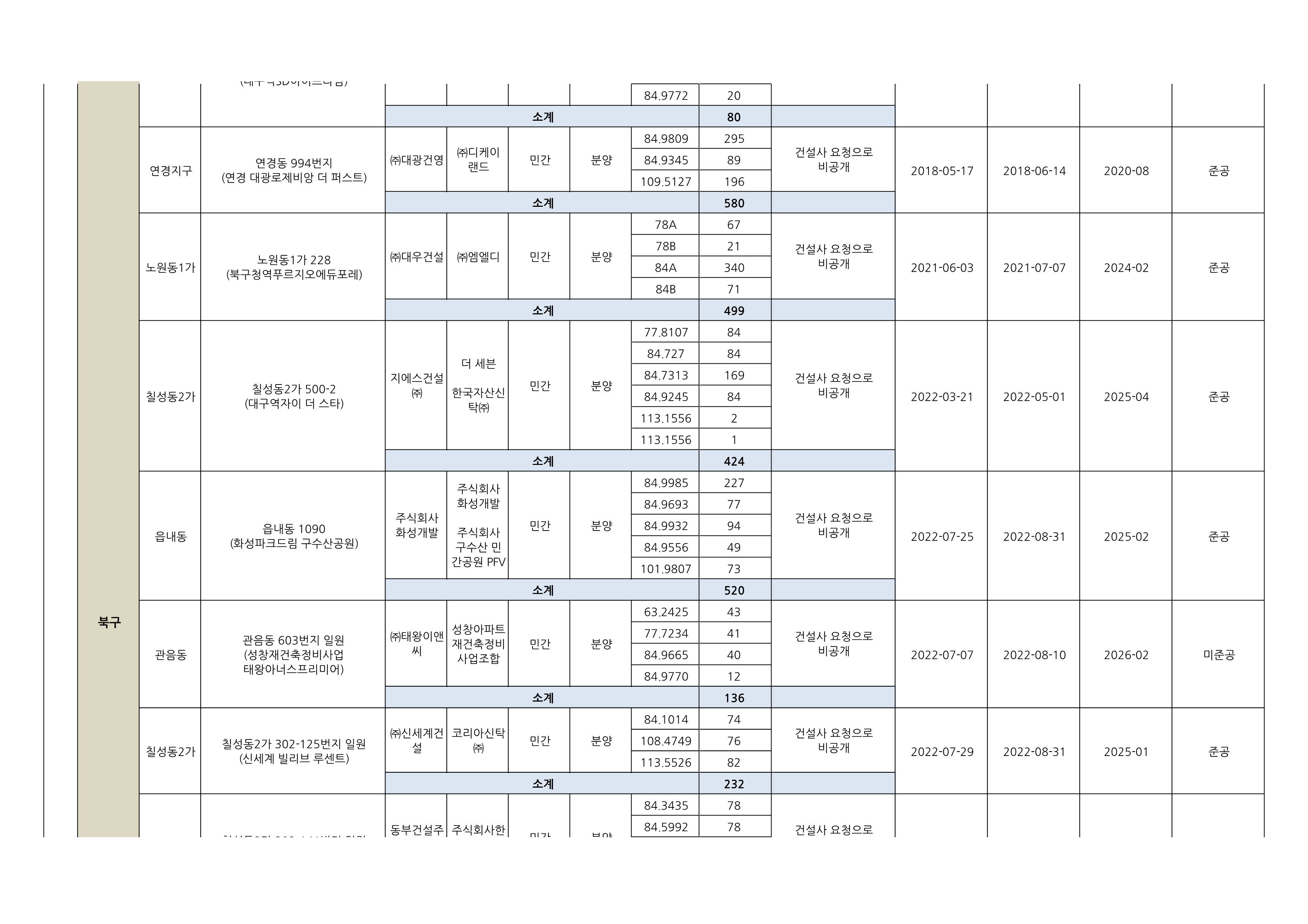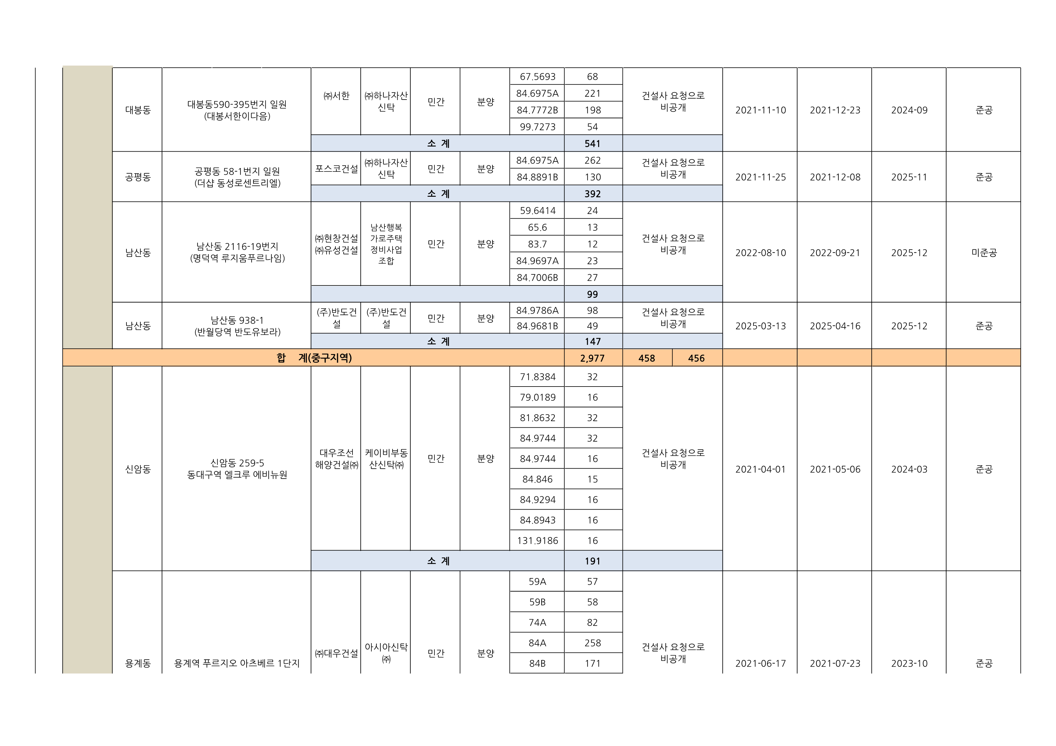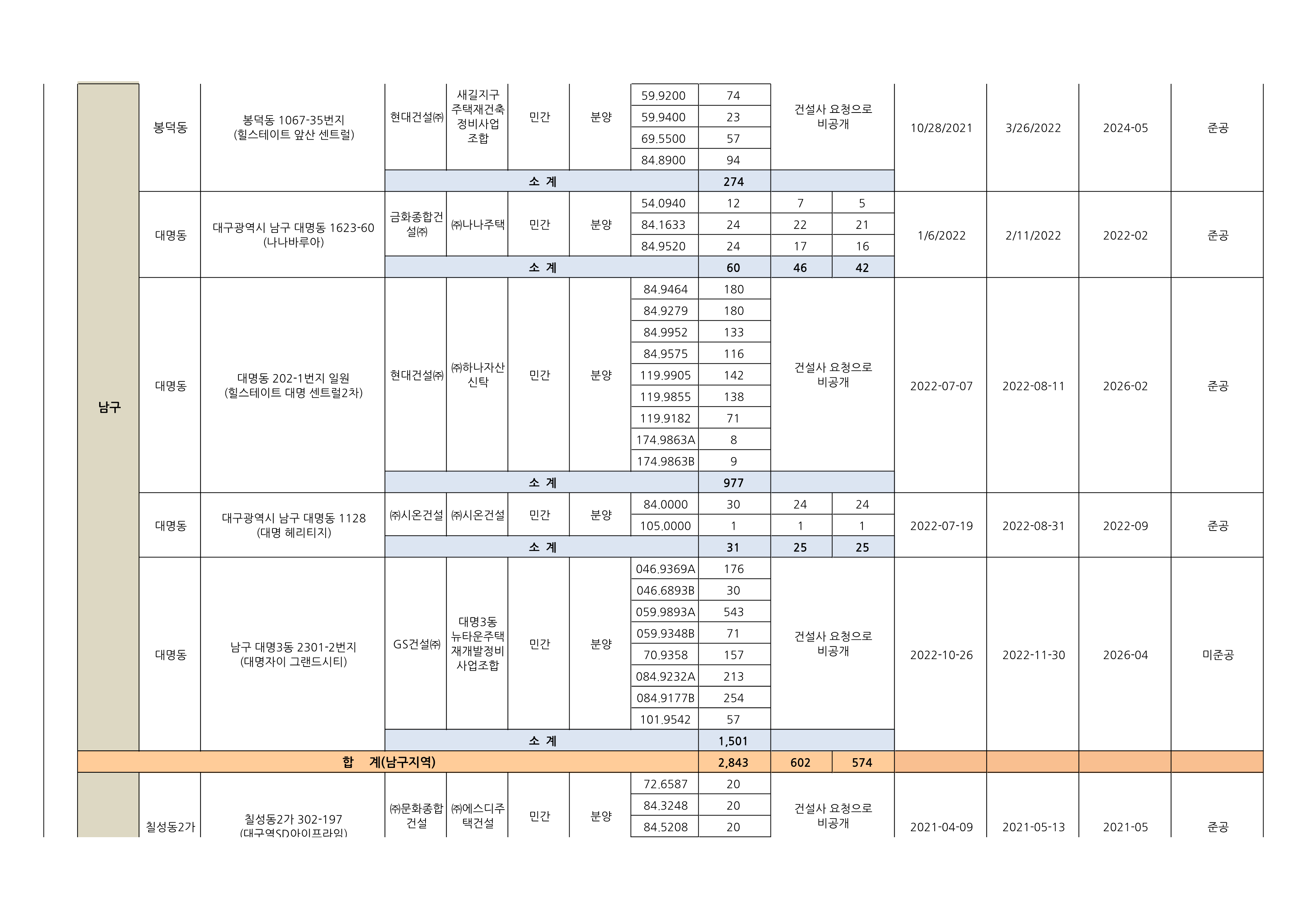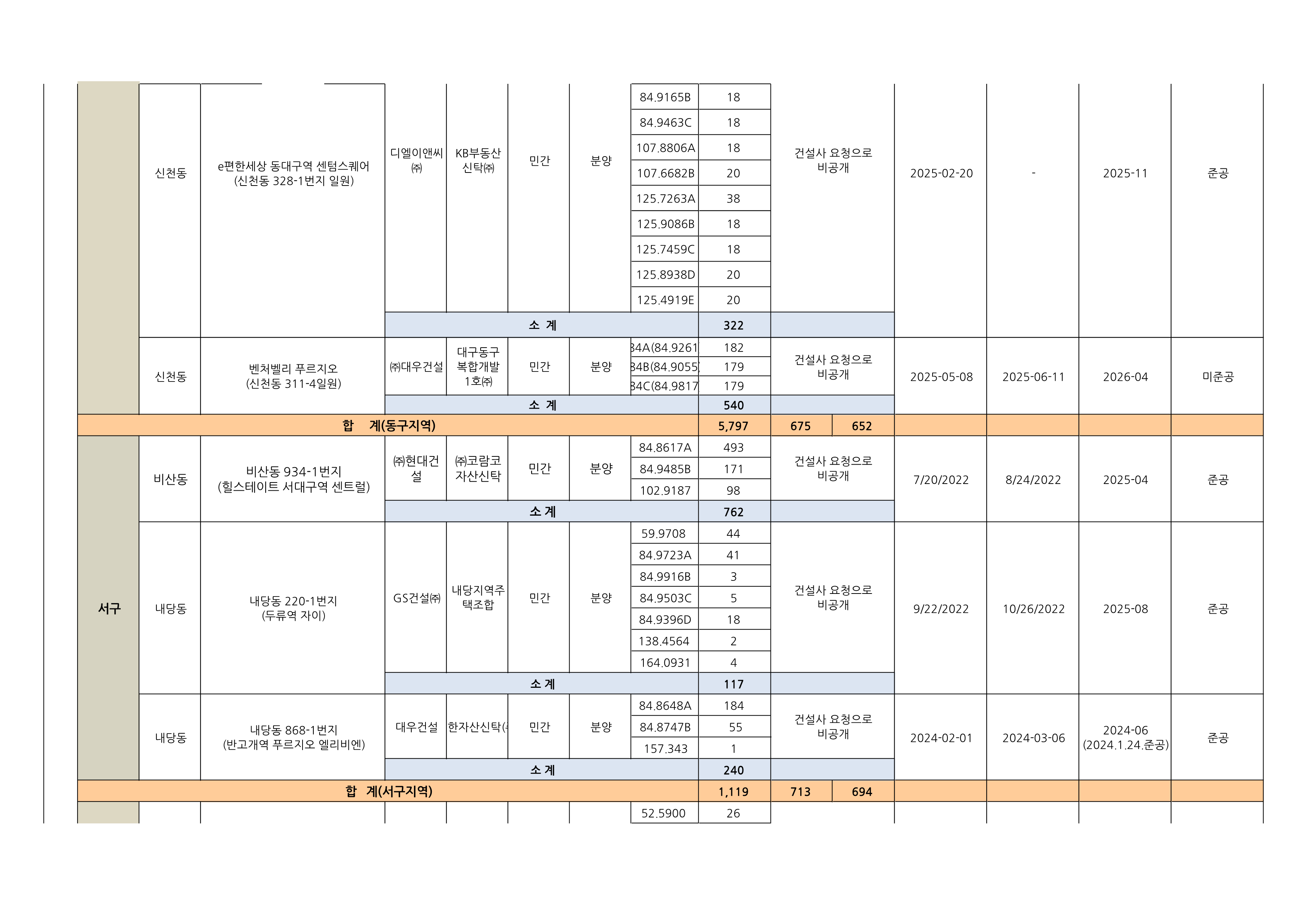 대구광역시 공동주택 미분양 현황 (2026년 2월말 기준) 작성자페이지마스터|작성시간26.03.31|조회수1,420 목록 댓글 4 글자크기 작게가 글자크기 크게가 [ 정당계약 완료했으나 통계에 아직까지 포함되지 않은 현장 ] 태왕아너스더힐엘크루가우디움만촌 다음검색 현재 게시글 추가 기능 열기 북마크 공유하기 신고 센터로 신고 댓글 댓글 4 댓글쓰기 답글쓰기 댓글 리스트 작성자흑매 | 작성시간 26.03.31 꾸준히 주네요 작성자듬뿌기 | 작성시간 26.03.31 많이 줄긴 했네요~ 작성자블루오션~♡ | 작성시간 26.03.31 악성 미분양은 더 늘고 있네 작성자찬란한순간 | 작성시간 26.04.01 이자료가 100%라고 믿는분 있나요??^^각 회사에서 주는 자료 통계치일뿐~ 댓글 전체보기
