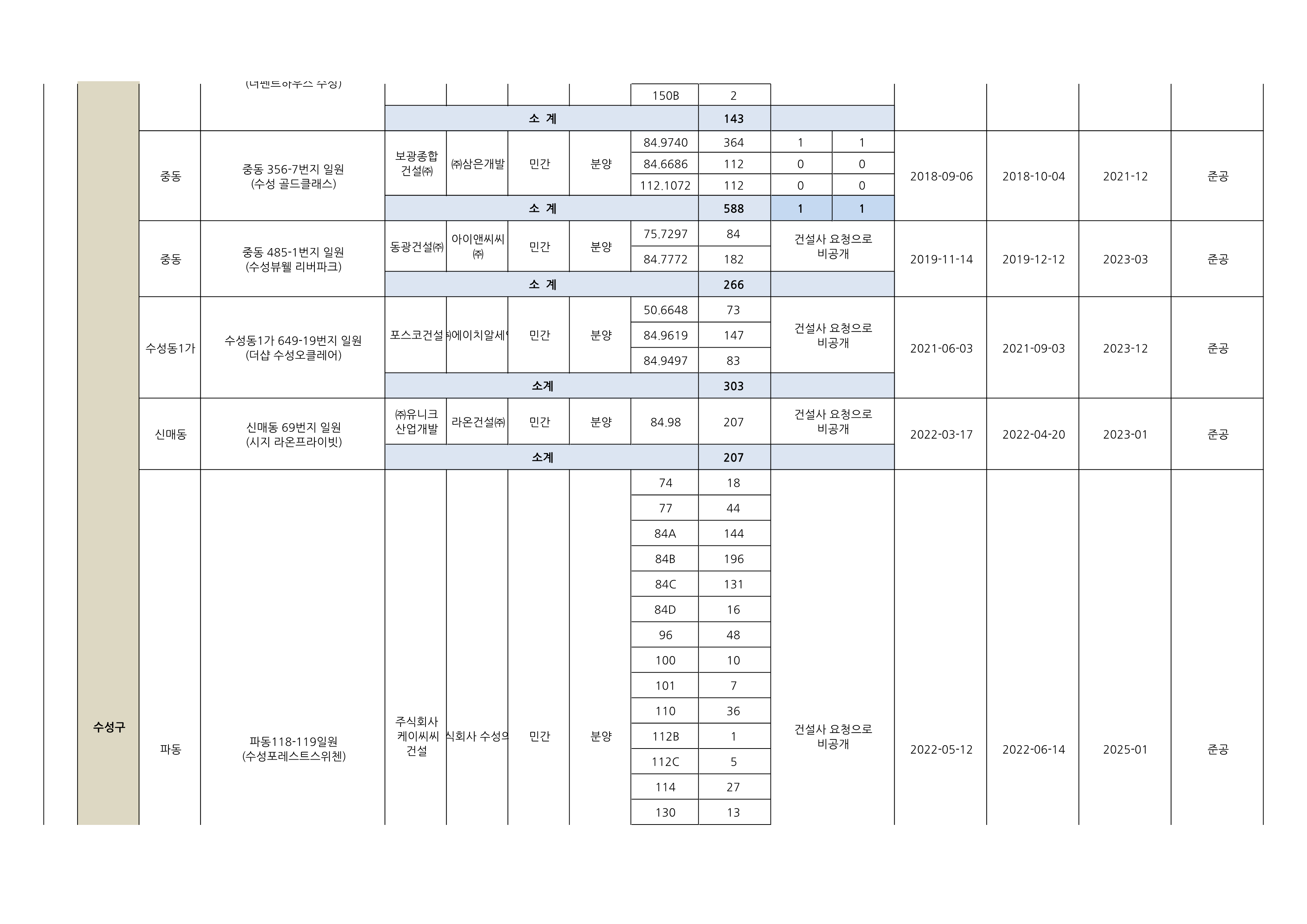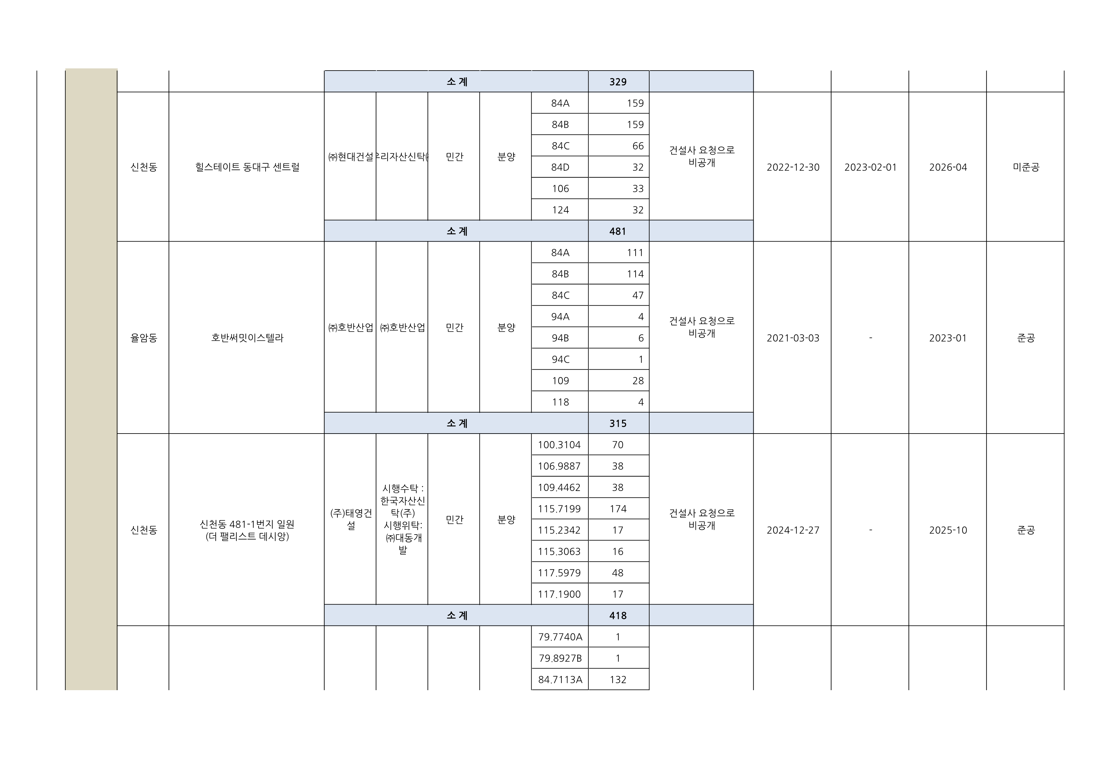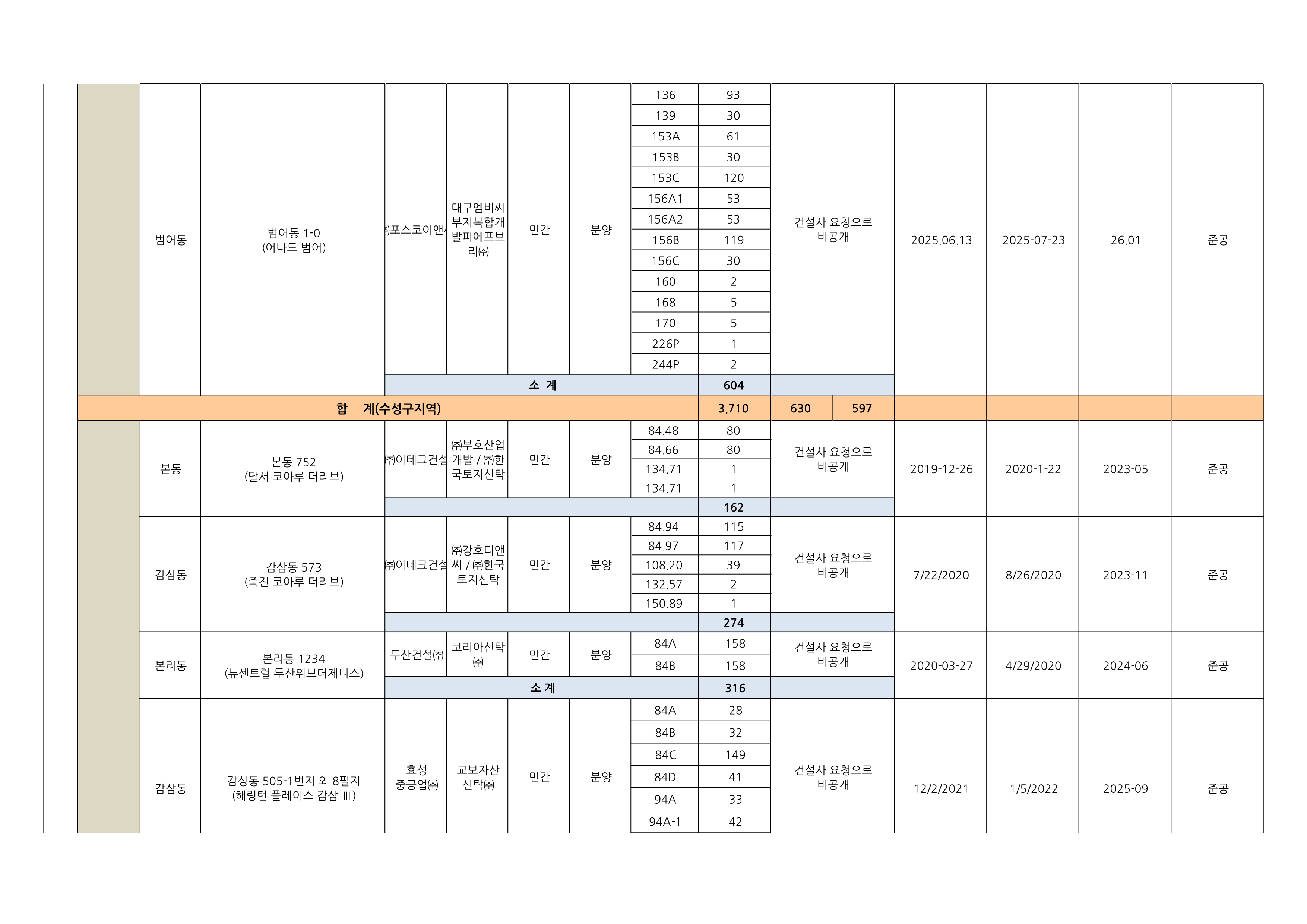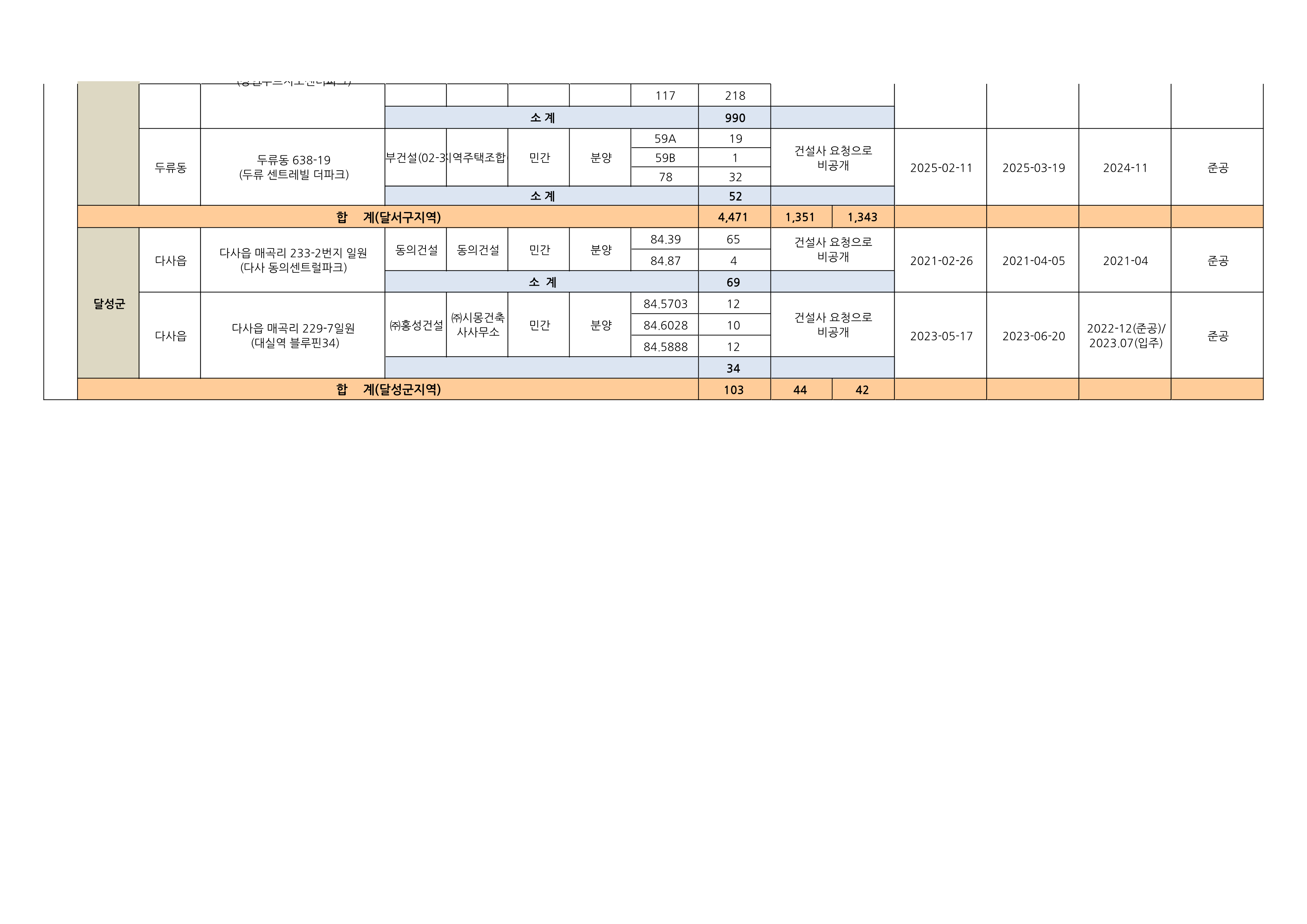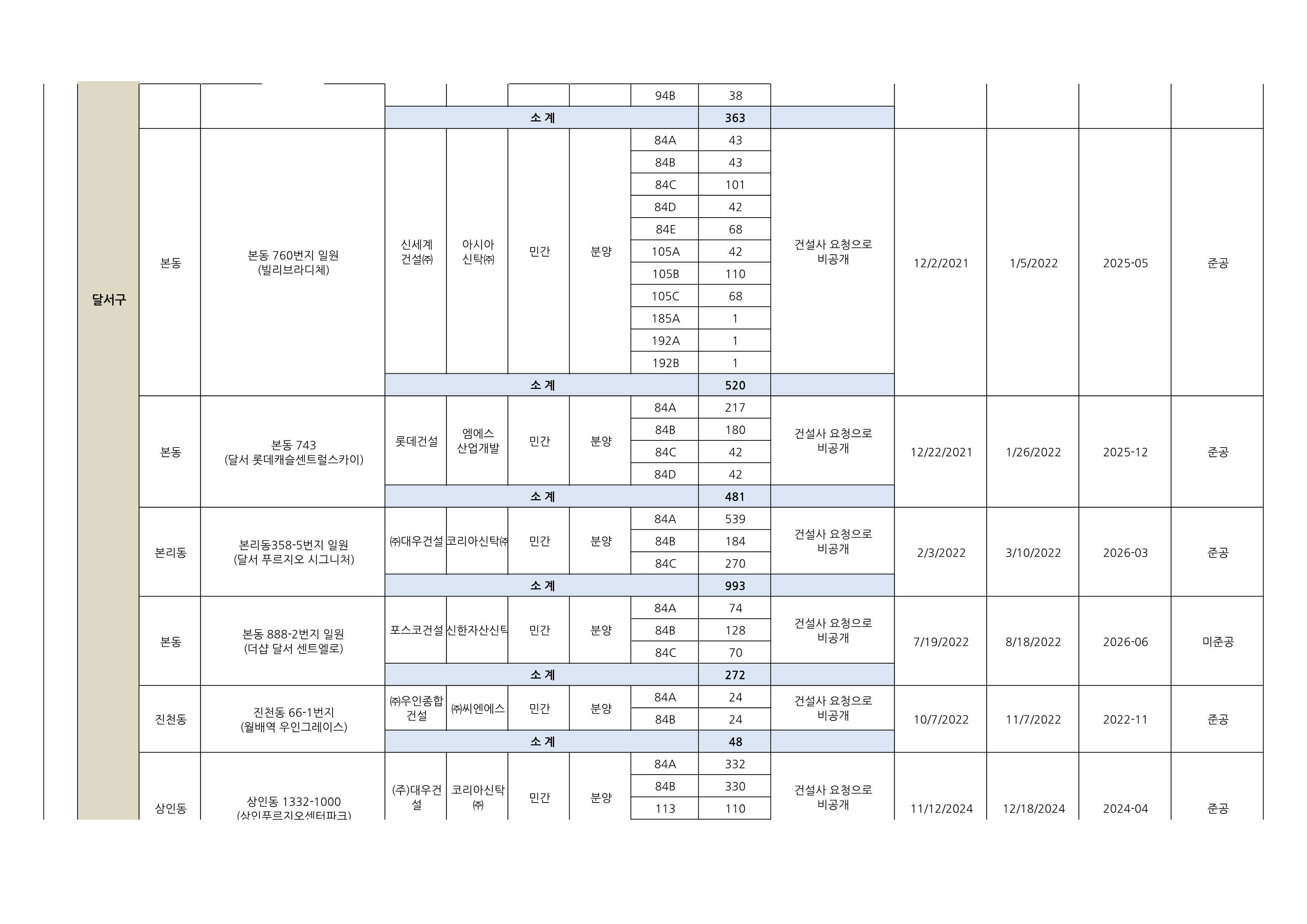 대구광역시 공동주택 미분양 현황 (2026년 2월말 기준) 작성자페이지마스터|작성시간26.03.31|조회수1,420 목록 댓글 4 글자크기 작게가 글자크기 크게가 [ 정당계약 완료했으나 통계에 아직까지 포함되지 않은 현장 ] 태왕아너스더힐엘크루가우디움만촌 다음검색 현재 게시글 추가 기능 열기 북마크 공유하기 신고 센터로 신고 댓글 댓글 4 댓글쓰기 답글쓰기 댓글 리스트 작성자흑매 | 작성시간 26.03.31 꾸준히 주네요 작성자듬뿌기 | 작성시간 26.03.31 많이 줄긴 했네요~ 작성자블루오션~♡ | 작성시간 26.03.31 악성 미분양은 더 늘고 있네 작성자찬란한순간 | 작성시간 26.04.01 이자료가 100%라고 믿는분 있나요??^^각 회사에서 주는 자료 통계치일뿐~ 댓글 전체보기