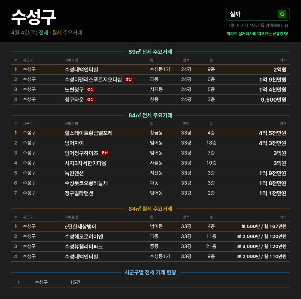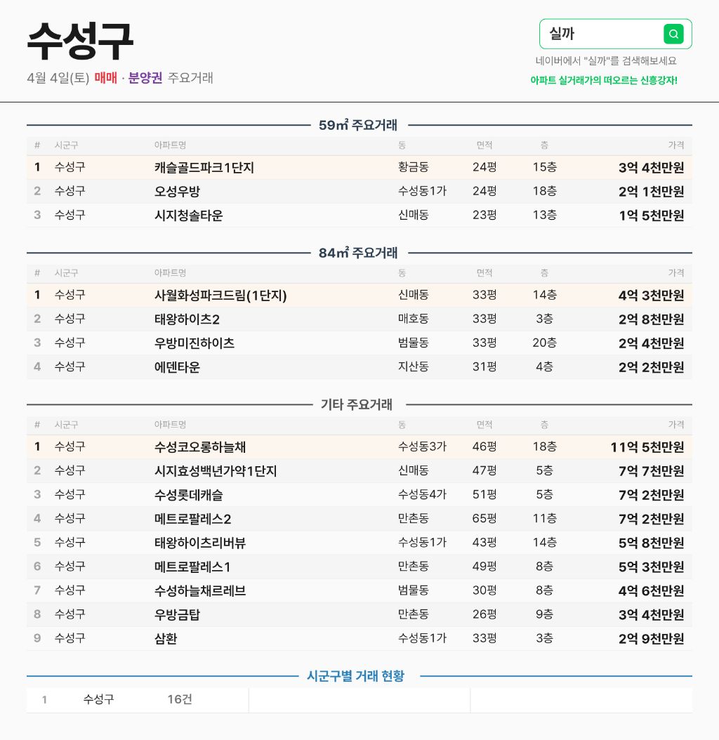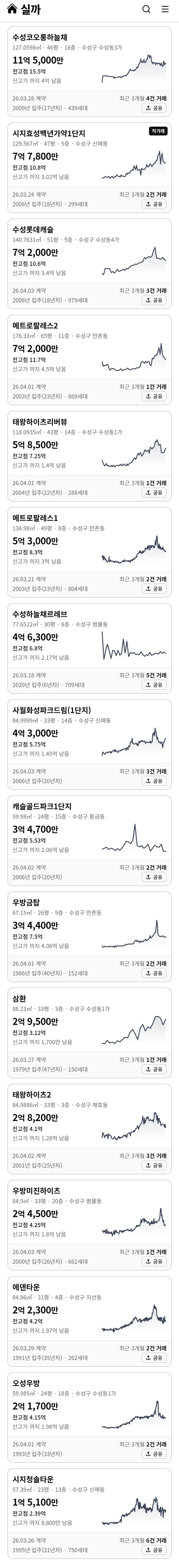 260404 수성구 실거래 작성자가임파파|작성시간26.04.04|조회수5,183 목록 댓글 5 글자크기 작게가 글자크기 크게가 수성구 아파트 실거래가https://silgga.com/region/27260신고가 0거래량 매매 16건 분양권 0 다음검색 현재 게시글 추가 기능 열기 북마크 공유하기 신고 센터로 신고 댓글 댓글 5 댓글쓰기 답글쓰기 댓글 리스트 작성자새벽기차 | 작성시간 26.04.04 감사합니다 주말 잘 보내세요 작성자꿈꾸는 정원 | 작성시간 26.04.04 수3도 거래가 늘어나네요 작성자황칠이 | 작성시간 26.04.04 구축은 힘이 약간 없네요 작성자쑤니언니 | 작성시간 26.04.06 감사합니다 작성자cpffh | 작성시간 26.04.06 잘보고 있습니다.감사합니다 댓글 전체보기
