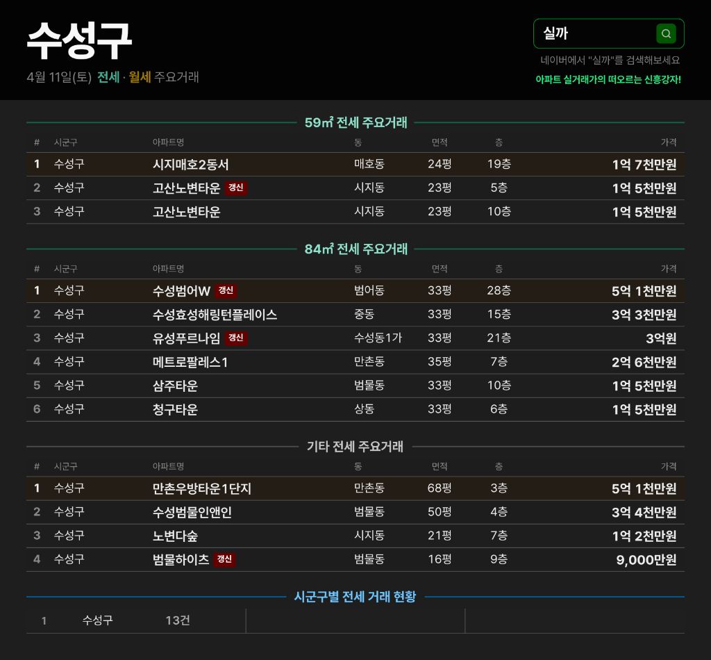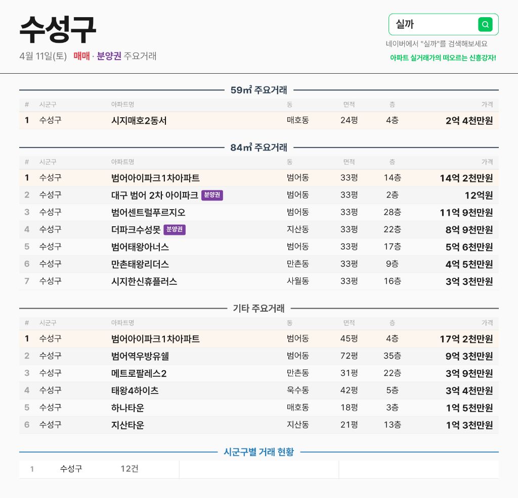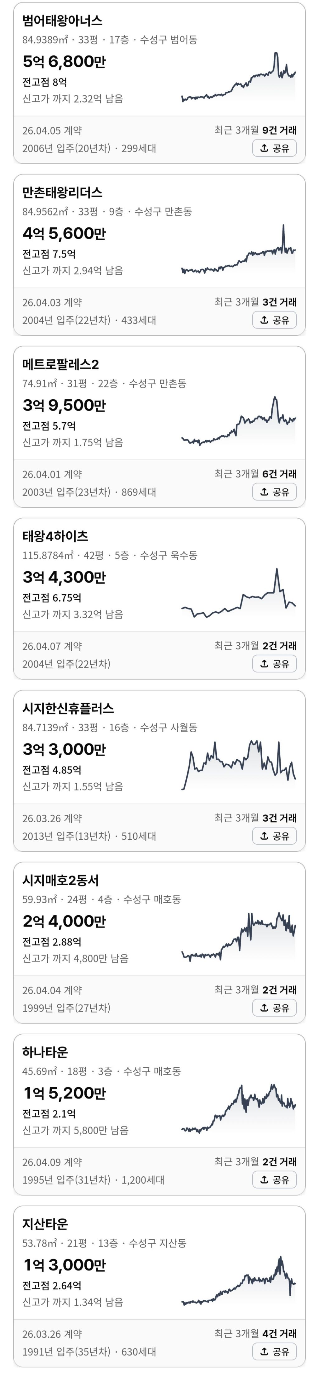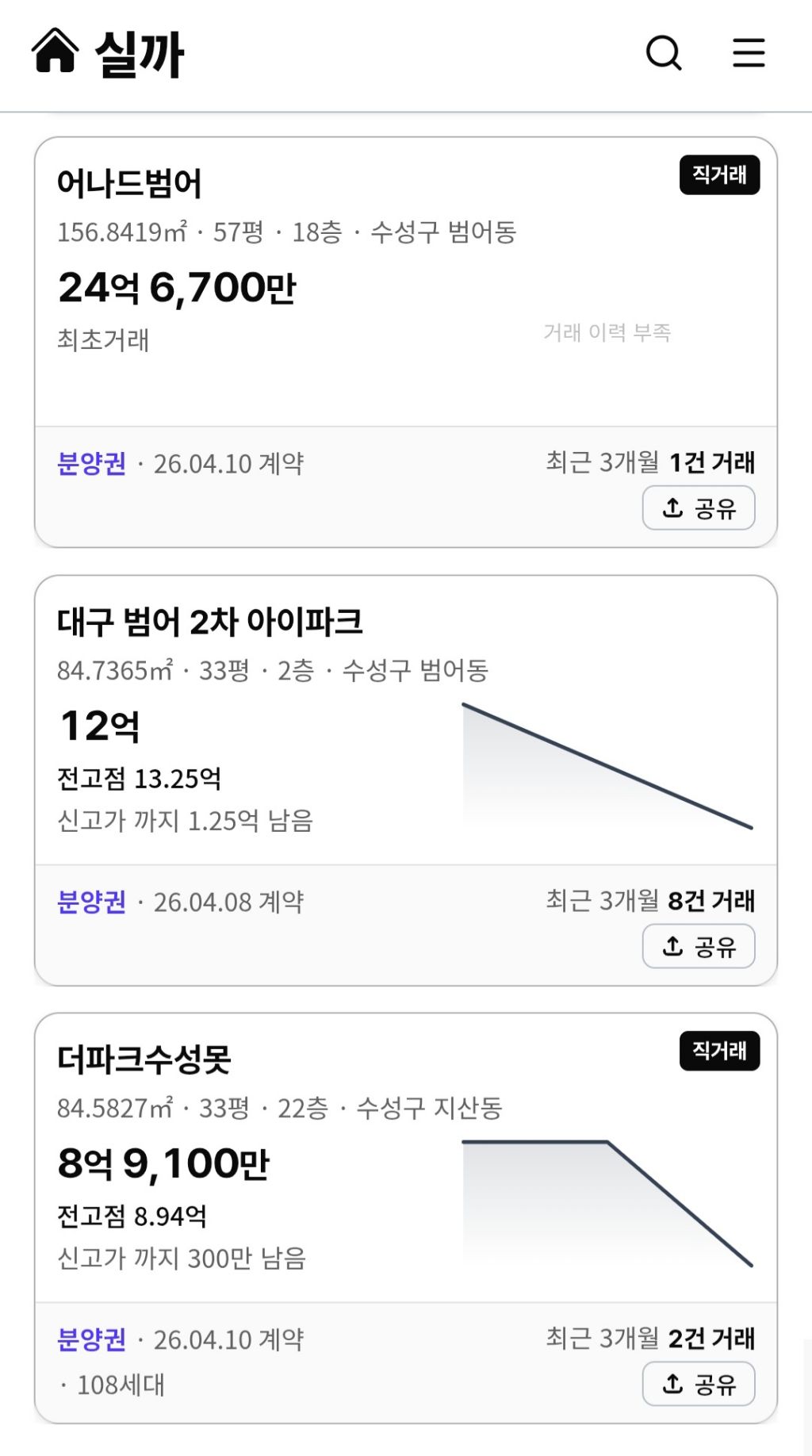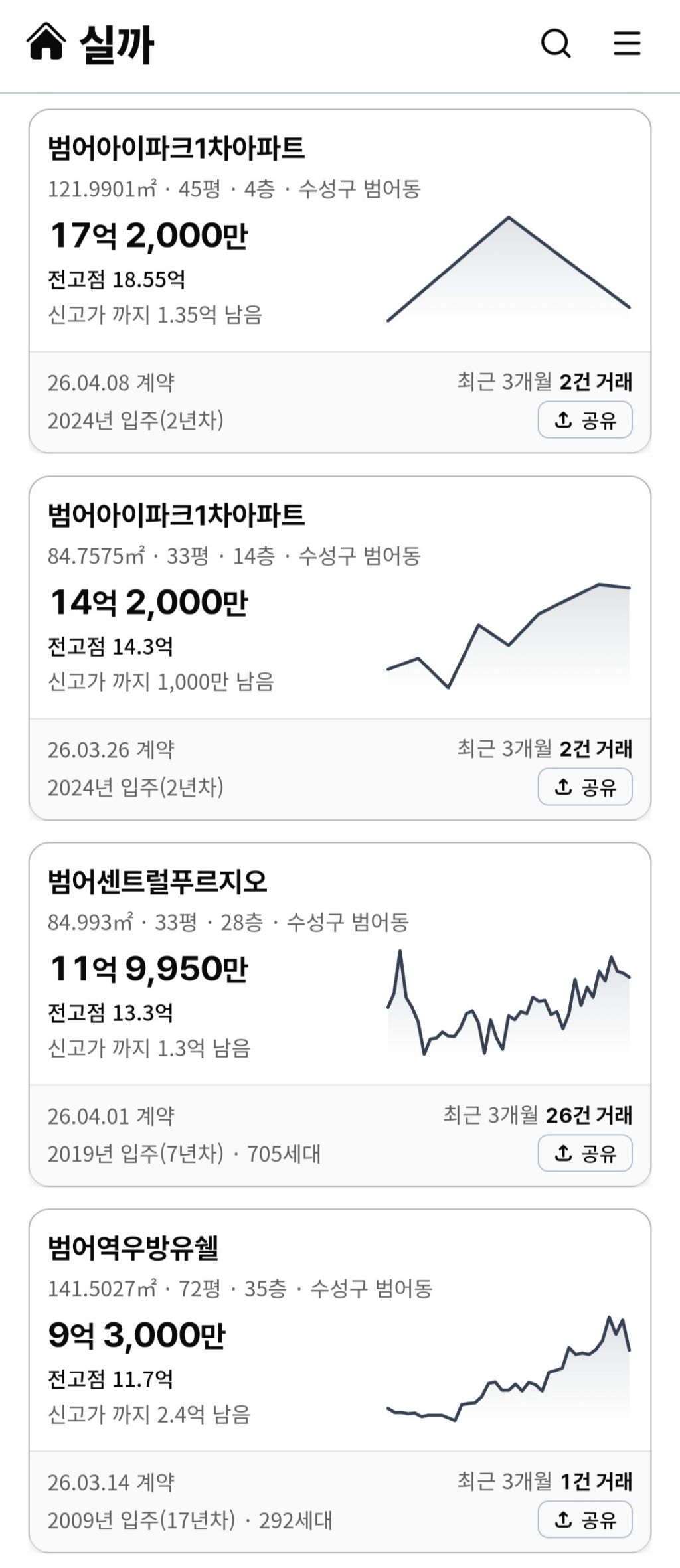 작성자수성구범어 작성시간 26.04.11 범아 범푸 거래되는 단지들만 거래가 잘되네요