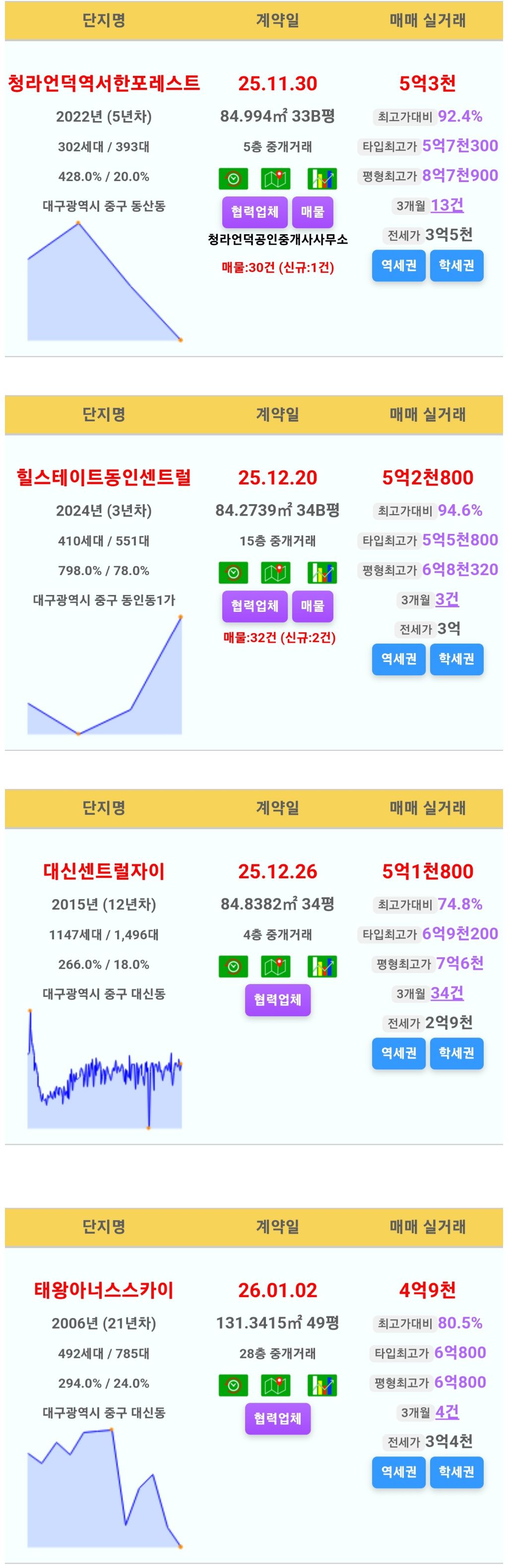 01.03 중구 실거래 [매매 4건] 작성자커버리지|작성시간26.01.03|조회수2,756 목록 댓글 3 글자크기 작게가 글자크기 크게가 주요 실거래[4억 이상]출처https://apt2.me/apt/AptDaily.jsp?area=27110&createDt=20260103&ord=2중구 실거래 일별중구 아파트 실거래 일자별 신규 거래apt2.me 다음검색 현재 게시글 추가 기능 열기 북마크 공유하기 신고 센터로 신고 댓글 댓글 3 댓글쓰기 답글쓰기 댓글 리스트 작성자낮은구름 | 작성시간 26.01.03 청서 급급매 인가요? 작성자미투m | 작성시간 26.01.03 감사합니다^^ 작성자아이리스shine | 작성시간 26.01.04 감사합니다. 추운날씨에도 거래는 이어지는군요.태왕은 새해 첫거래 같습니다. 댓글 전체보기