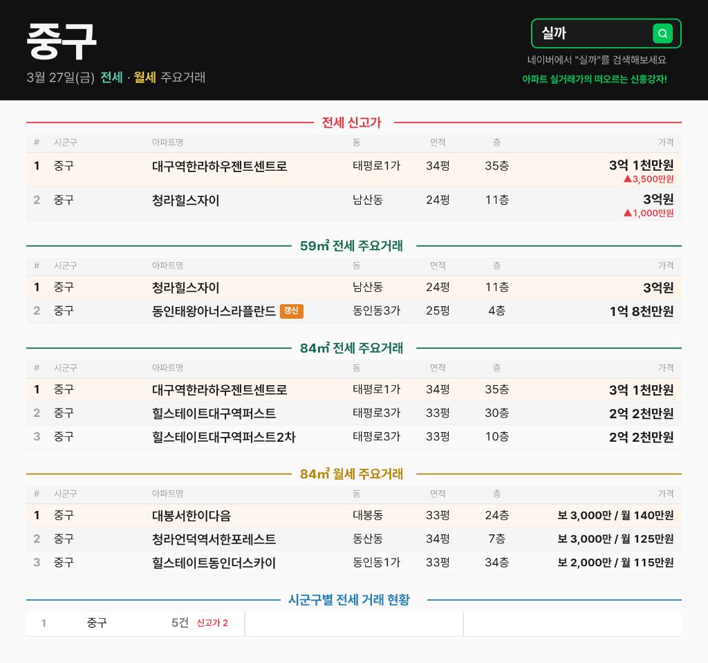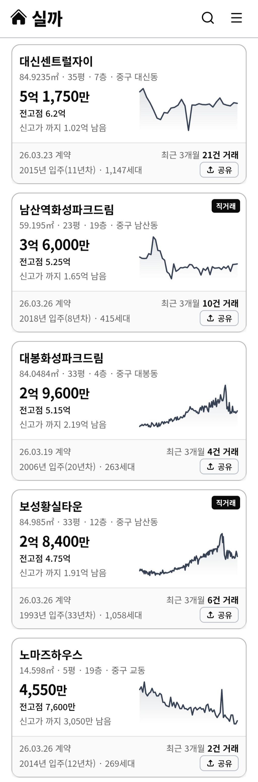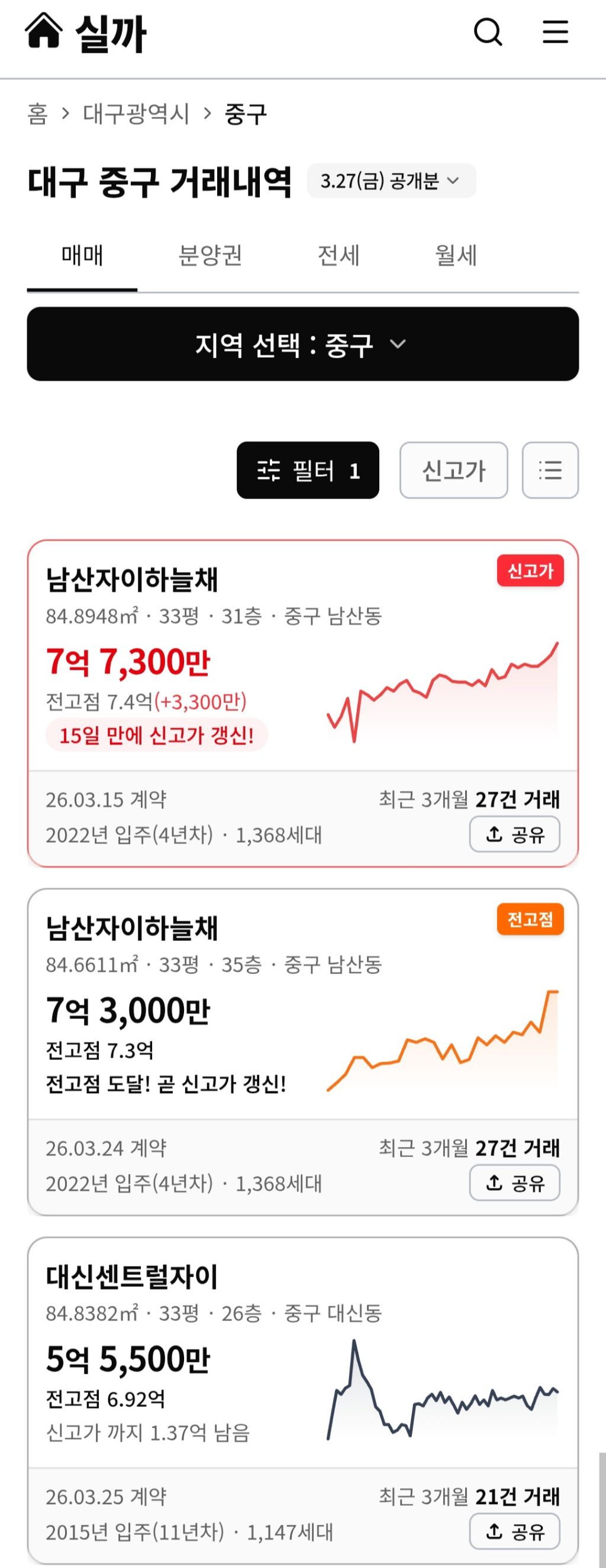 03.27 중구 실거래[매매 8건,신고가 1건] 작성자커버리지|작성시간26.03.27|조회수2,162 목록 댓글 5 글자크기 작게가 글자크기 크게가 출처실까 https://silgga.com/region/27대구광역시 아파트 실거래가 - 실까대구광역시 아파트 매매, 전세, 월세 실거래가 정보를 확인하세요.silgga.com 다음검색 현재 게시글 추가 기능 열기 북마크 공유하기 신고 센터로 신고 댓글 댓글 5 댓글쓰기 답글쓰기 댓글 리스트 작성자아이리스shine | 작성시간 26.03.27 감사합니다. 남자하신고가 축하 드립니다.청라쪽 좋아보이네요. 작성자흑매 | 작성시간 26.03.27 남자하 굿 작성자미투m | 작성시간 26.03.27 감사합니다^^ 작성자12345677 | 작성시간 26.03.27 남자하 마저 8억 갈 기세.. 작성자랄랄랄라랄 | 작성시간 26.03.28 남자하 84A는 방4개라서 좋아요 댓글 전체보기