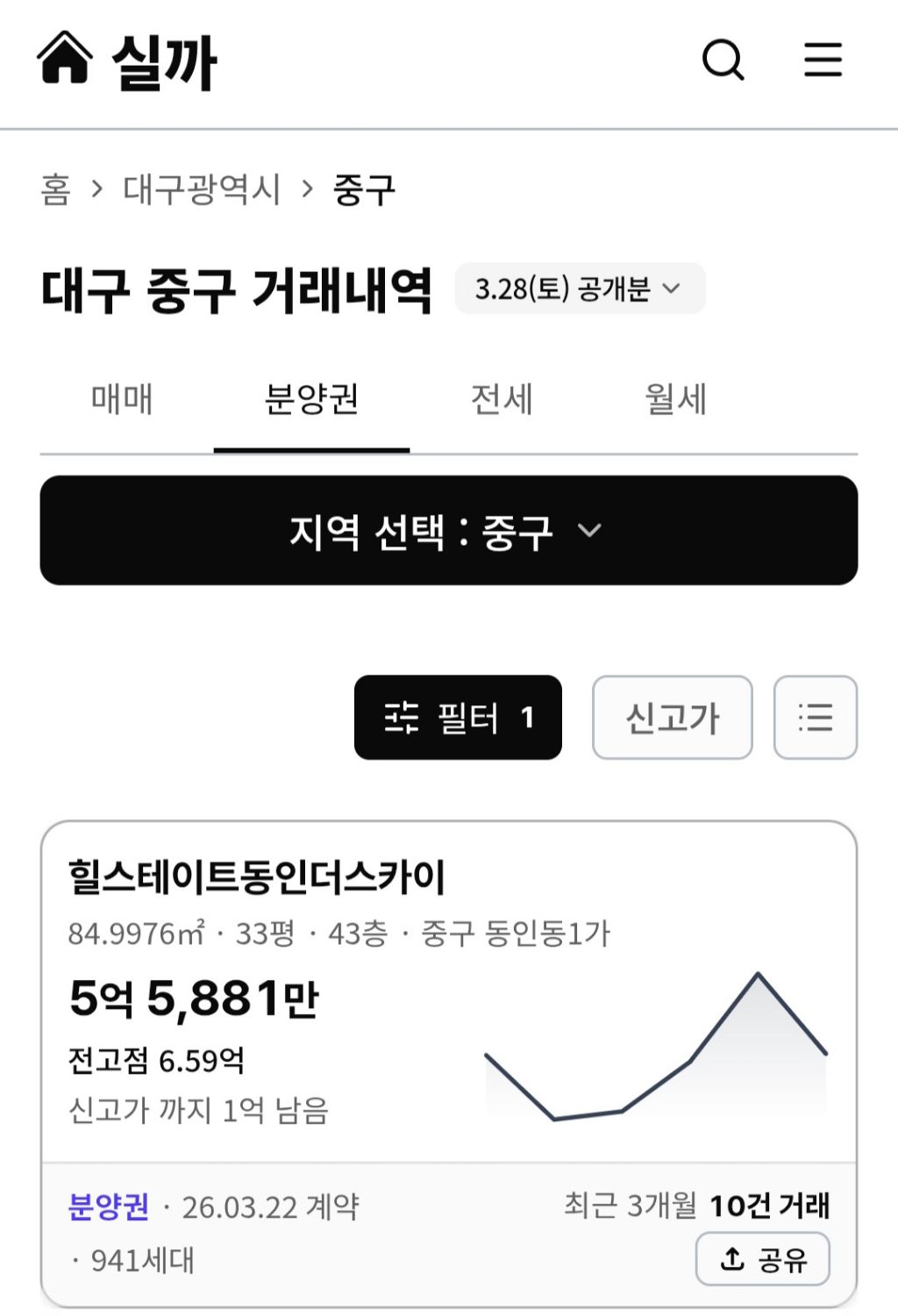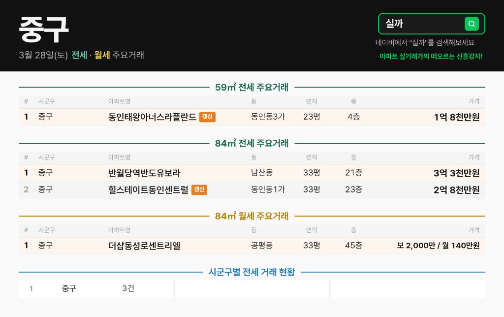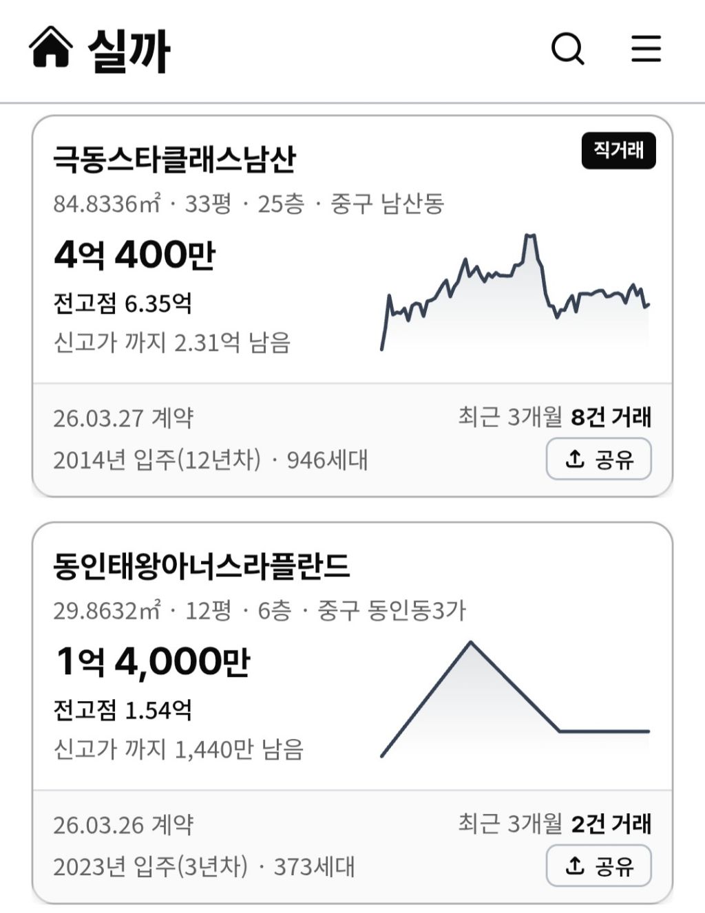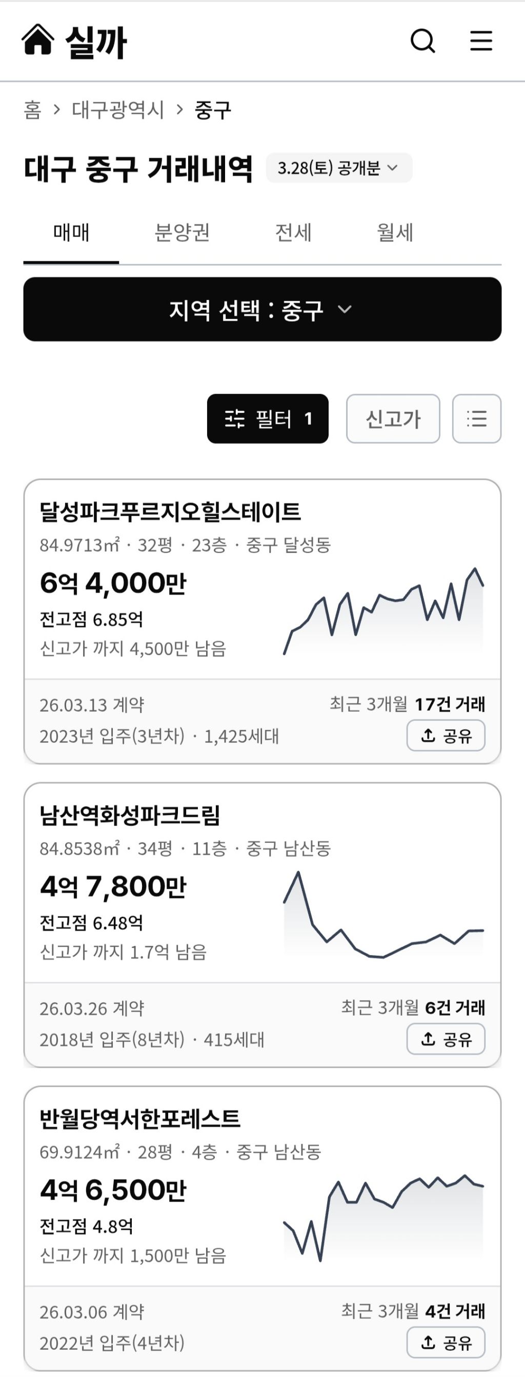 03.28 중구 실거래[매매 5건,분양권 1건] 작성자커버리지|작성시간26.03.28|조회수1,883 목록 댓글 2 글자크기 작게가 글자크기 크게가 출처https://silgga.com/region/27110중구 아파트 실거래가 — 오늘 공개 매매·전세·분양권중구 아파트 실거래가를 공개 즉시 반영. 매매 신고가, 전세, 월세, 분양권 거래내역과 시세 추이를 한눈에 확인하세요.silgga.com 다음검색 현재 게시글 추가 기능 열기 북마크 공유하기 신고 센터로 신고 댓글 댓글 2 댓글쓰기 답글쓰기 댓글 리스트 작성자미투m | 작성시간 26.03.28 감사합니다^^ 작성자아이리스shine | 작성시간 26.03.28 감사합니다. 오늘은중구 전역에 걸쳐 골고루 거래 되었다고 보입니다. 댓글 전체보기