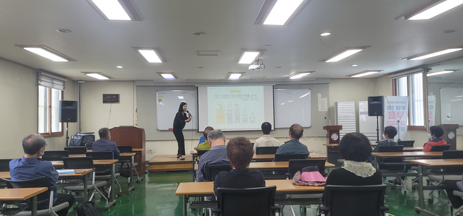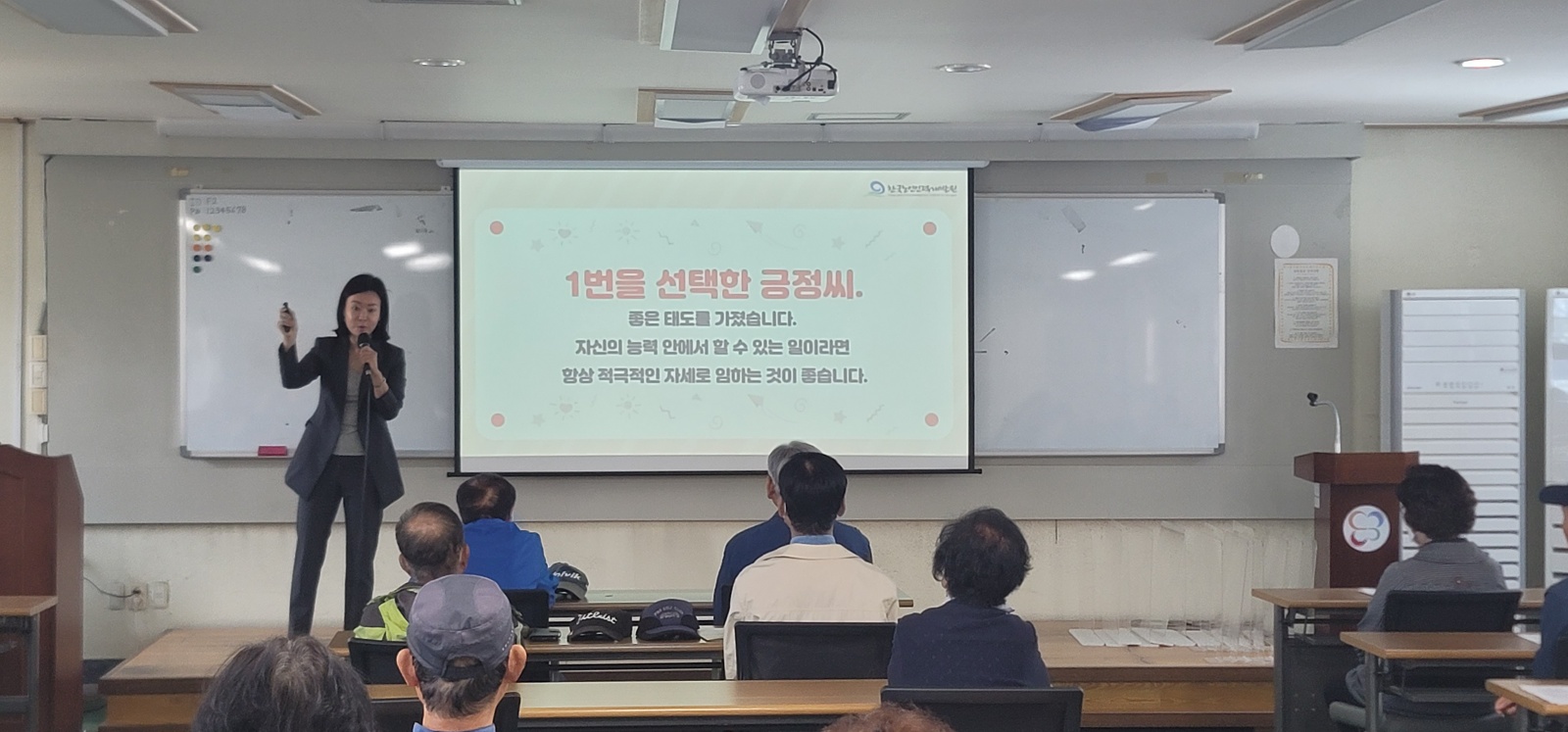 | 기간 : 23. 5. 11. (목) - 5. 12. (금) 장소 : 북구시니어클럽 2층 교육장 노인인력개발원 박혜담 강사님이 노인일자리 이해와 안전예방기본교육을 이틀에 걸쳐 교육해 주셨습니다. 열띤 강의와 알찬 내용으로 유익한 시간이셨길 바랍니다. |