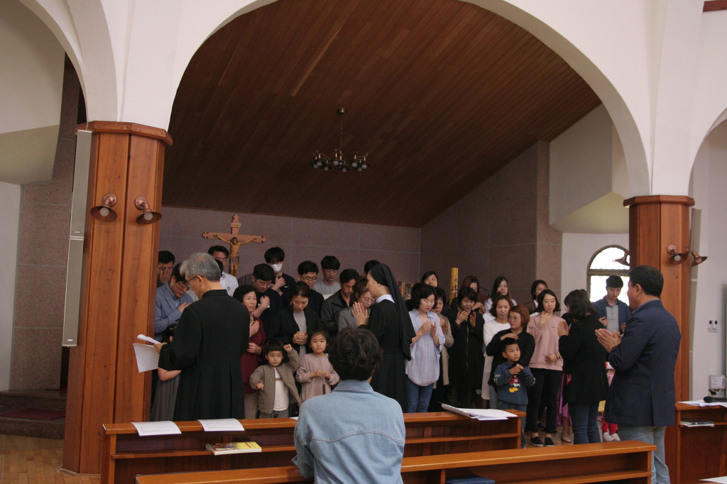 미사가 끝난 후 수녀님의 지휘 하에 다음 주에 있을 세례식을 위한 예행 연습이 있었습니다.