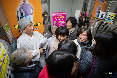 스님의 말에 1층에서 정토행자 몇 명이 더 탔습니다. 스님과 함께 엘리베이터를 탄 것을 한 분이 기뻐하며 말했습니다.