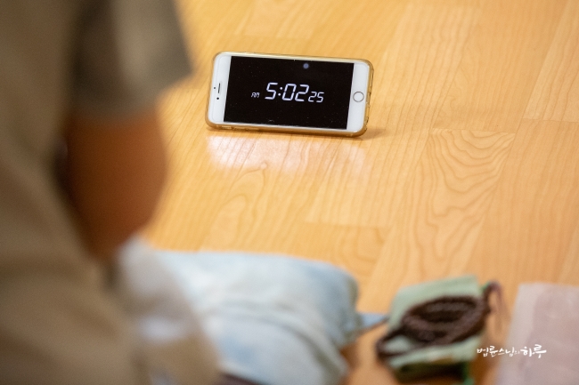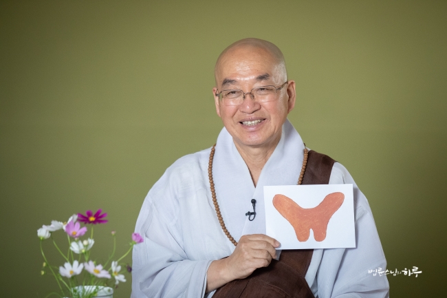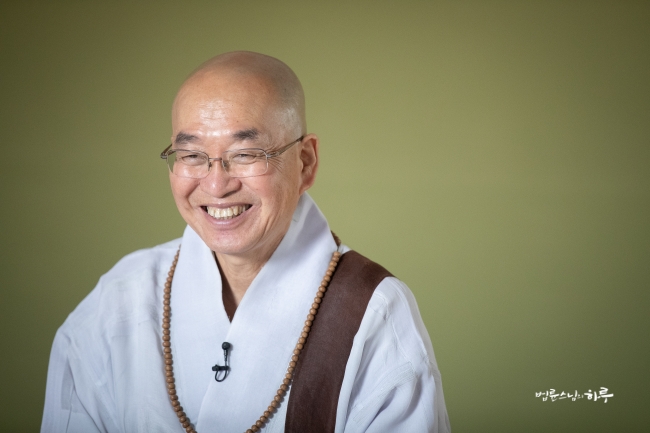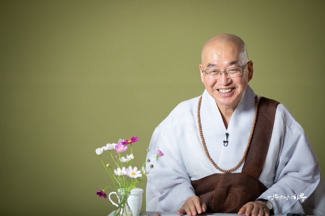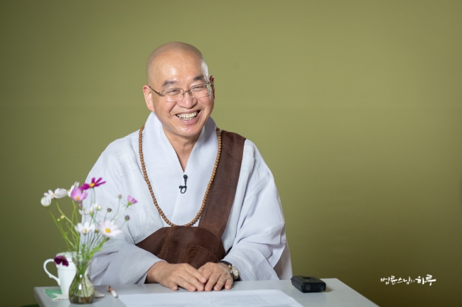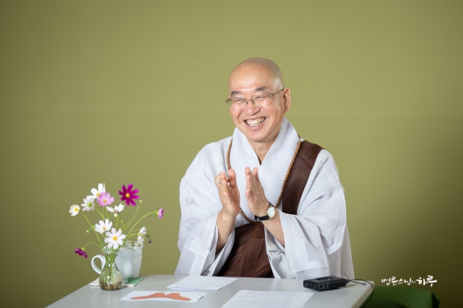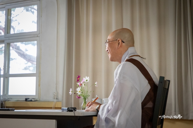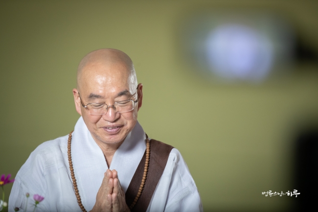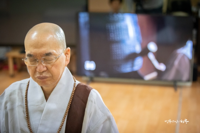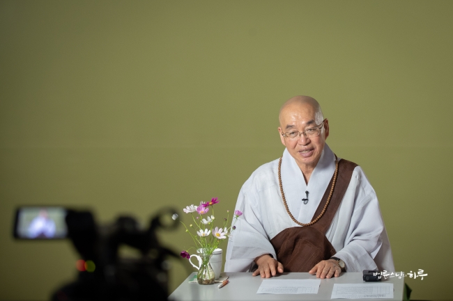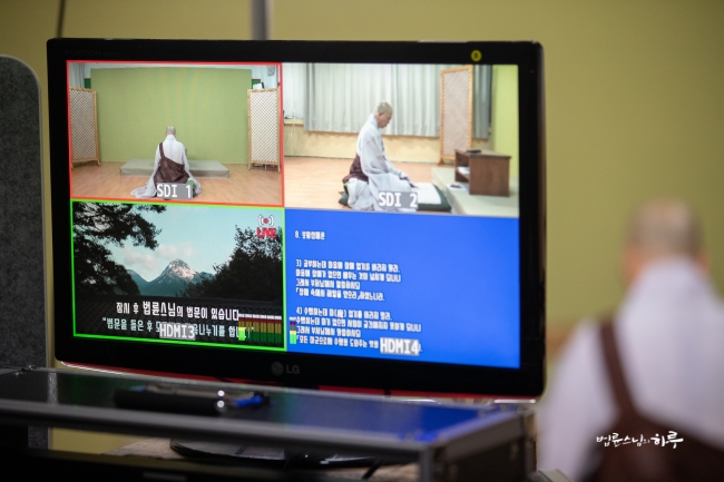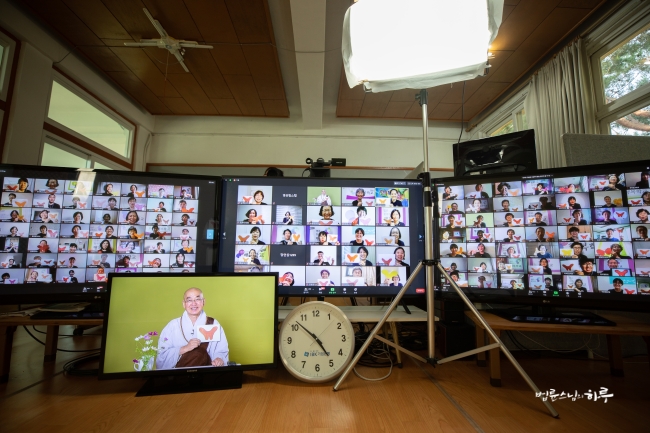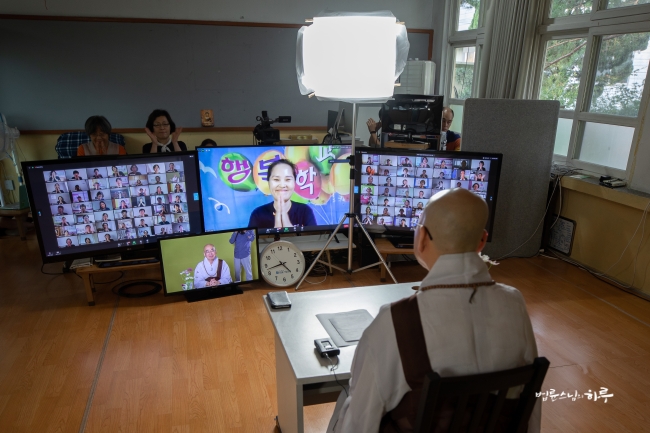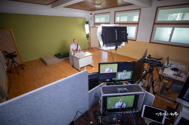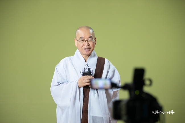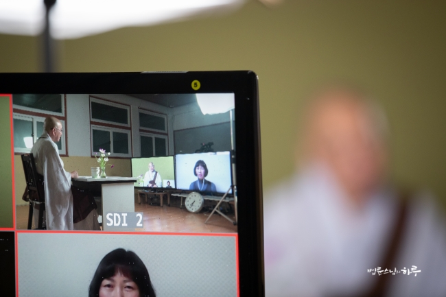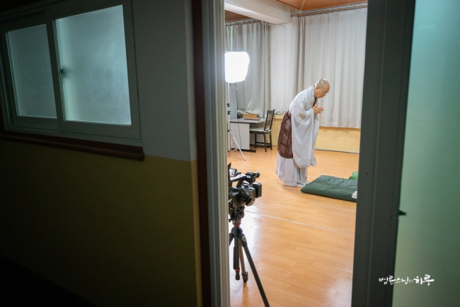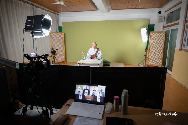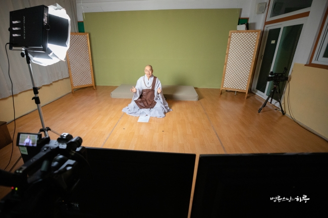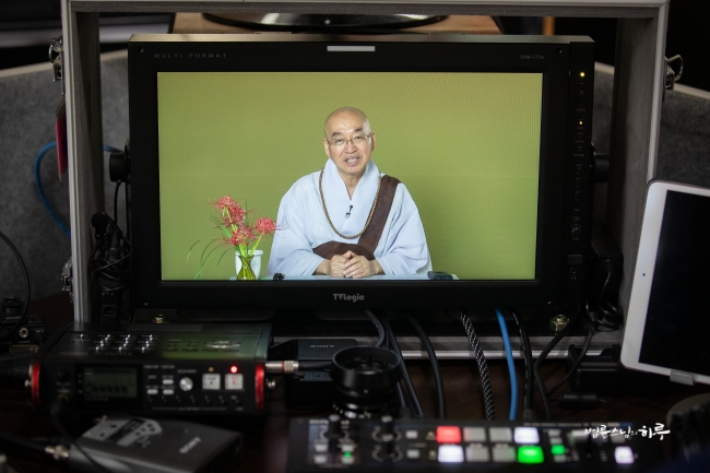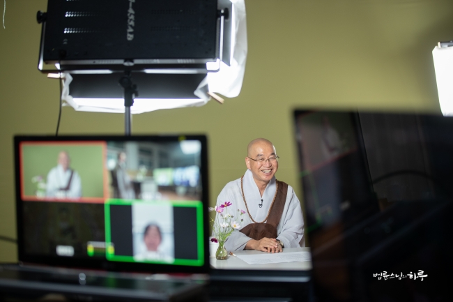 다시 카메라 앞에 앉은 스님은 하루 종일 연달아 계속되는 법문에도 불구하고 활짝 웃으며 법문을 했습니다.