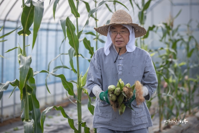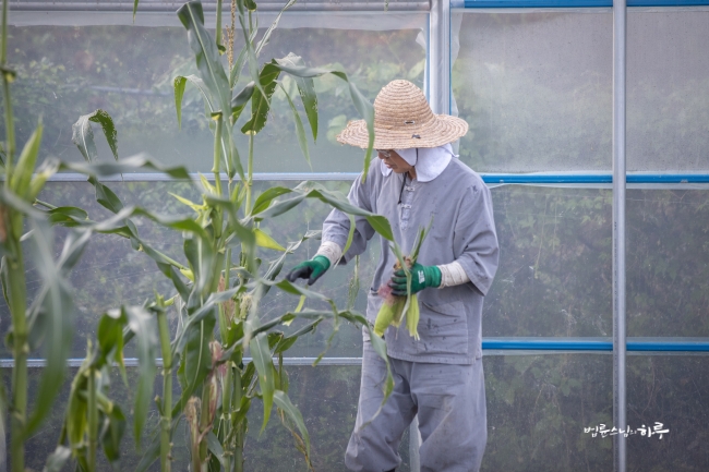 합장으로 인사를 한 후 방송을 마쳤습니다. 방송이 끝나자마자 스님은 작업복을 갈아입고 밭으로 나갔습니다. 오늘은 비닐하우스 4동에 옥수수를 다 땄습니다.