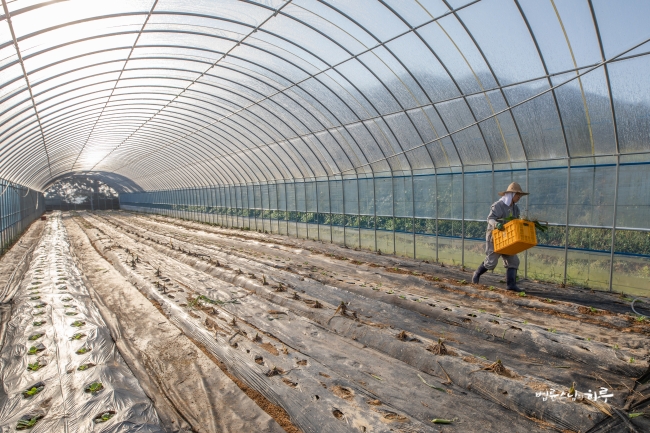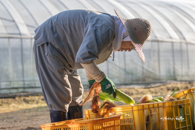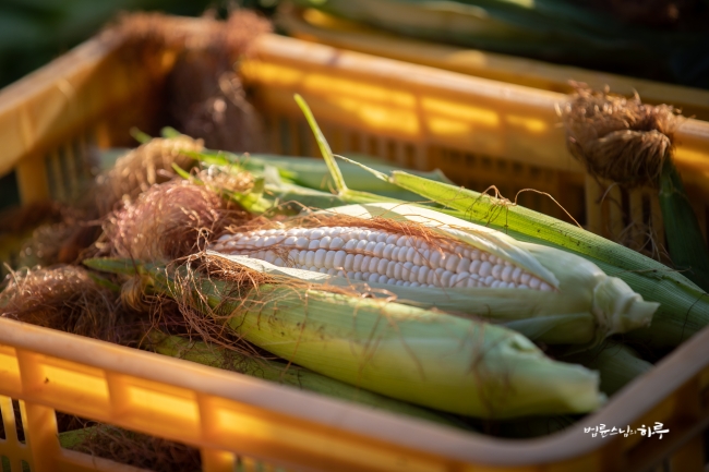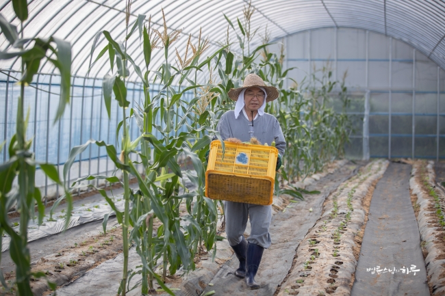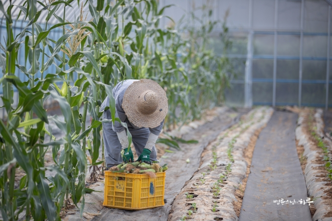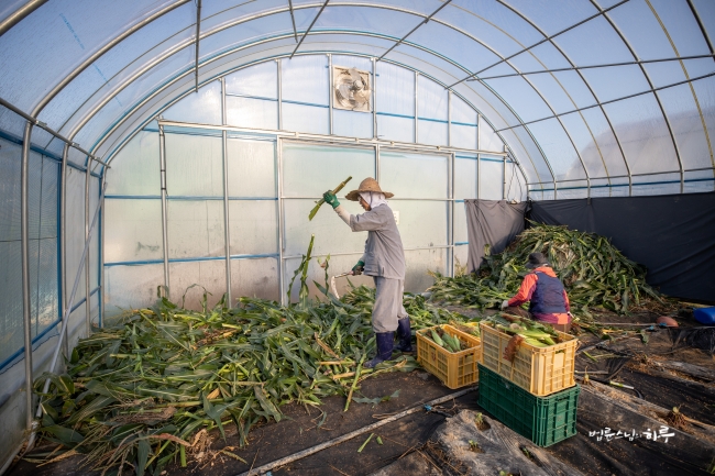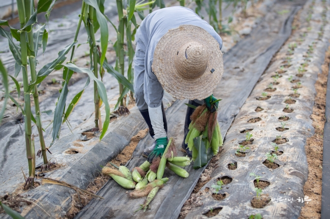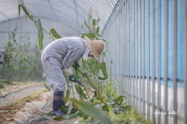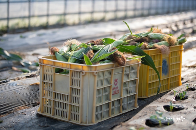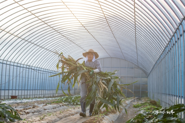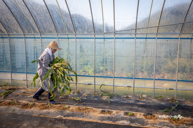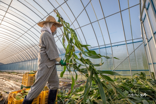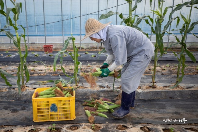 비닐하우스 앞에서부터 끝까지 옥수수를 쭉 따서 바닥에 놓은 뒤 끝에서부터 옥수수를 주우면서 나왔습니다.