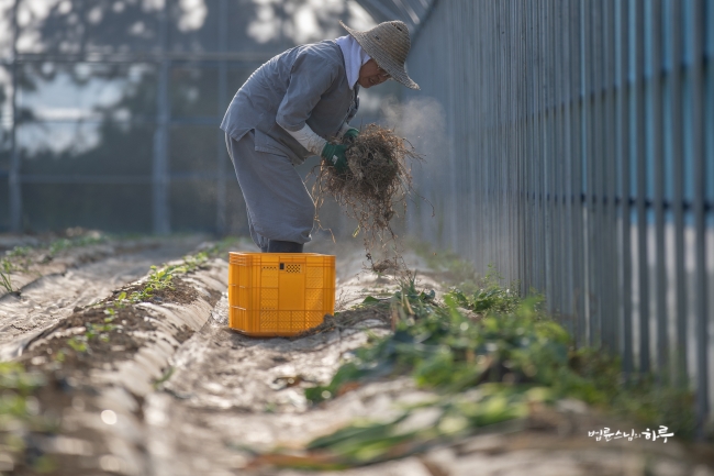 줄기는 비닐하우스 앞에서 툭툭 자른 후, 잘 마를 수 있도록 펴두었습니다.