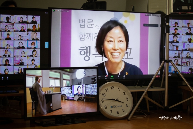 북한과의 관계 개선, 정토회의 온라인 전환에 따른 통일특위 활동의 방향, 행복시민, 행복센터에 대한 고민, 행복학교의 진행자로서의 마음가짐 등 다양한 질문에 대해 스님은 이해하기 쉽게 대답해 주었습니다. 모든 질문에 대해 답을 마치자 예정된 시간보다 30분이 지나있었습니다.