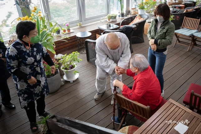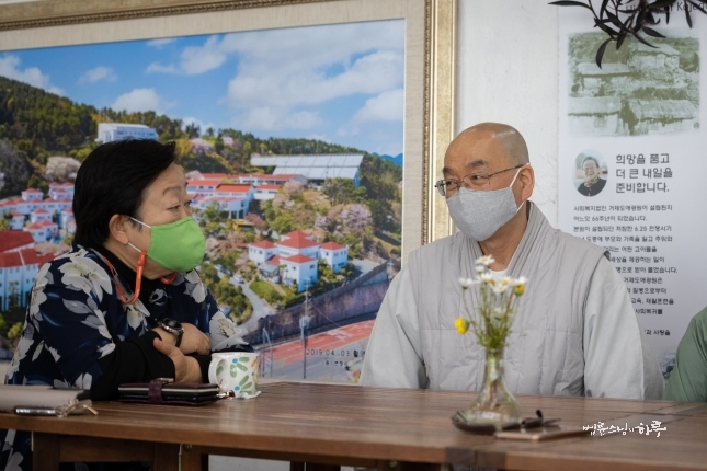 오늘은 애광원 교장선생님도 인사를 왔습니다. 처음 스님과 인사를 나눈 교장선생님은 어떻게 애광원과 인연이 된 것인지 물어보았습니다.