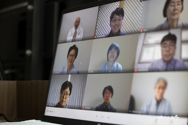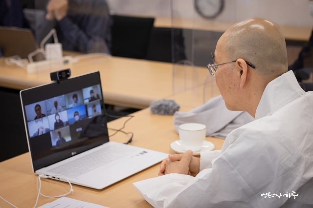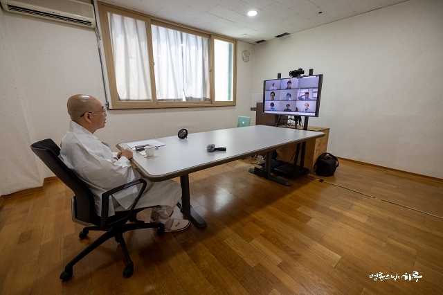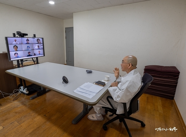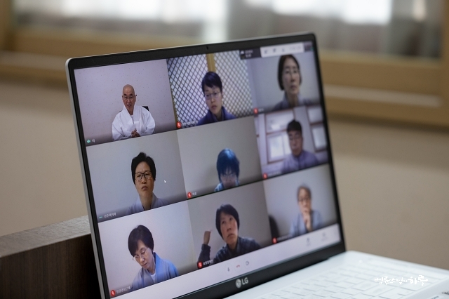 오전 9시 30분부터는 정토대전 사상팀을 맡고 있는 법사님들과 화상회의를 했습니다. 스님은 서울 정토회관에서, 법사님들은 각자의 처소에서, 각자 온라인으로 회의에 참석했습니다.