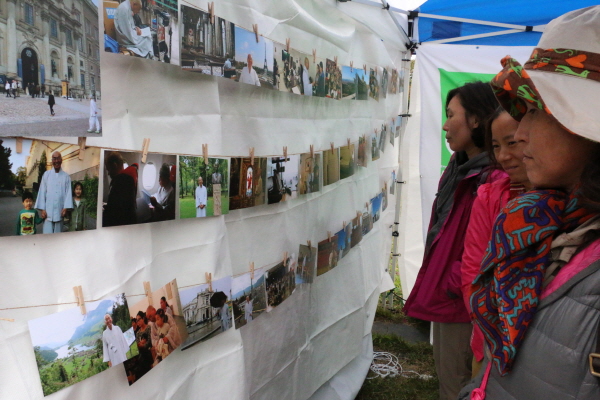 건너가 각자 싸온 도시락을 지역별로 앉아서 맛있게 먹었습니다. 물빛 공원에는 환경상품을 판매하는 부스, 스님의 이번 유럽 강연 사진을 전시하면서