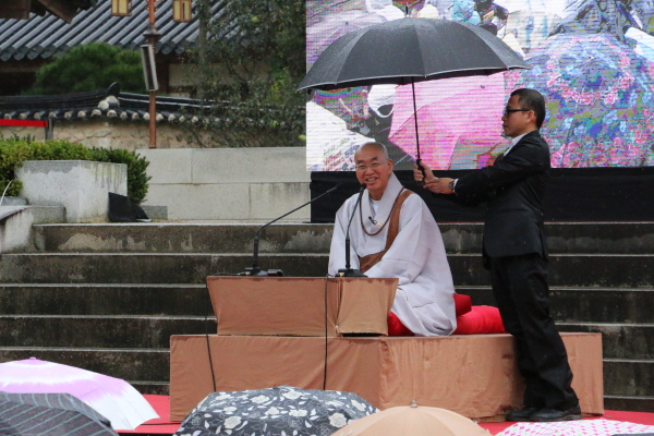 쏟아지기 시작하여 장내가 어수선해지기 시작했습니다. 비를 피해야 하나 말아야 하나 당황스런 상황이 되었는데, 스님께서는 비에 아랑곳하지 않고
