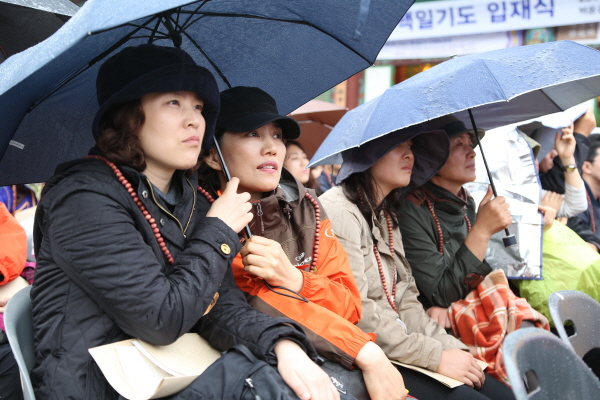 여여하게 3차 백일기도를 시작하는 입재 법문을 곧바로 이어서 하셨습니다. 대중들도 스님의 여법한 태도를 따라서 그냥 비를 맞기도 하거나, 모자를