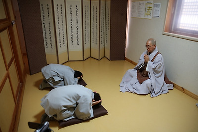 오늘 스님에게 인사를 하러 찾아온 행자님은 제8기 행자대학원 과정을 무사히 마치고 오늘 2월에 졸업을 하게 됩니다. 원래 처음 시작할 때는 7명이 함께 시작했지만 모두 도중에 그만두고 나가는 바람에 마지막으로 이 행자님 한 분만 끝까지 남아서 졸업을 하게 되었습니다. 먼저 행자반장과 졸업하는 행자님이 스님에게 삼배로 인사를 올렸습니다.