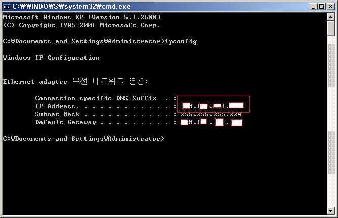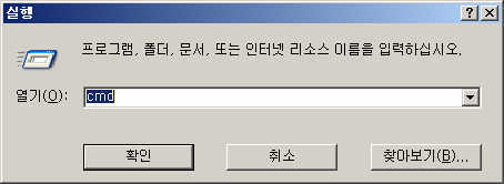 3. 실행창에서' CMD'입력 -> ipconfig 명령을 이용해서 아이피를 알아냅니다.
