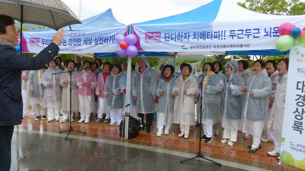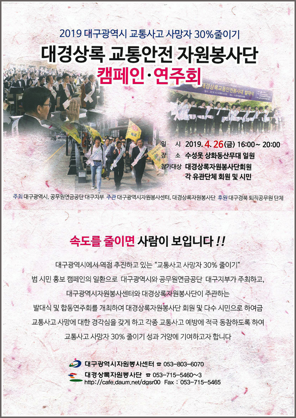공무원연금공단 대구지부(지부장 백동기) 대경상록자원봉사단(단장 최상순)은 대구광역시에서 역점 추진하고 있는 "교통사고 사망자 30% 줄이기" 범 시민 홍보 캠페인의 일환으로 대구광역시와 공무원연금공단 대구지부가 주최하고, 대구광역시자원봉사센터와 대경상록자원봉사단이 주관하는 발대식 및 합동연주회를 개최하여 대경상록자원봉사단 회원 및 다수 시민으로 하여금 교통사고 사망에 대한 경각심을 갖게하고 교통사고 예방에 적극 동참하도록하여 교통사고 사망 30% 줄이기 성과 거양에 기여하고자 4월 26일(금) 오후 4시에 상화동산에서 이슬비가 내리는 날씨에도 불구하고 회원 및 시민 500여 명이 참가하는 캠페인·연주회를 하였습니다.