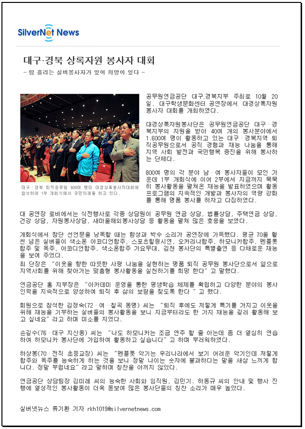 [인터넷신문] 실버넷 뉴스 - 대구경북 상록자원봉사자 대회 작성자연금공단 김효정|작성시간14.10.22|조회수35 목록 댓글 1 글자크기 작게가 글자크기 크게가 다음검색 현재 게시글 추가 기능 열기 북마크 공유하기 신고 센터로 신고 댓글 댓글 1 댓글쓰기 답글쓰기 댓글 리스트 작성자대경상록자원봉사단 | 작성시간 14.10.23 김미례팀장님의 멋진 사회 솜씨가 소문이 났습니다. 당일 안내와 진행에 적극적인 봉사를 하신 하동규팀장님 김민기팀장님 모든 분들과 함께 공무원연금공단대구경북지부의 힘이며 자랑이라 생각을 합니다. 최상순드림 댓글 전체보기