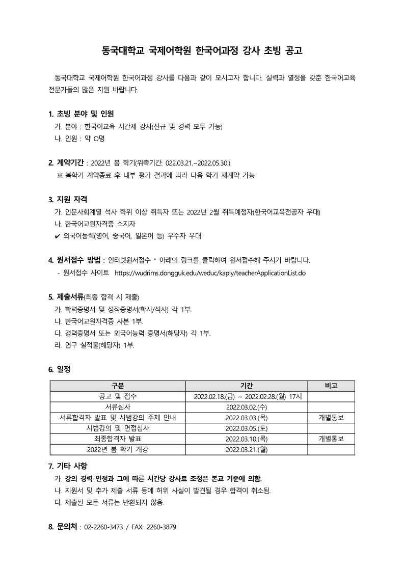 동국대학교 국제어학원 한국어과정 강사 초빙 공고(2/18~2/28 17:00) 작성자최은경|작성시간22.02.17|조회수105 목록 댓글 0 글자크기 작게가 글자크기 크게가 동국대학교해당 사이트는 다음 브라우저에 최적화 되었습니다.아래 버전이 아닌 브라우저에서는 사용이 원활하지 않을 수 있습니다. (최적화 브라우저 버전 : Internet Explorer 10+, FireFox 2.2+, Chrome 28+, Opera 15+, wudrims.dongguk.edu강사채용공고문_2022년 봄_.pdf70.26KB 첨부파일첨부된 파일이 2개 있습니다. pdf 파일 강사채용공고문_2022년 봄_.pdf 다운로드 jpg 파일 강사채용공고문_2022년 봄__1.jpg 다운로드 다음검색 현재 게시글 추가 기능 열기 북마크 공유하기 신고 센터로 신고 댓글 댓글 0 댓글쓰기 답글쓰기 댓글 리스트