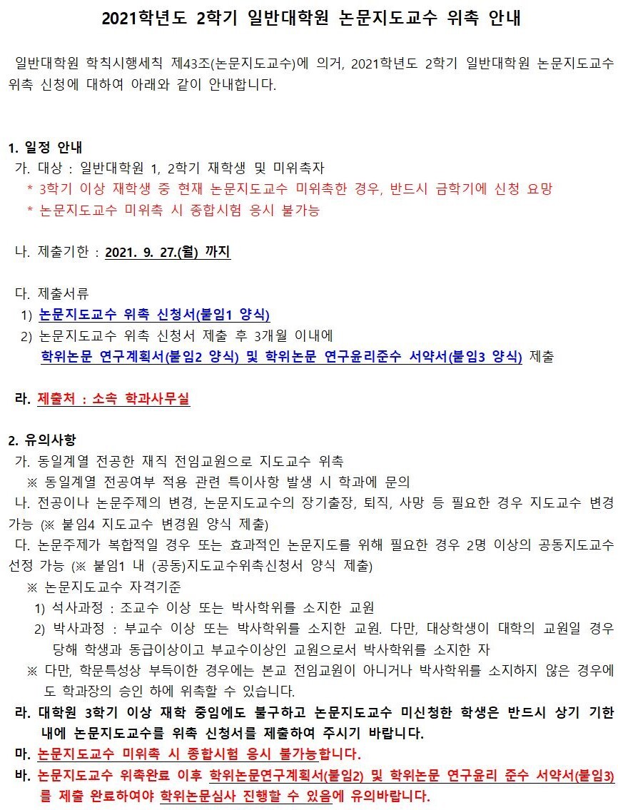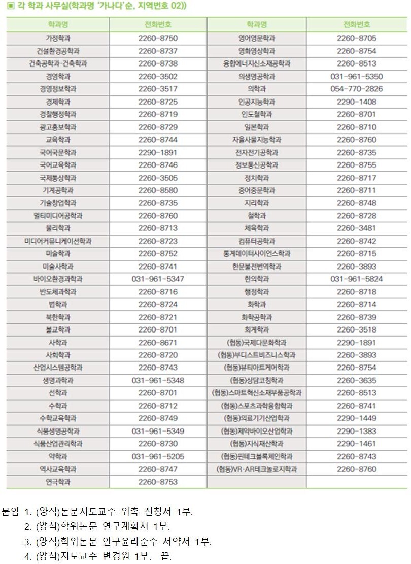 [전체]2021-2학기 일반대학원 논문지도교수 위촉 안내 작성자왕중기|작성시간21.09.03|조회수241 목록 댓글 0 글자크기 작게가 글자크기 크게가 https://gs.dongguk.edu/?page_id=18518&uid=15214191&mod=document2021-2학기 일반대학원 논문지도교수 위촉 안내 gs.dongguk.edu 4.지도교수변경원.hwp11.00KB3.학위논문연구윤리준수서약서.hwp12.50KB2.학위논문연구계획서.hwp14.50KB1.논문지도교수위촉신청서.hwp14.00KB 첨부파일첨부된 파일이 6개 있습니다. jpg 파일 5002-1.jpg 다운로드 jpg 파일 5001-3.jpg 다운로드 hwp 파일 4.지도교수변경원.hwp 다운로드 hwp 파일 3.학위논문연구윤리준수서약서.hwp 다운로드 hwp 파일 2.학위논문연구계획서.hwp 다운로드 hwp 파일 1.논문지도교수위촉신청서.hwp 다운로드 다음검색 현재 게시글 추가 기능 열기 북마크 신고 센터로 신고 댓글 댓글 0 댓글쓰기 답글쓰기 댓글 리스트