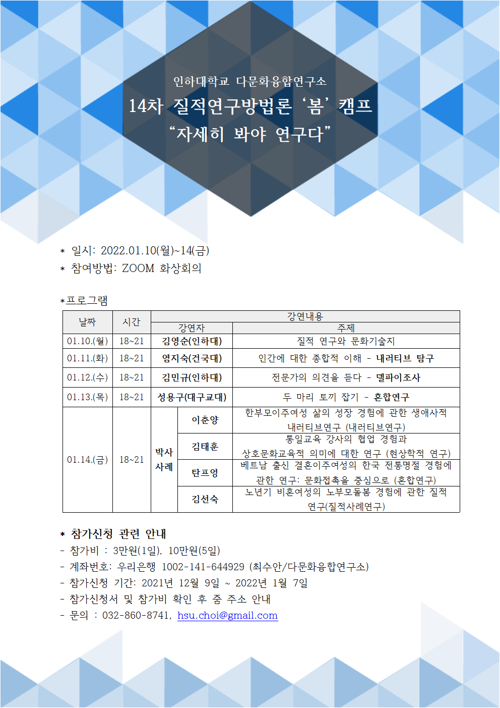 인하대학교 다문화융합연구소에서 14차 질적연구방법론 '봄'캠프를 온라인으로 주최합니다.