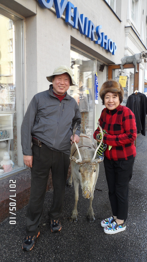 순록 털로 만든 모자를 쓰고...순록 앞에서...내 모자를....대신 춥다고...