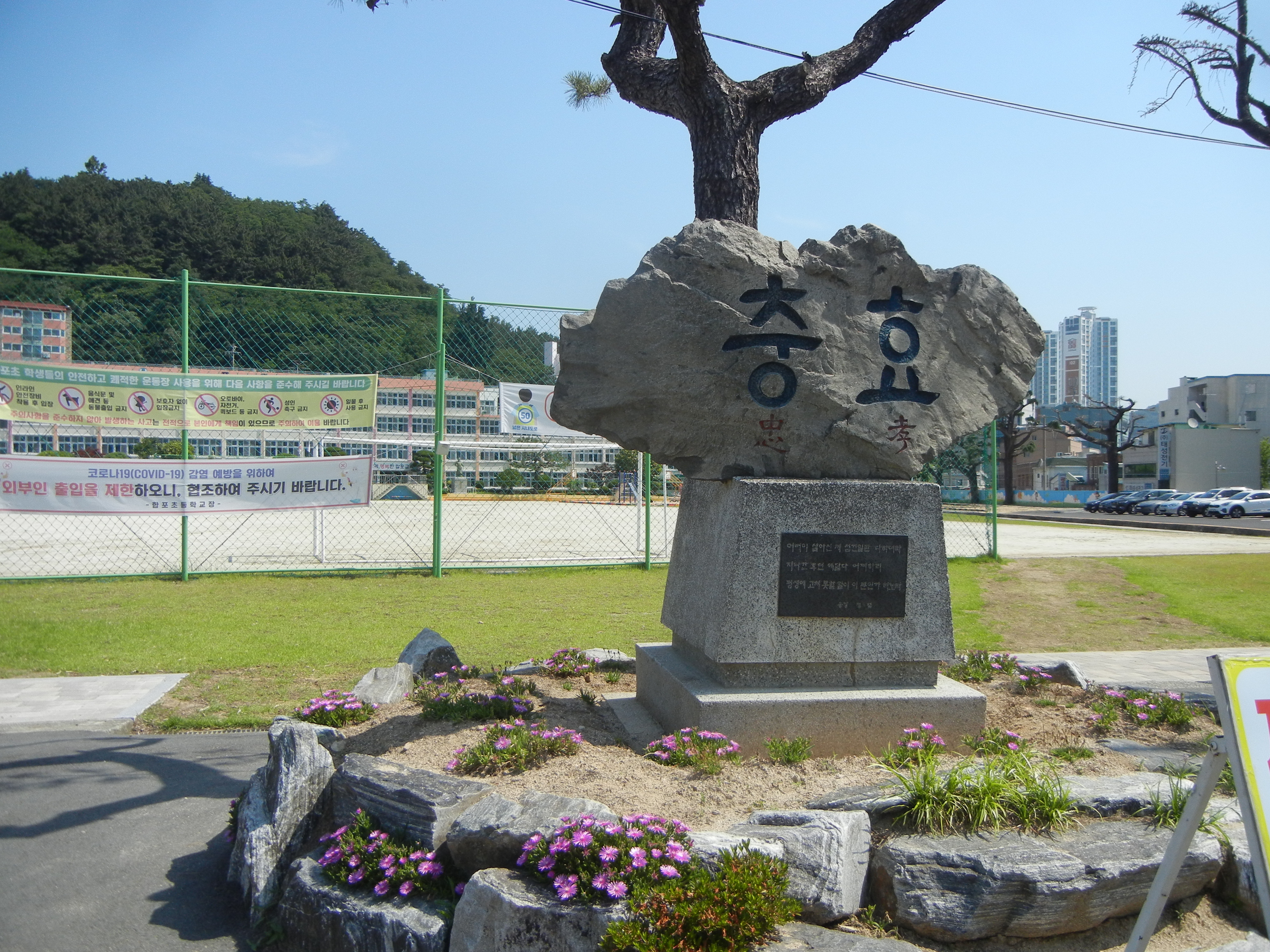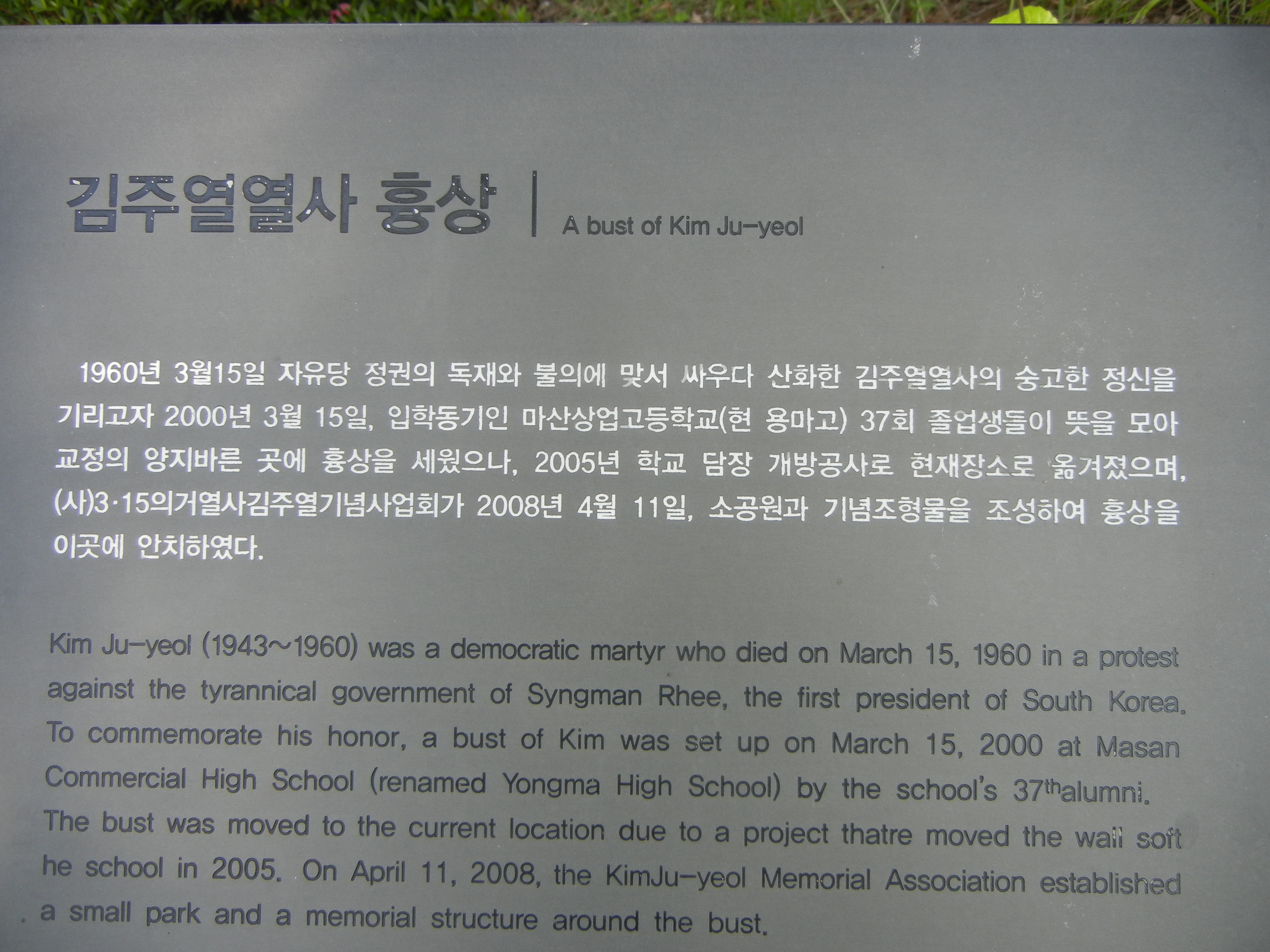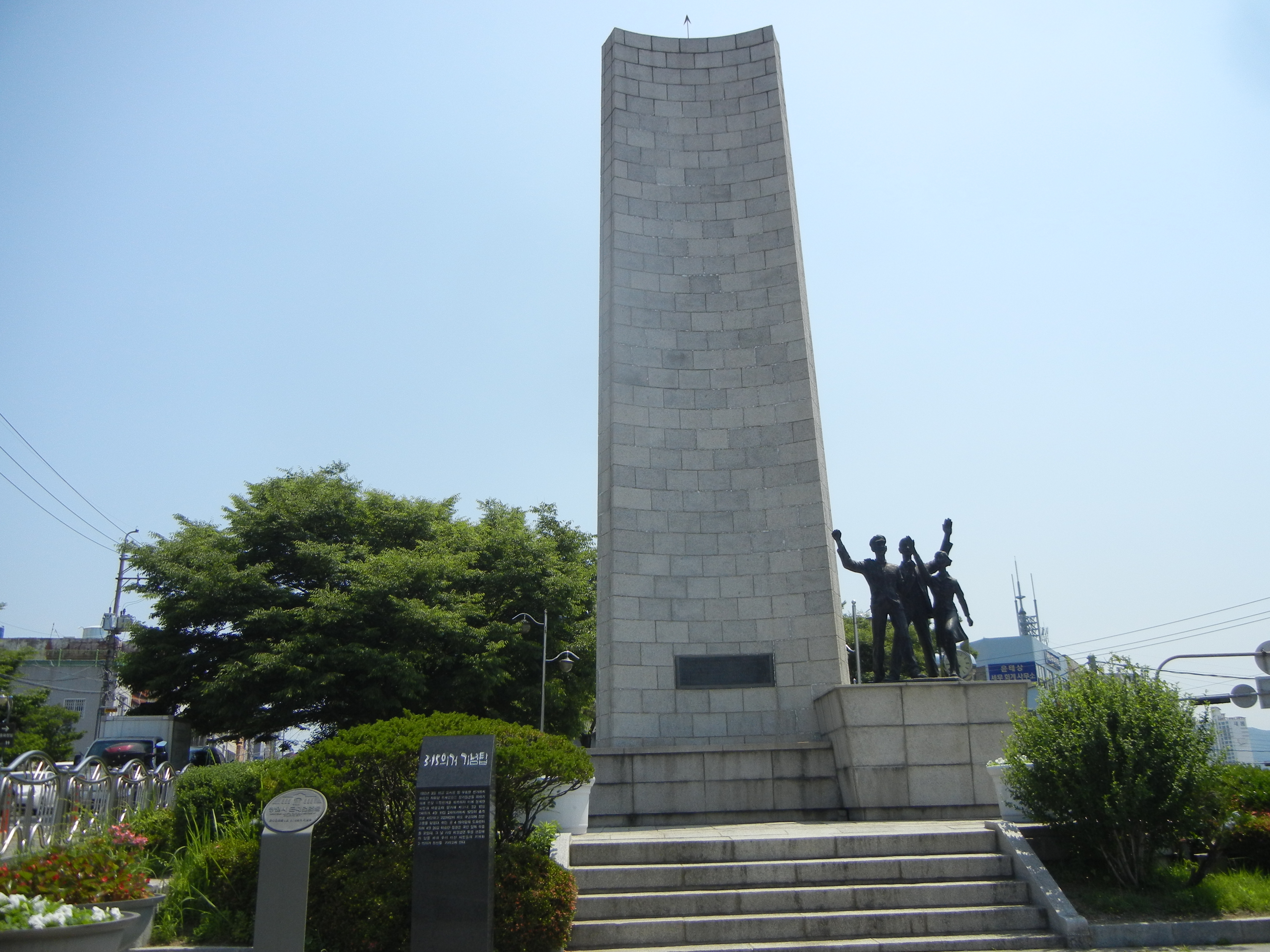 합포초등학교 앞의 충효비를 지나면 마산민주화의 상징인 김주열열사츙상비 앞에서 묵념. 뒤쪽은 용마고교.