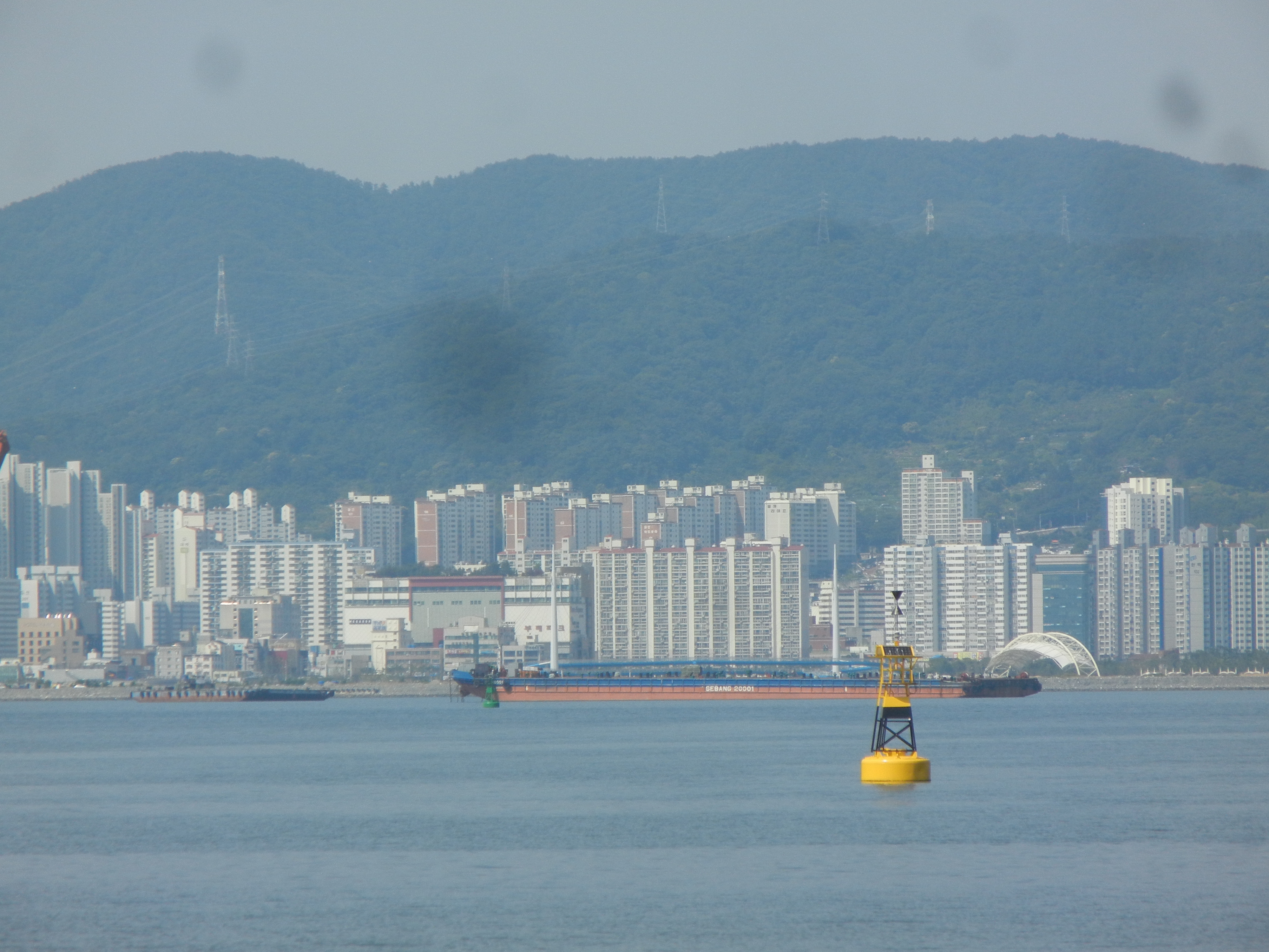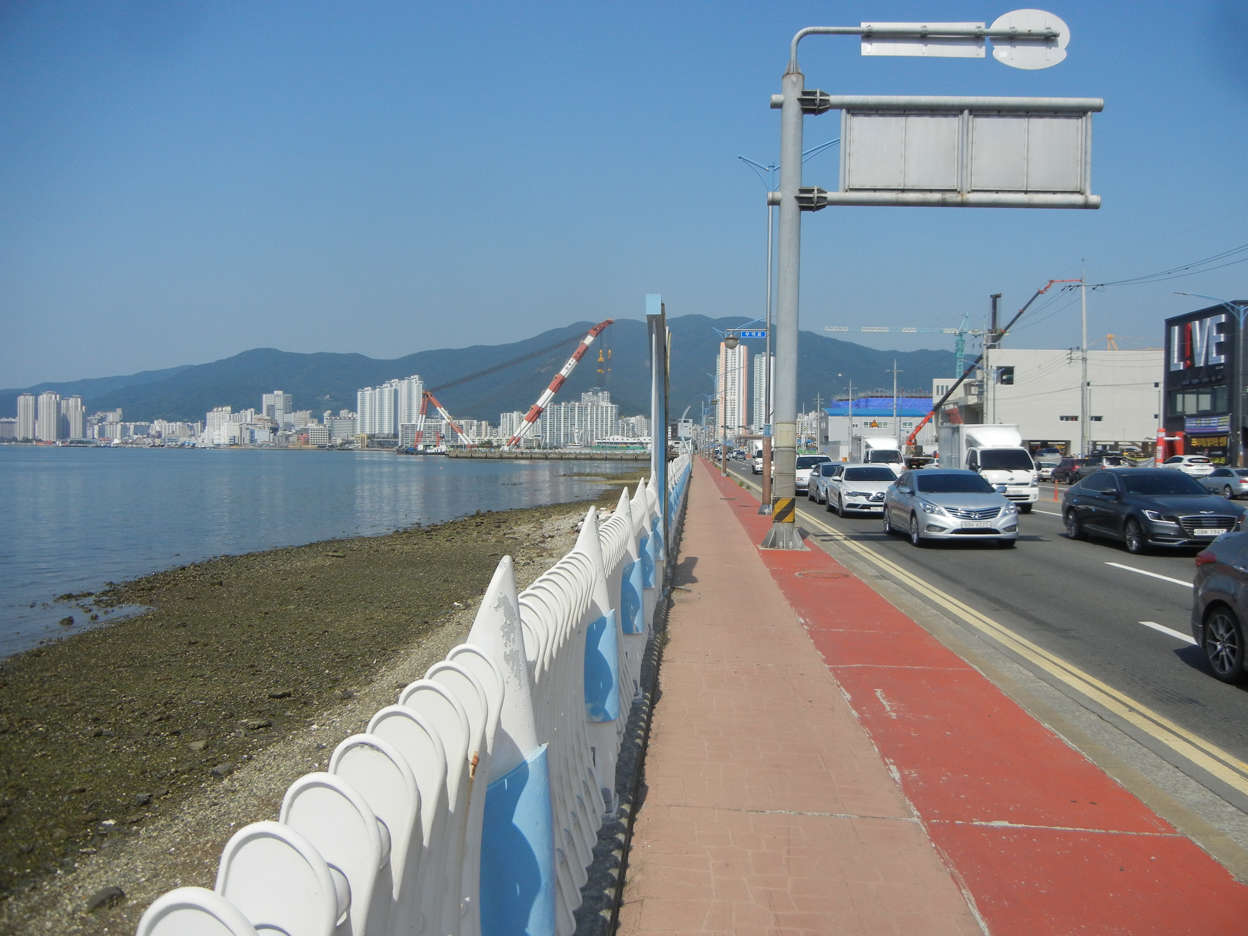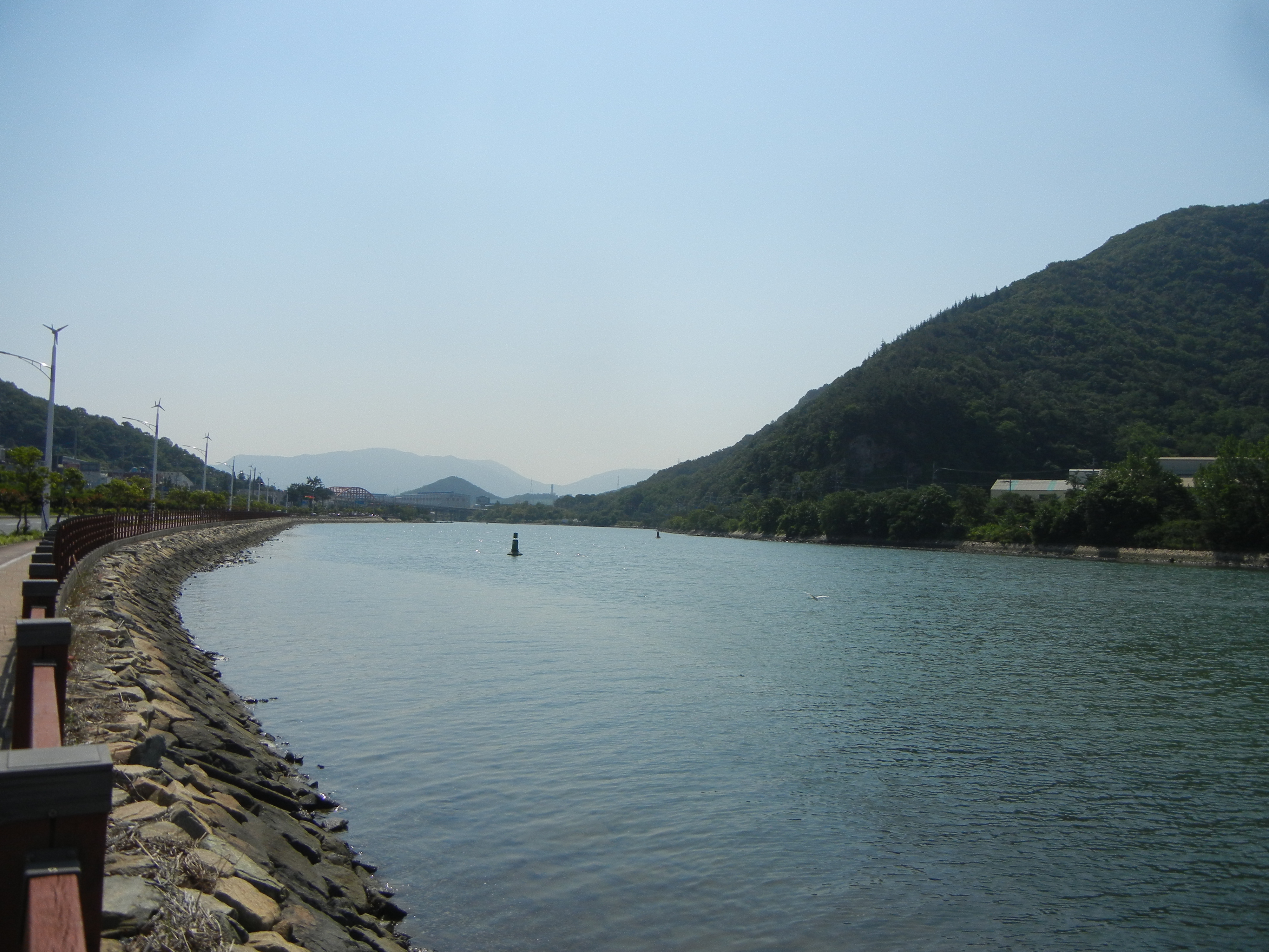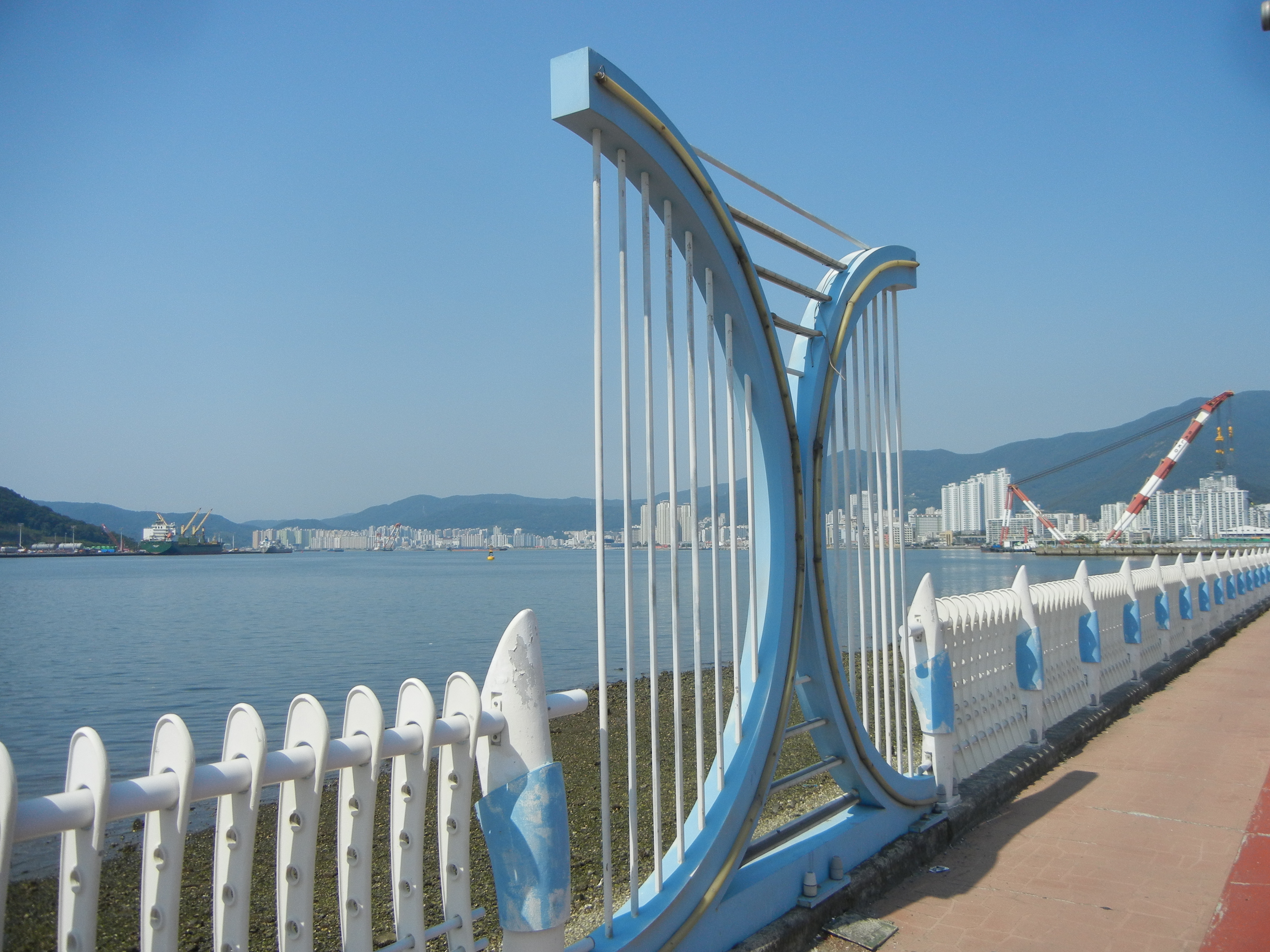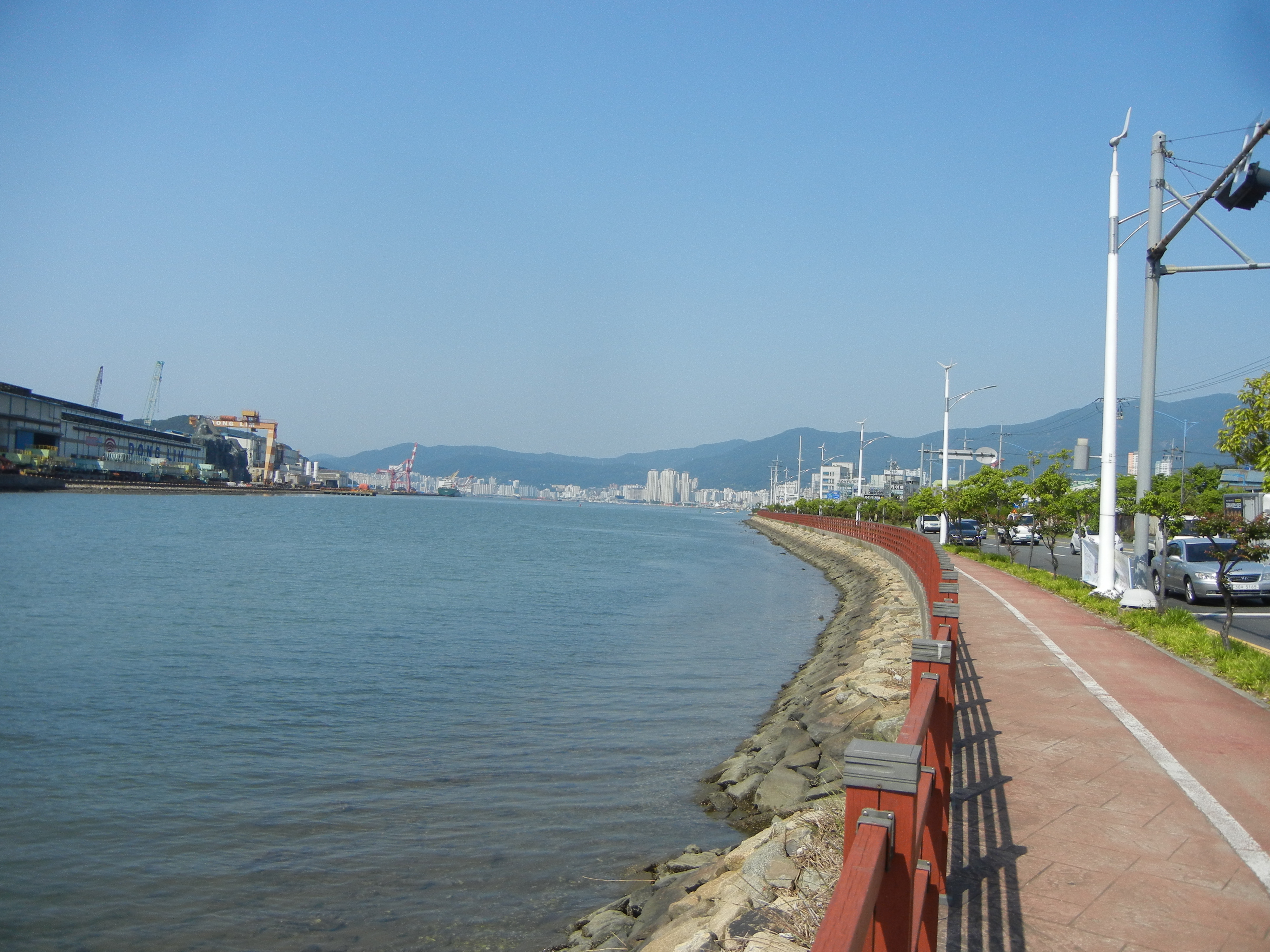 다리에서 좌측으로 꺾어 마산만산책로 항만변따라 진행.