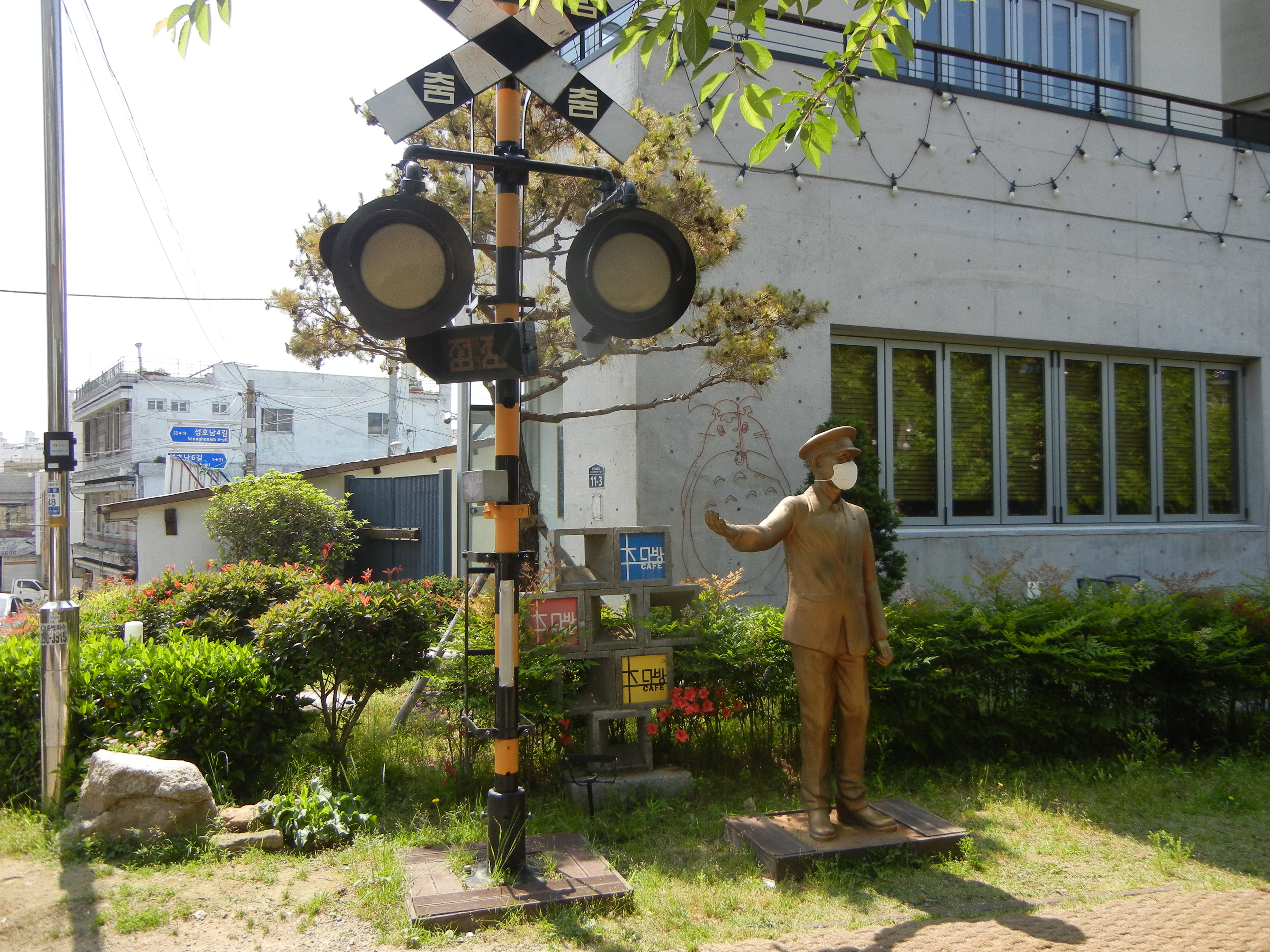 철로 건널목에 신호등과 역무원상을 세워놓았다. 마스크착용이 시대상황을 반영한다.