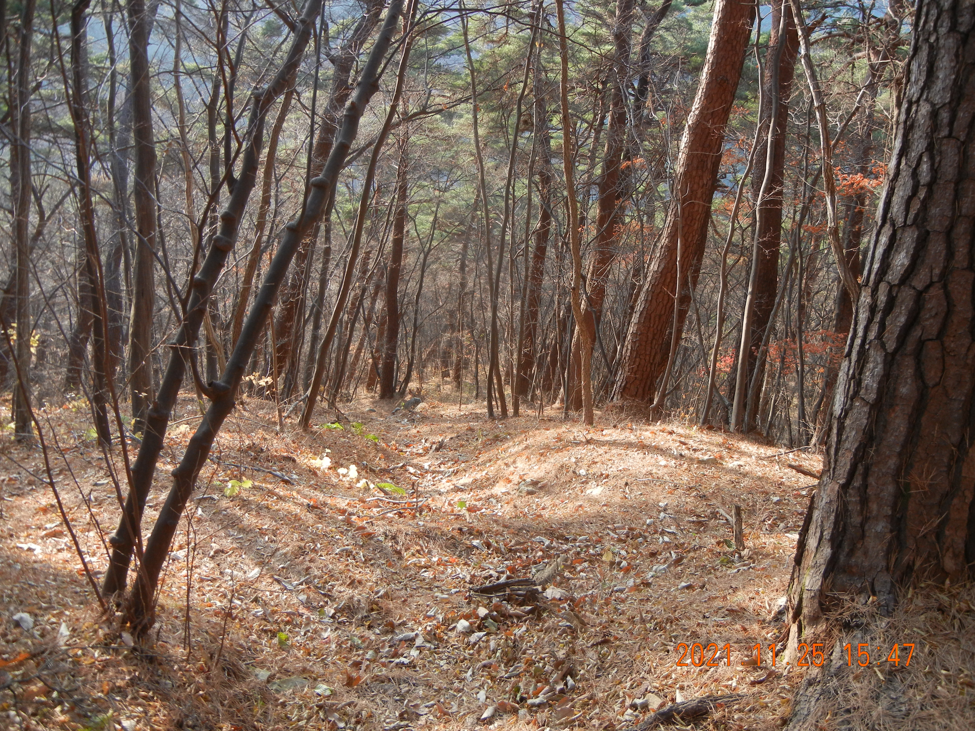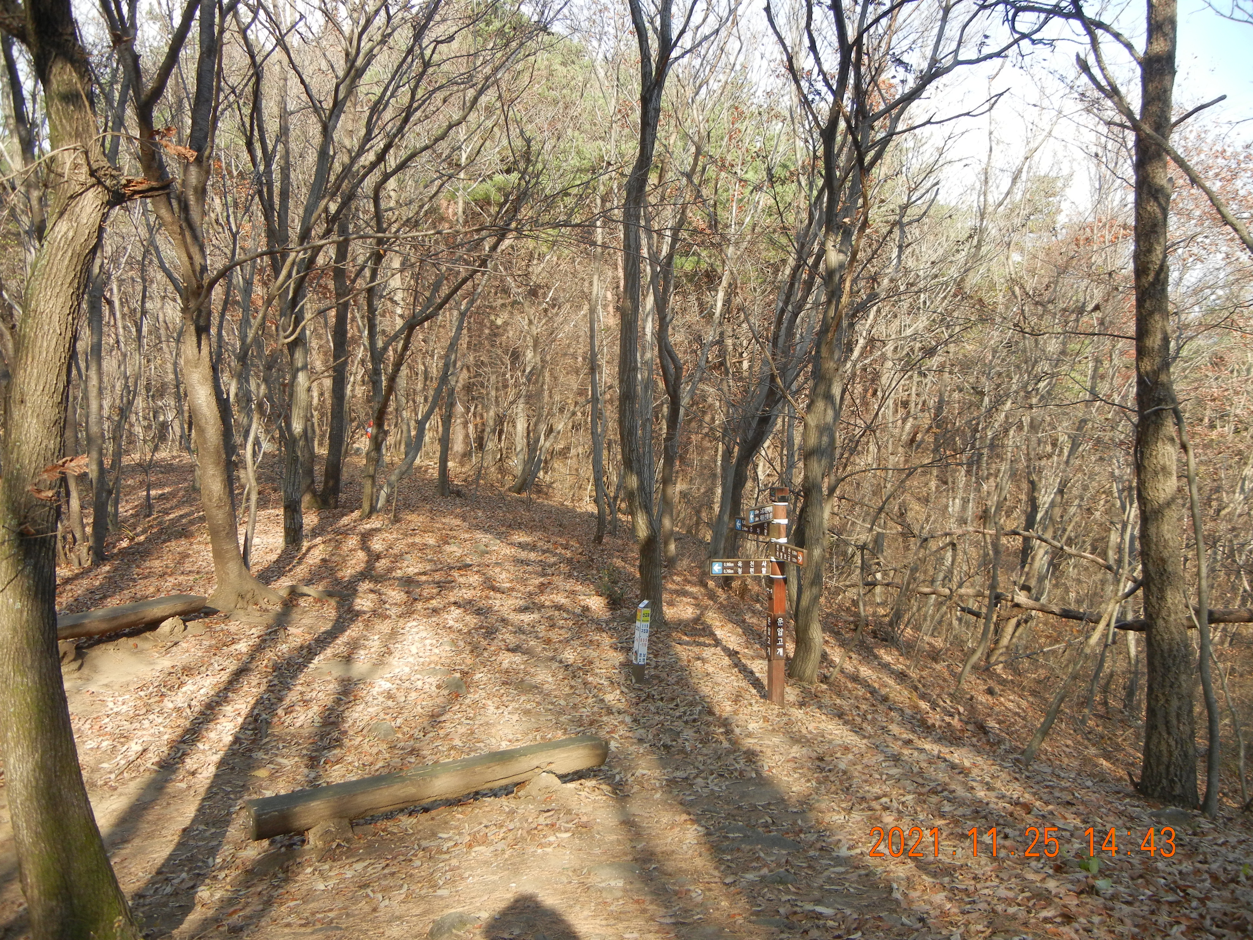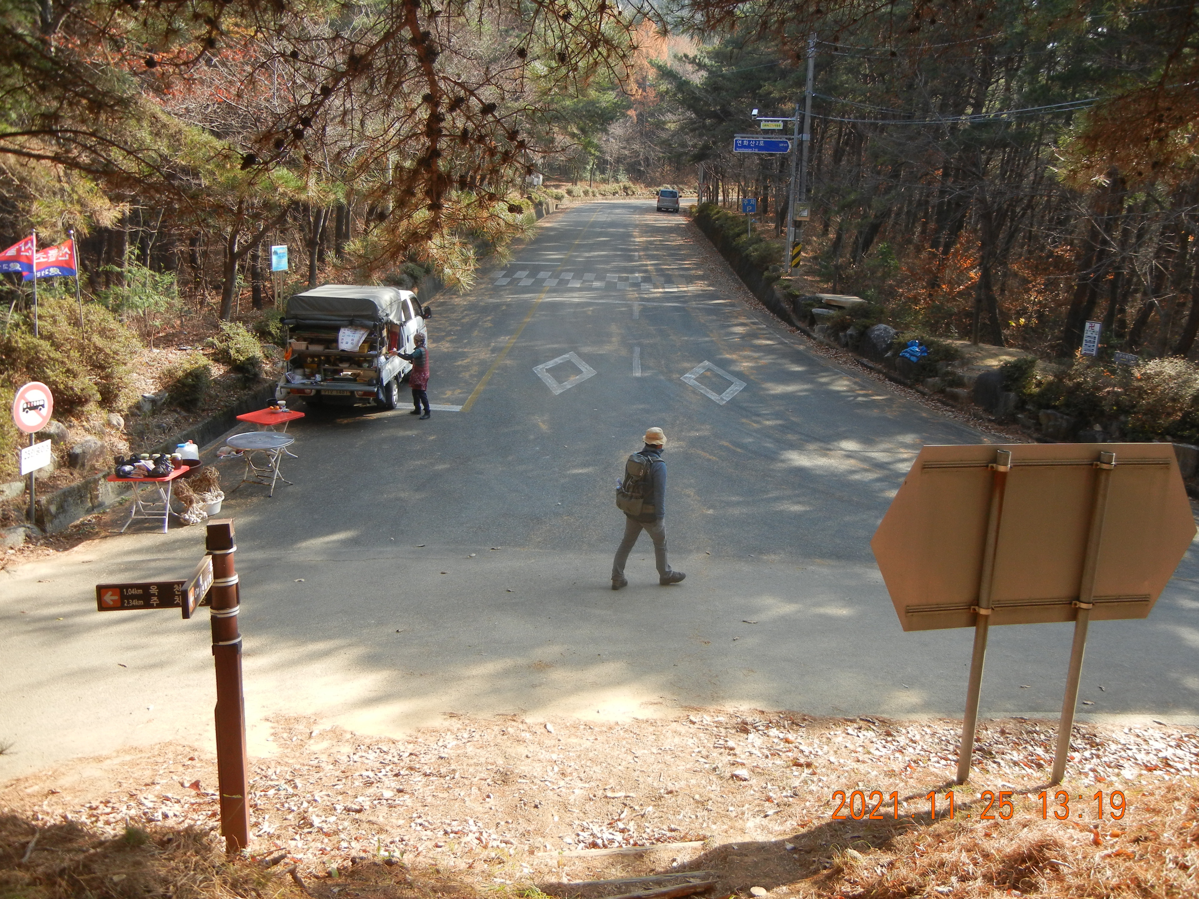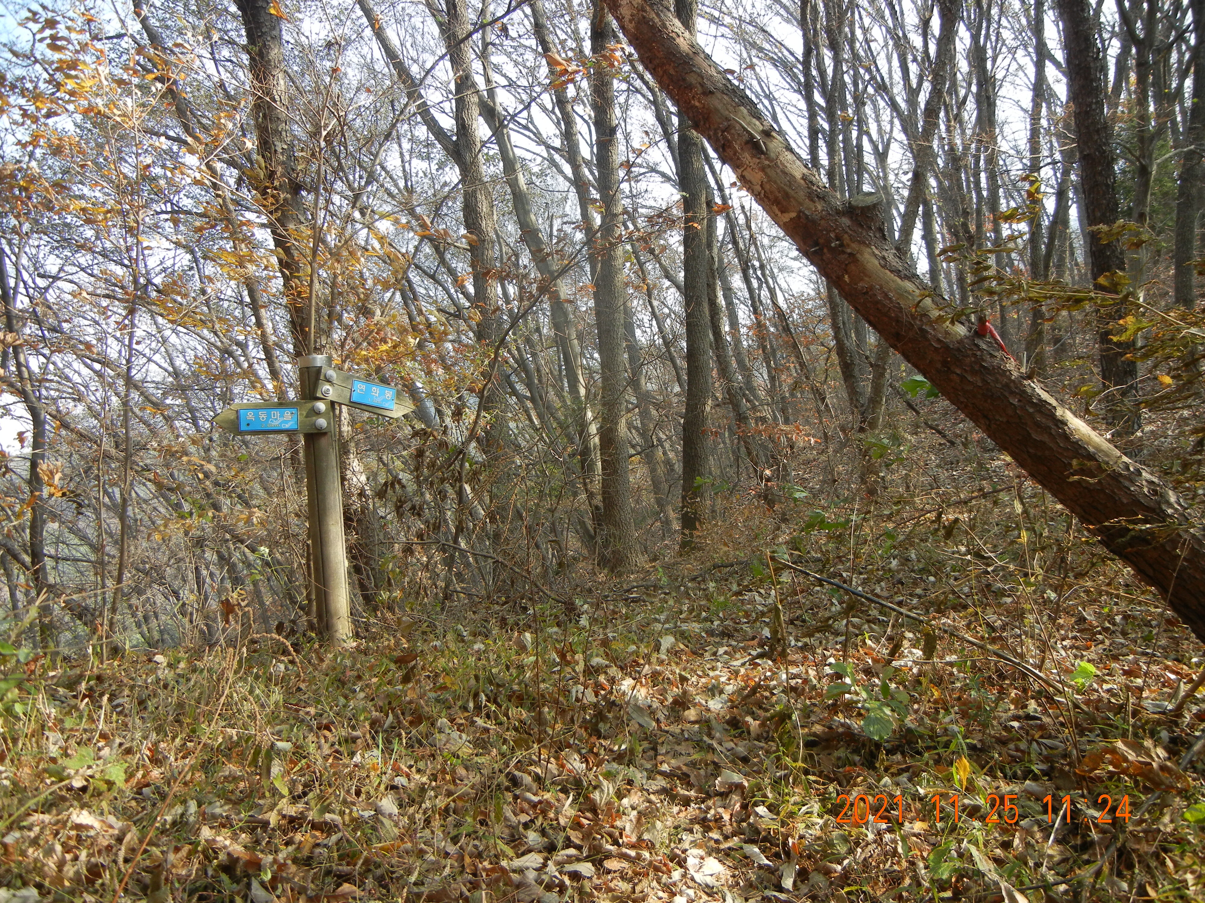 - 산불초소옆 또는 도로표지 뒤 입산들머리-낙엽 오르막-