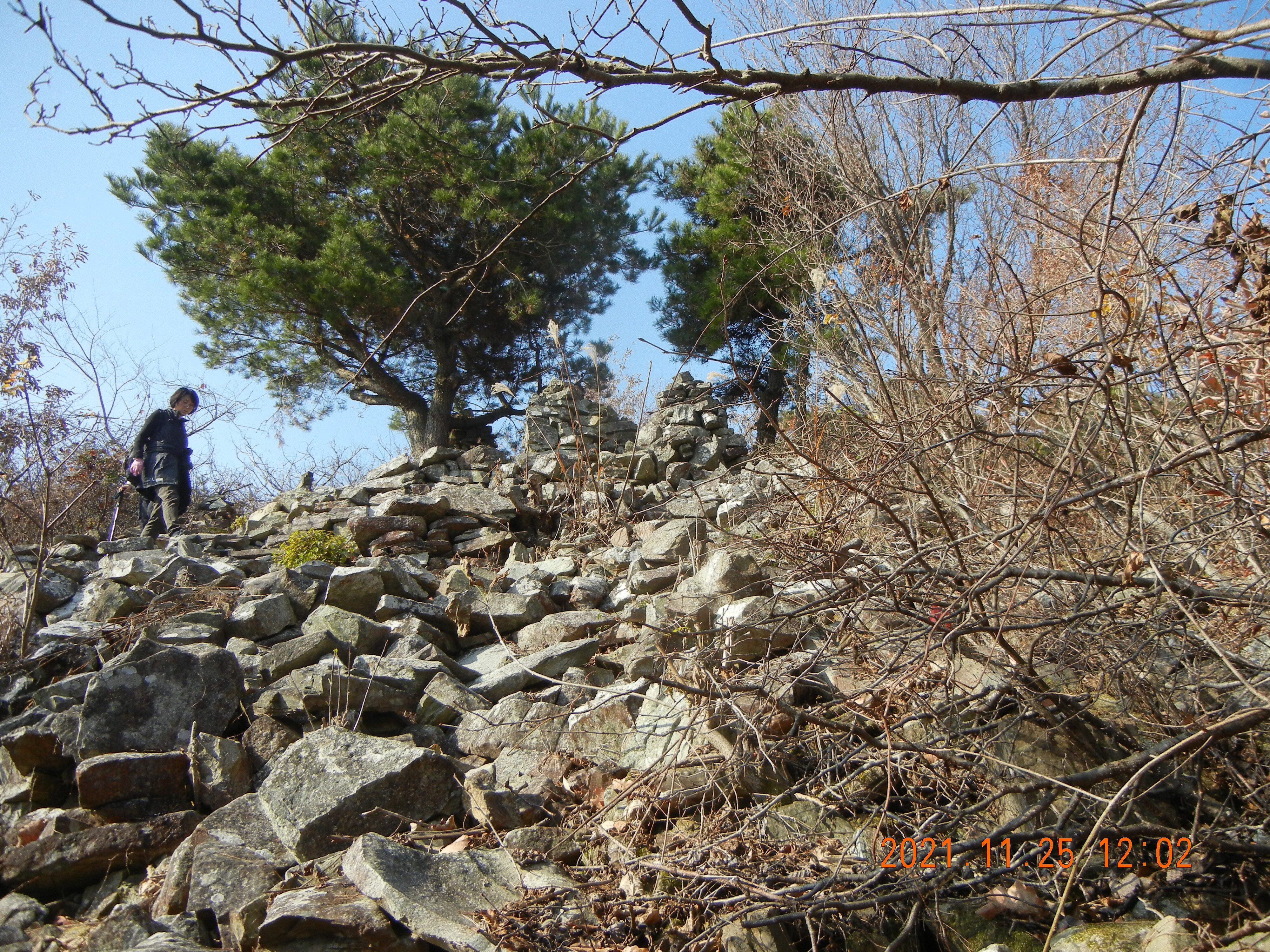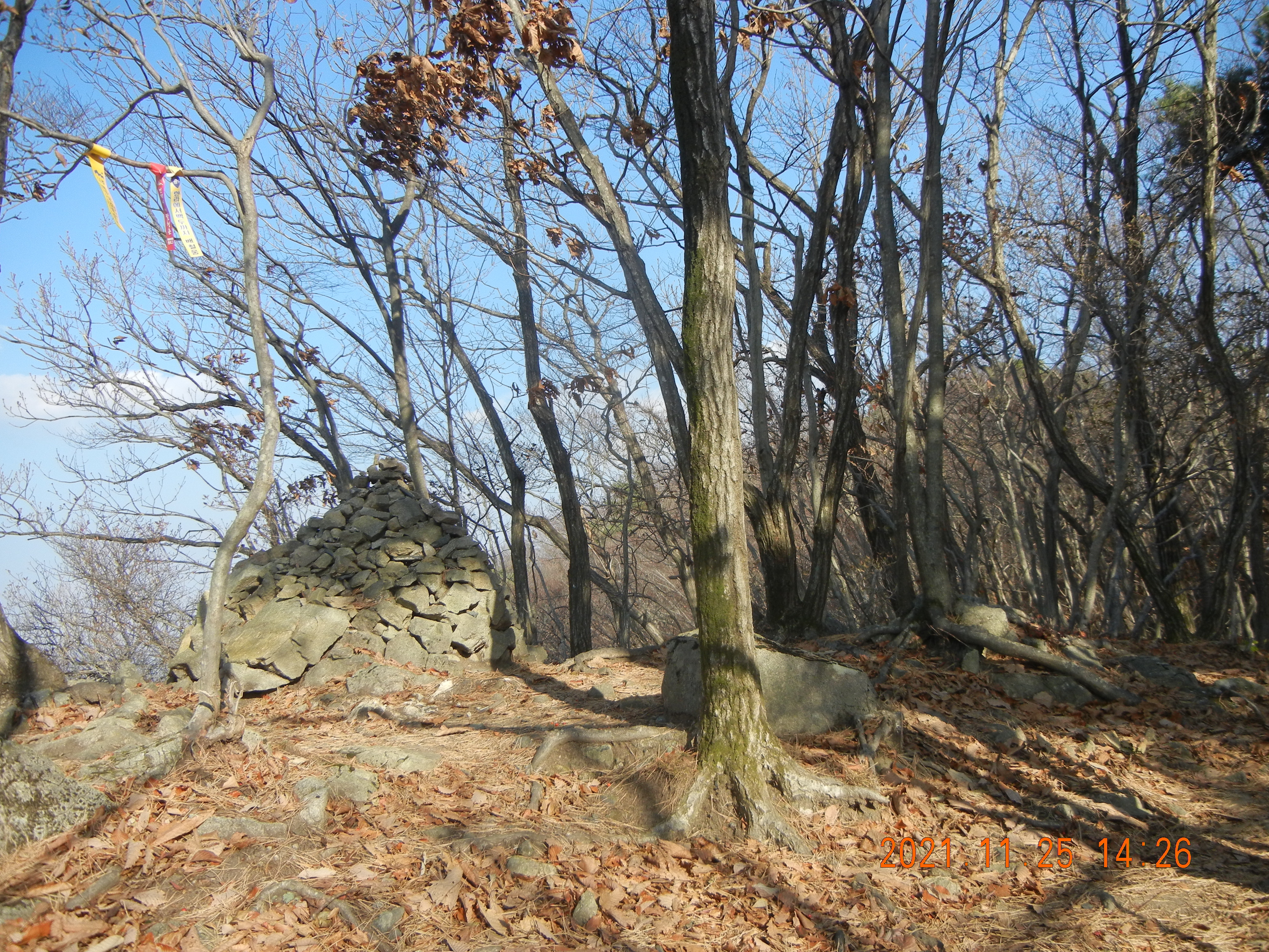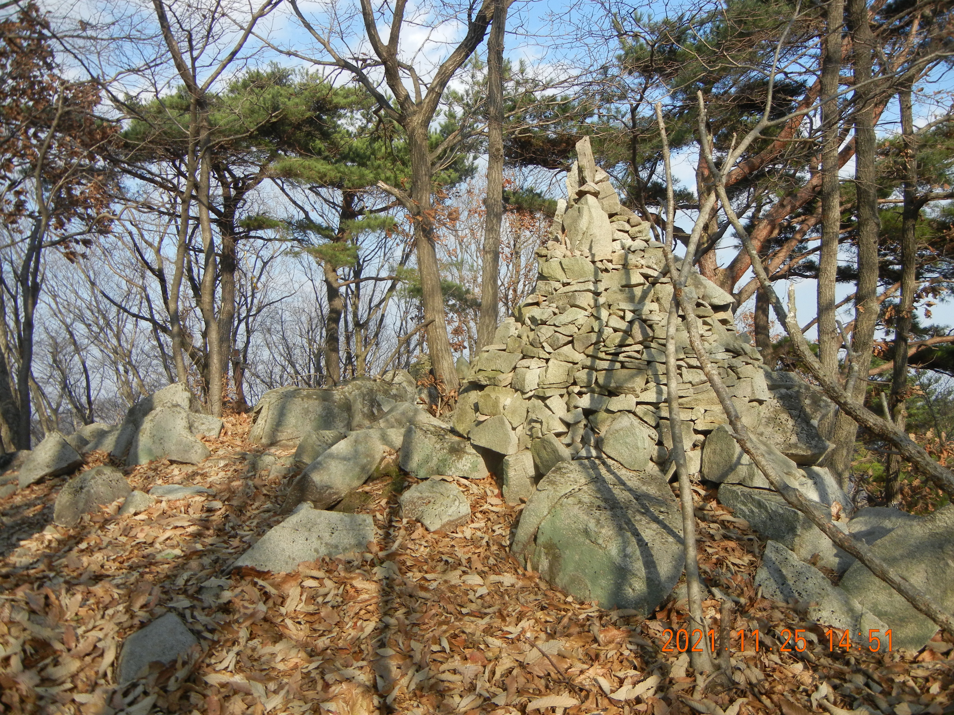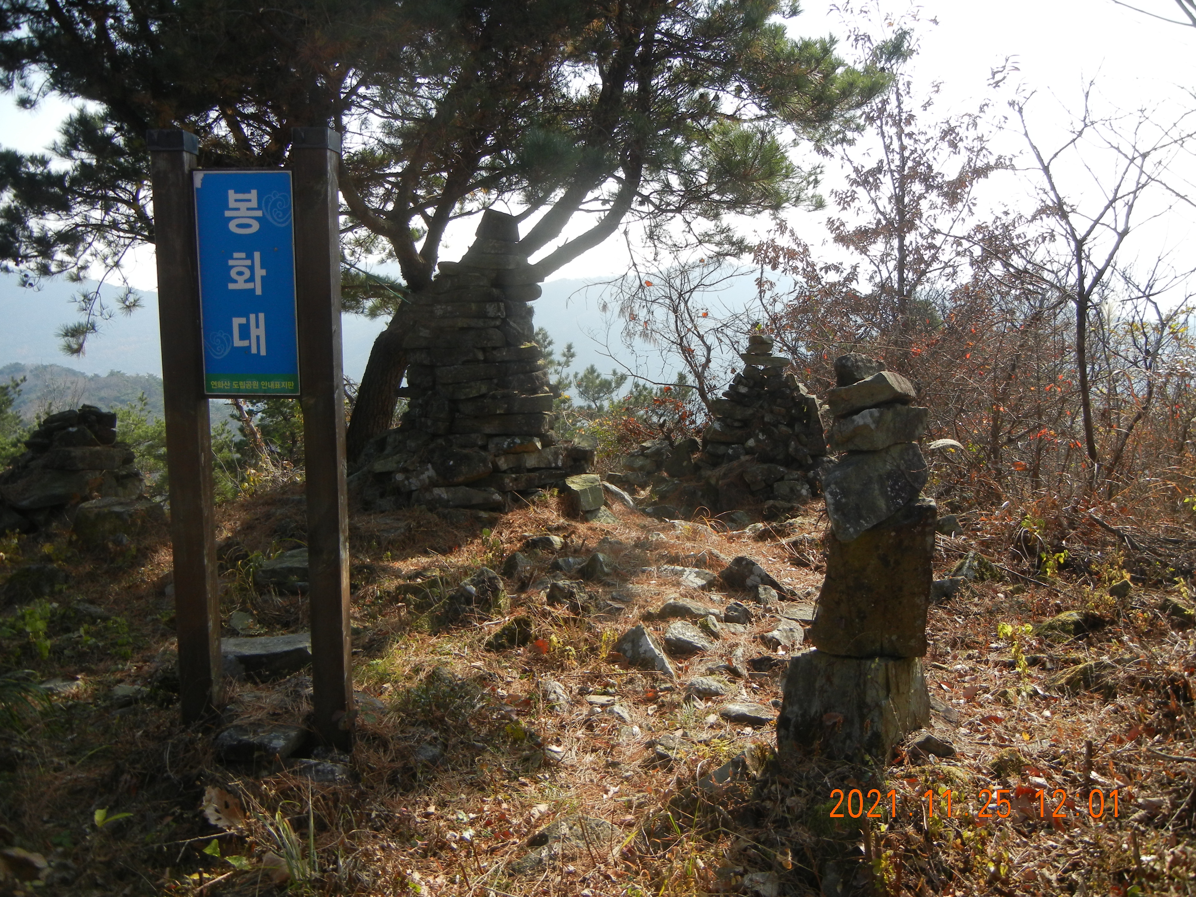 삼각점 연화봉 바로 아래엔 석축 무더기와 돌탑 그리고 봉화대라는 표지목. 제대로 봉화대가 복원돼야 할 듯.