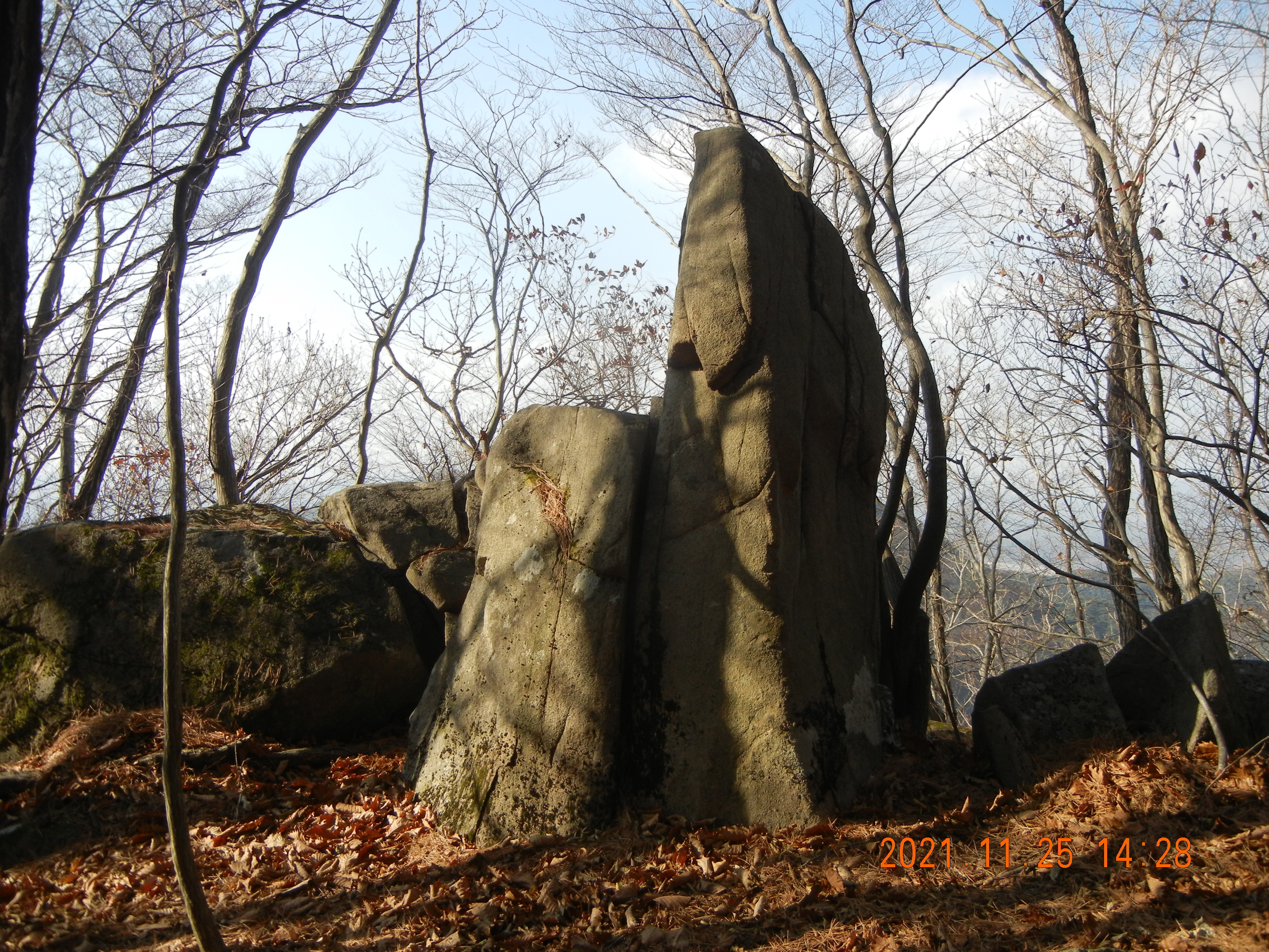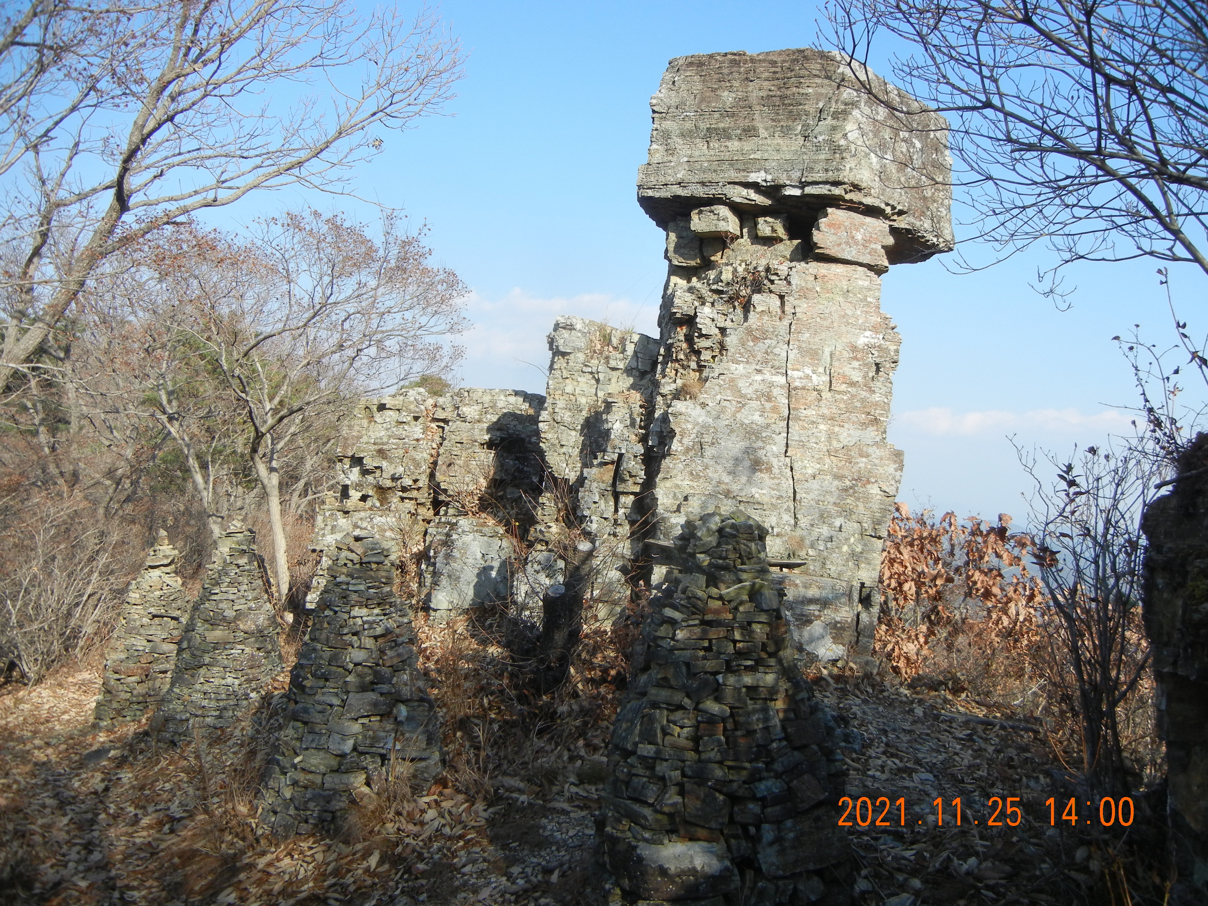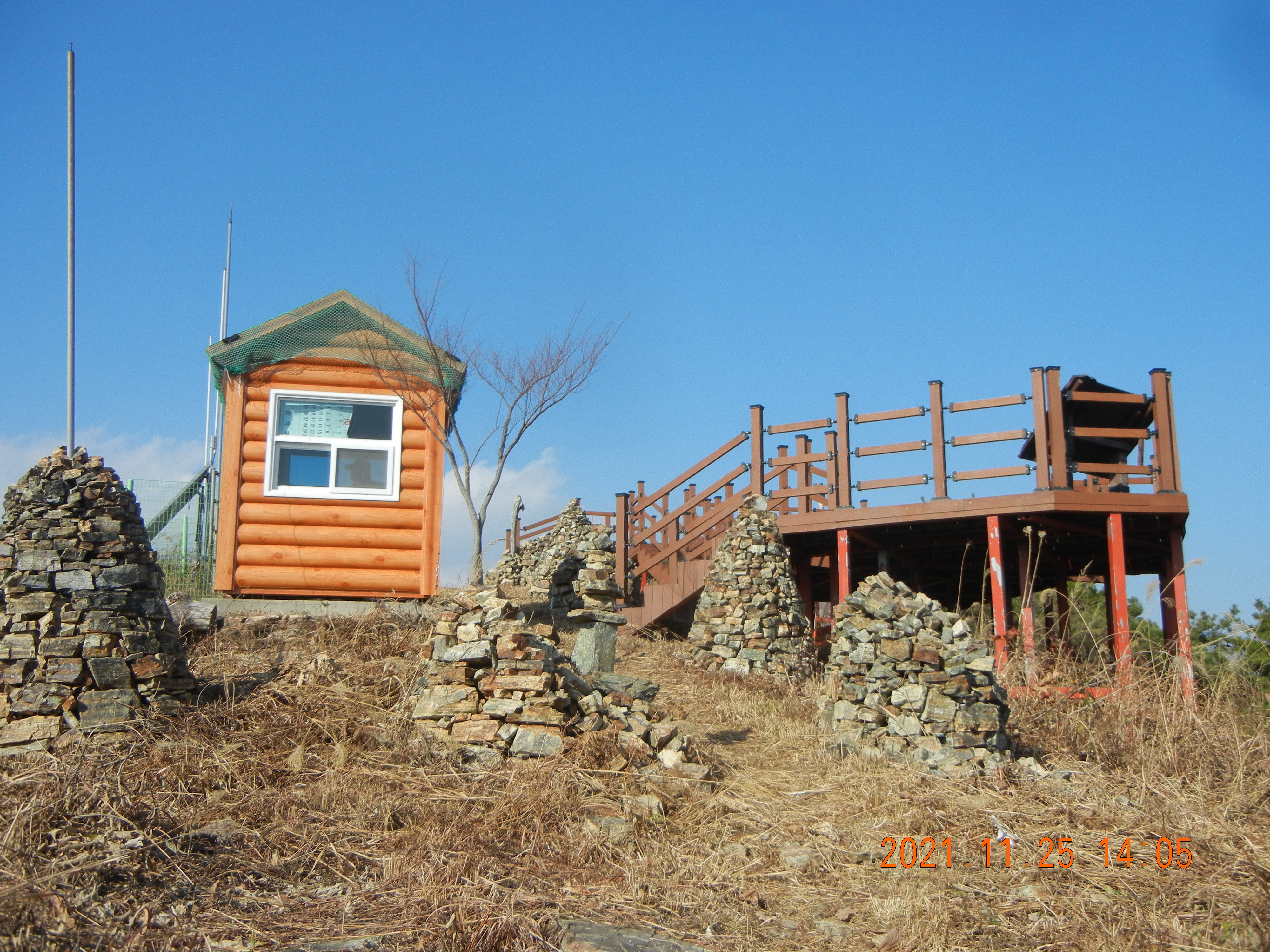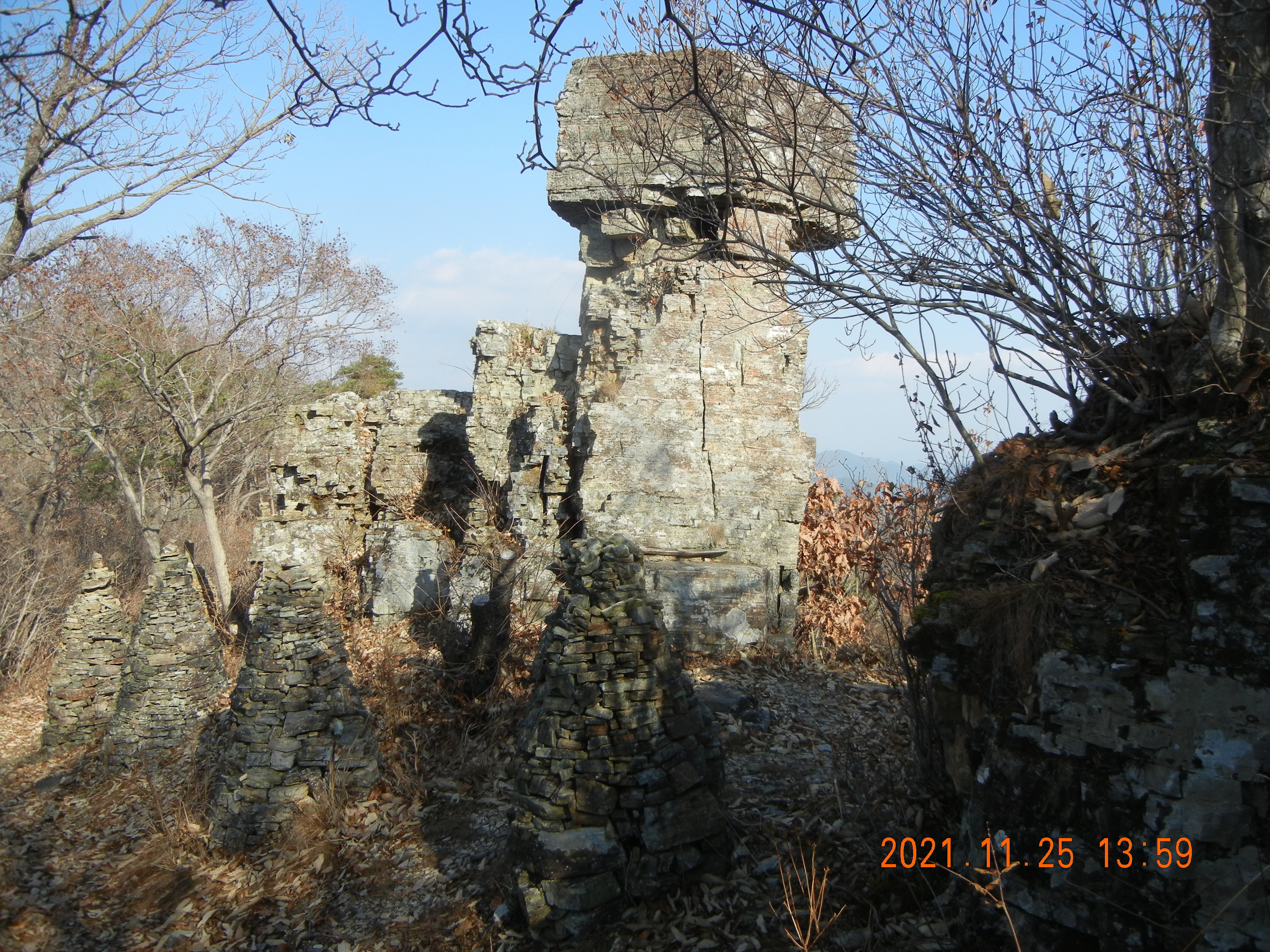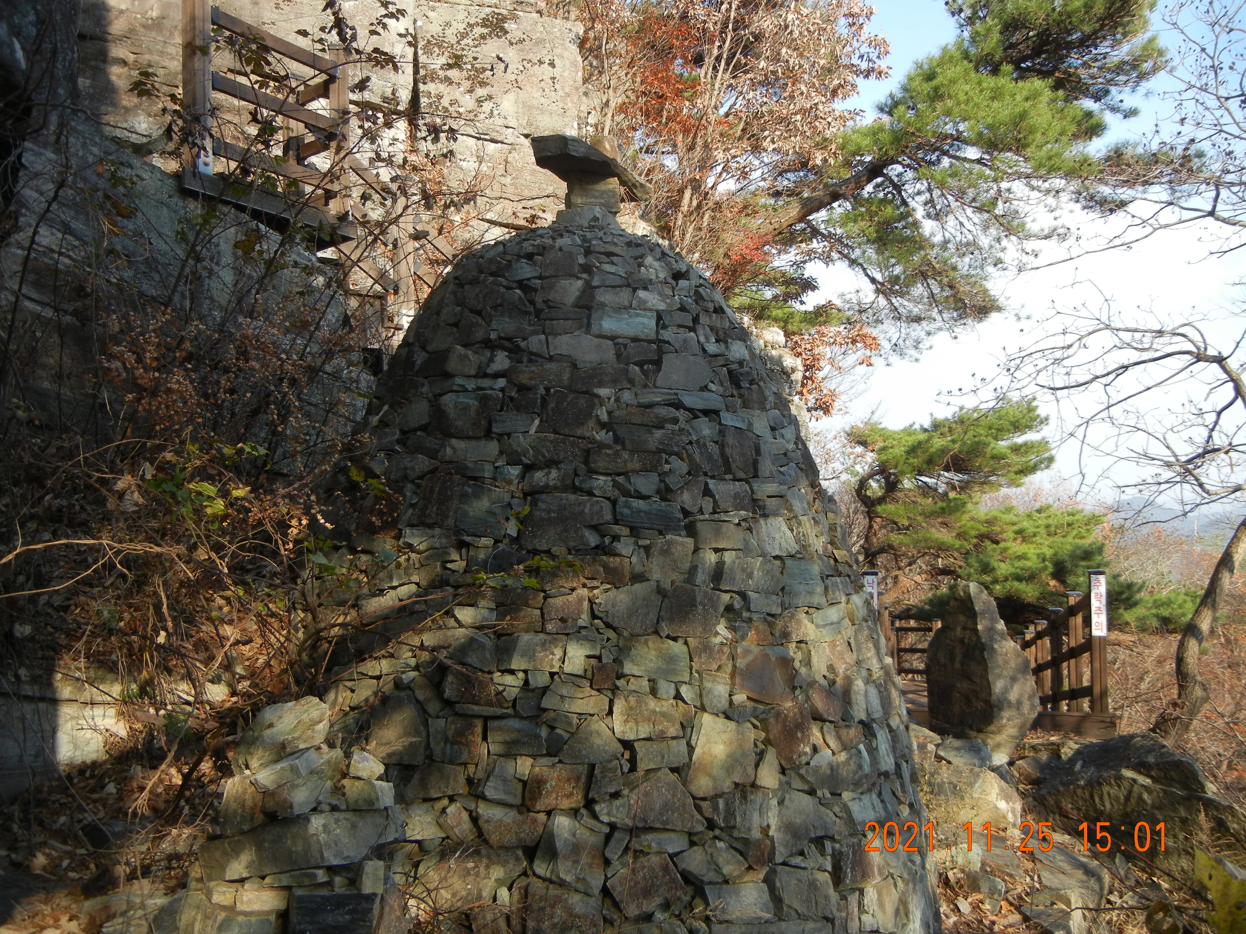 삼각점 연화봉 바로 아래엔 석축 무더기와 돌탑 그리고 봉화대라는 표지목. 제대로 봉화대가 복원돼야 할 듯.