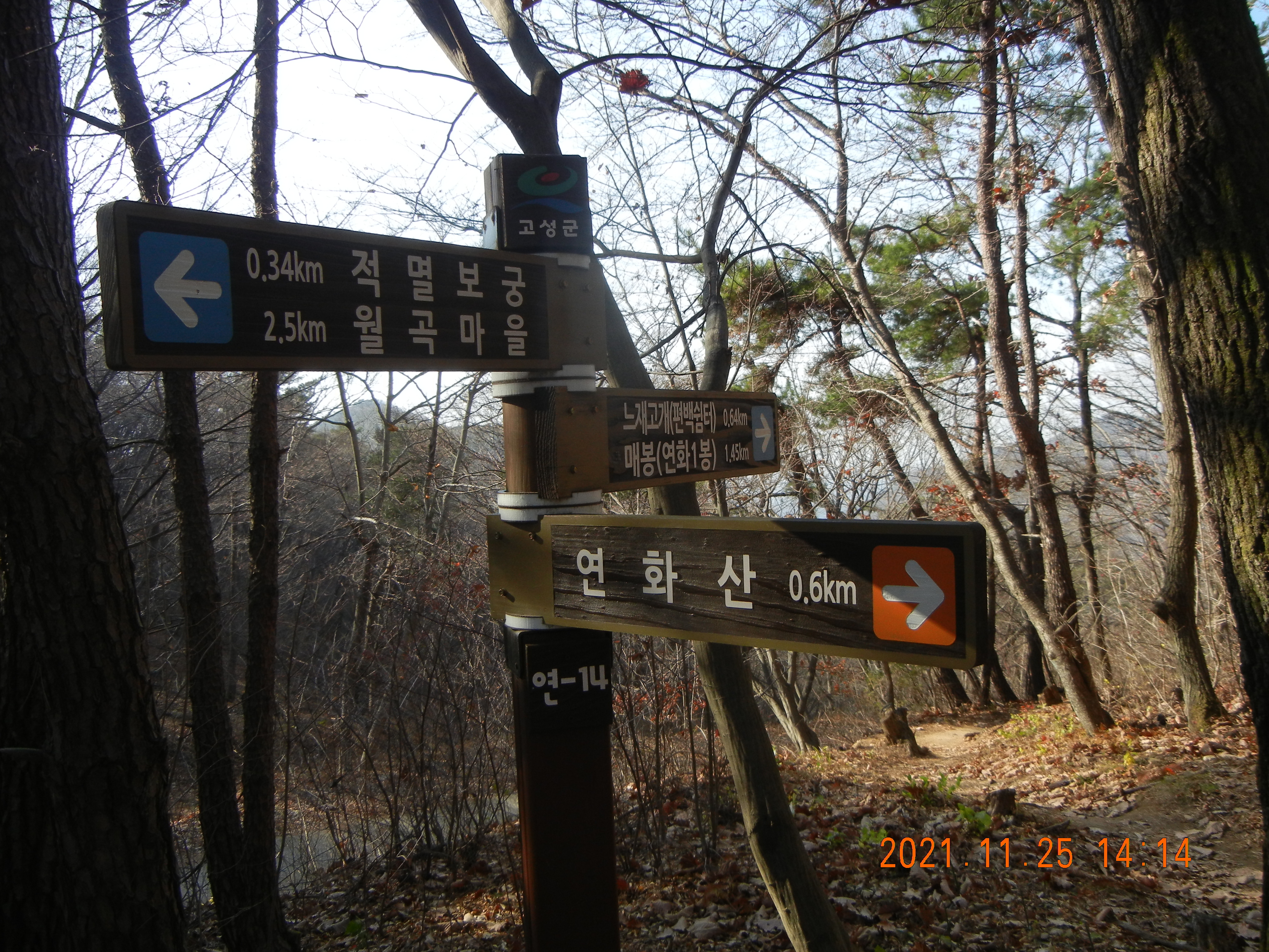 넓은 공터위에 정상표지판이 이정목에 걸린 연화2봉